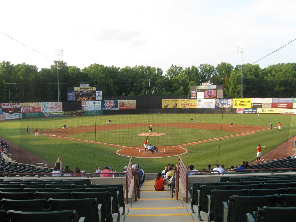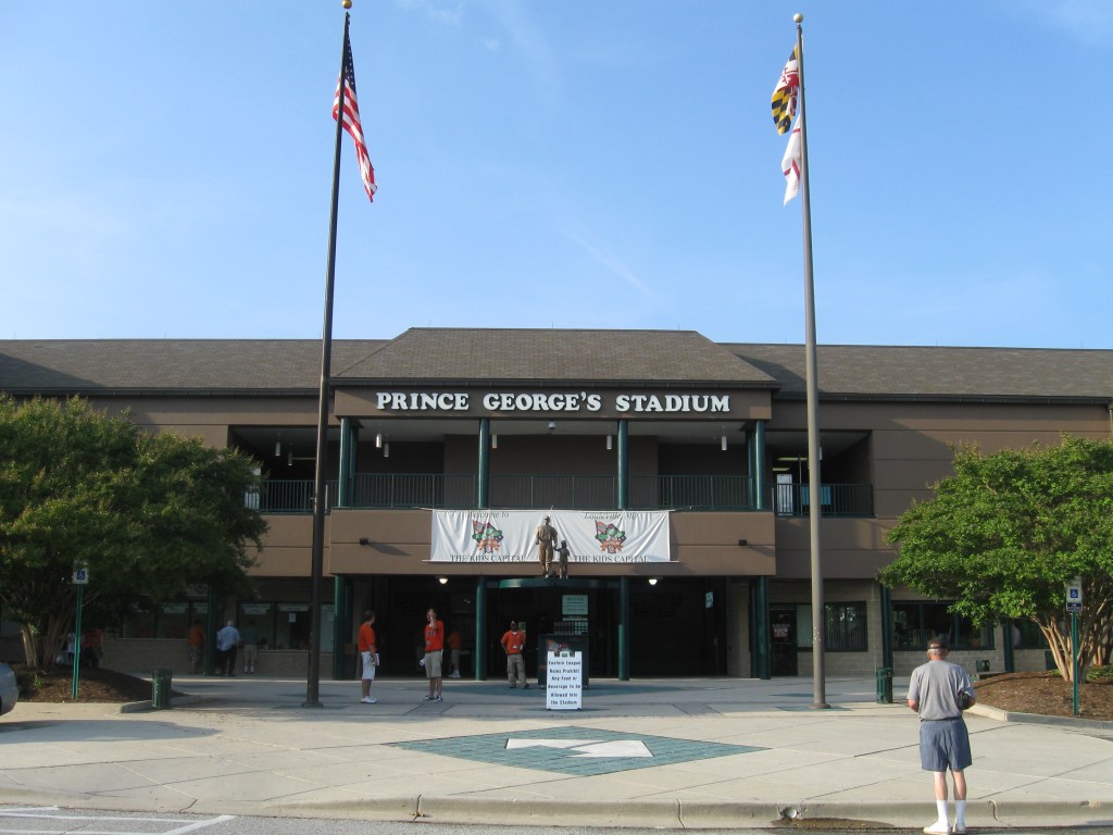 On our way back from a trip to Virginia, we stopped in Maryland to catch a Bowie Baysox game. Luckily, we accounted for the awful DC rush-hour traffic as the delays pushed us back an hour, but we still arrived at 6:30 PM. Bowie (population over 50,000) is located between Washington and Annapolis, in the Southern portion of Maryland. It is an old railway community that has become quite a big town, more like a small city. The baseball team is named the Baysox, despite the fact they are still a little ways from the Chesapeake Bay. They play in the Eastern League and have been the Baltimore Orioles’ farm team since 1993, but have no titles to show for it and they haven’t even been to a championship series despite many early year big names that played there. Prince George’s Stadium has been home since 1994 and it is a standard, uninteresting ballpark with the food quality and variety the only thing that stood out.