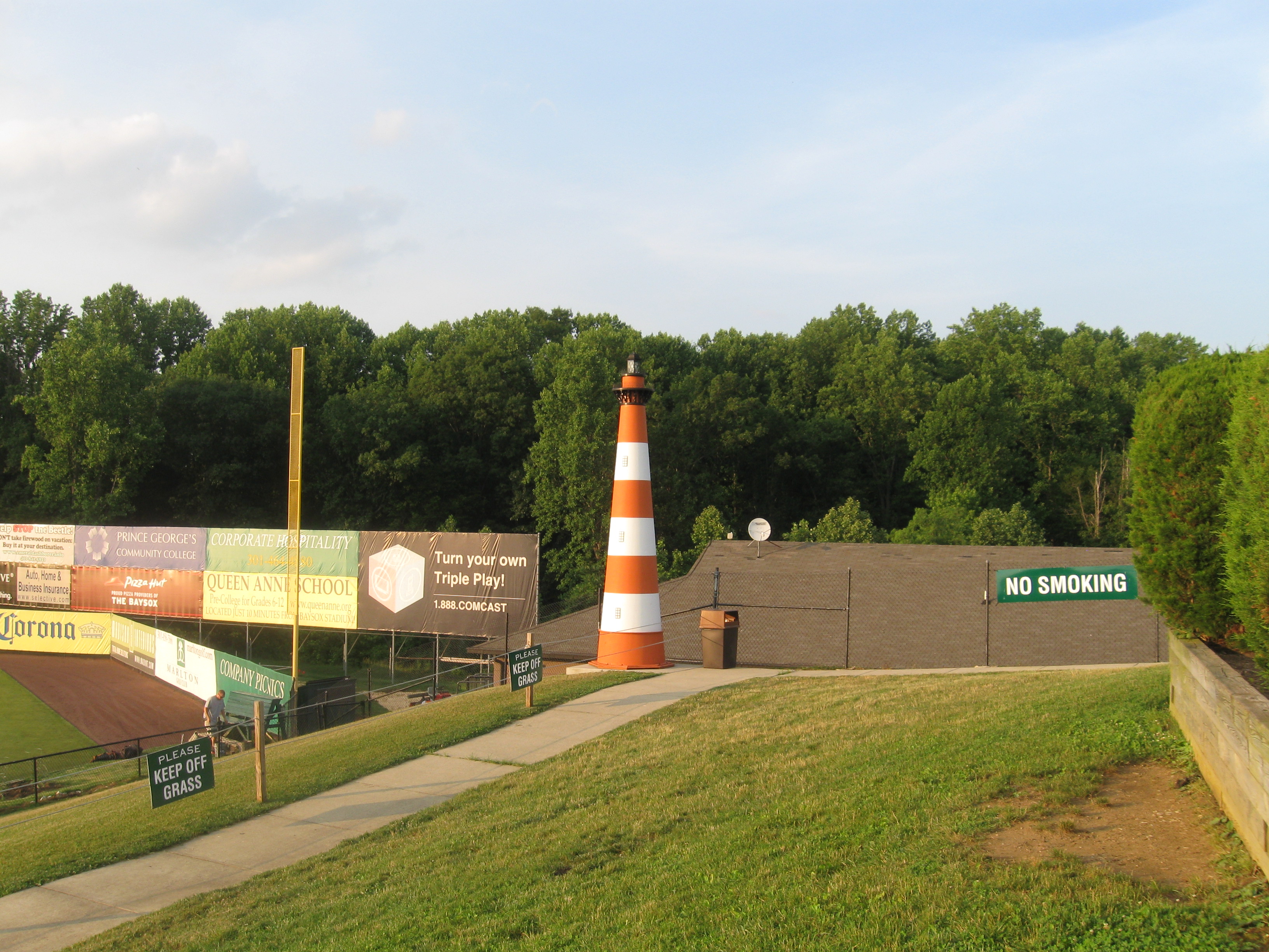 The stadium layout has a standard set-up with seats wrapping around to just beyond the infield. There is a walkway splitting the sections and it’s surprisingly deep with more seats than you would expect (capacity is 10,000). Unfortunately, several of the back sections are aluminum bleachers and rows seem to go up more horizontally than vertically, making you feel quite far from the field. It was not necessary to build it with this many seats. The rest of the stadium is green chairback. Suites are perched up over the concourse and in the back of the bowl behind home plate is the press box and the Diamond View Restaurant, which has both indoor and outdoor seating. Looking past the large ads over the outfield wall, an appealing view of trees greets fans. Grassy seating areas are found at the end of the seating bowl, while other features inside the stadium include a replica small lighthouse on the first base side and a carousel (all Orioles affiliates seem to have a carousel in their ballpark). Also, on the third base side is a large picnic area.