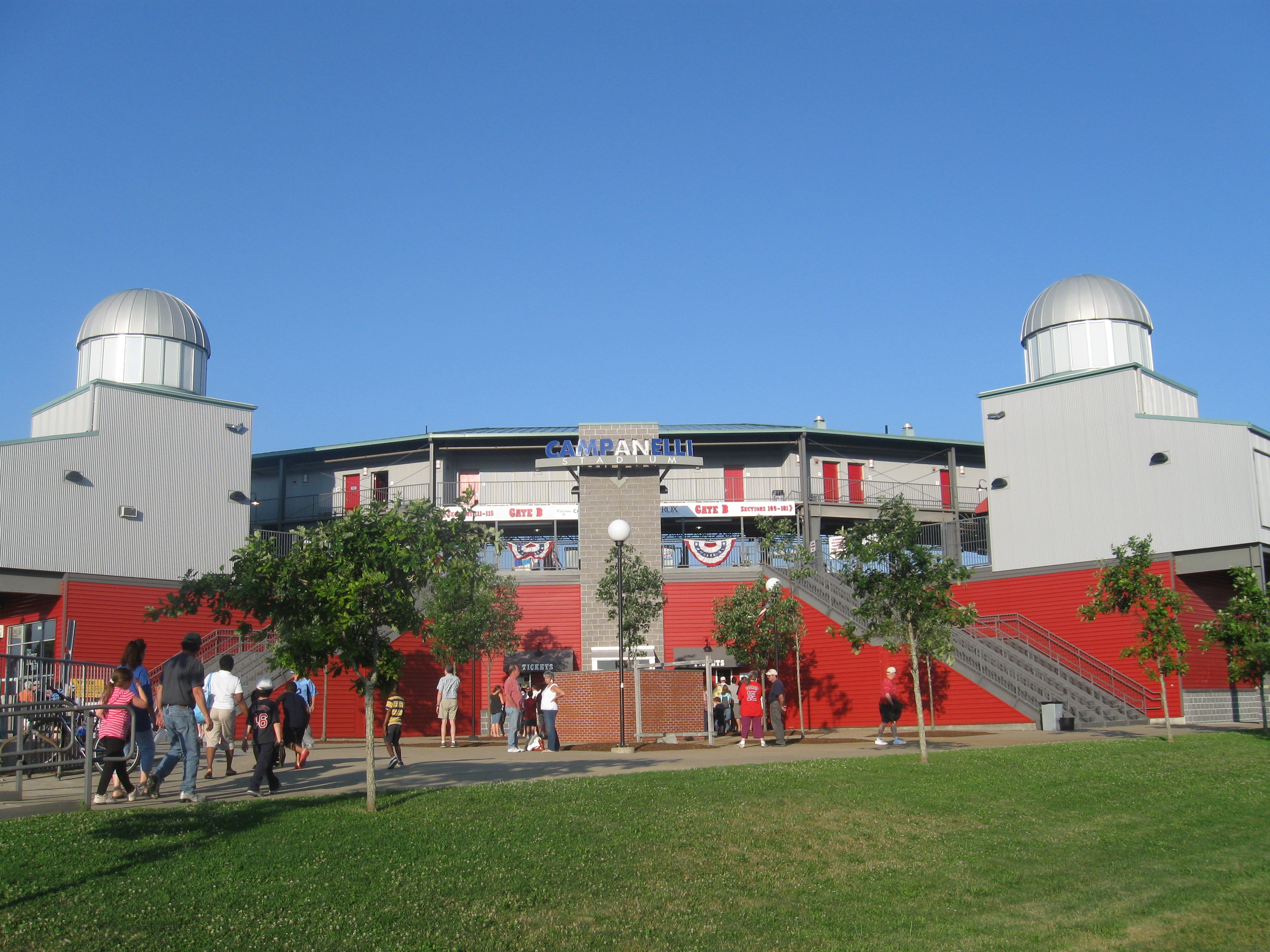 Oddly, the team store is located outside of the gates in front of the ballpark. Fans can’t access it inside the stadium, which is very strange. To accommodate, a few merchandise tables were selling some limited Rox items…..Not many times does the mascot makes me chuckle, but “KO” was actually entertaining, along with the on-field MC…..This is the first ballpark where I have seen cheerleaders (the Roxies) and it really does not fit in well with baseball…..The stadium is named after Alfred Campanelli, a very generous citizen of Brockton who denoted a lot of his time and money to charitable acts. That includes this ballpark.