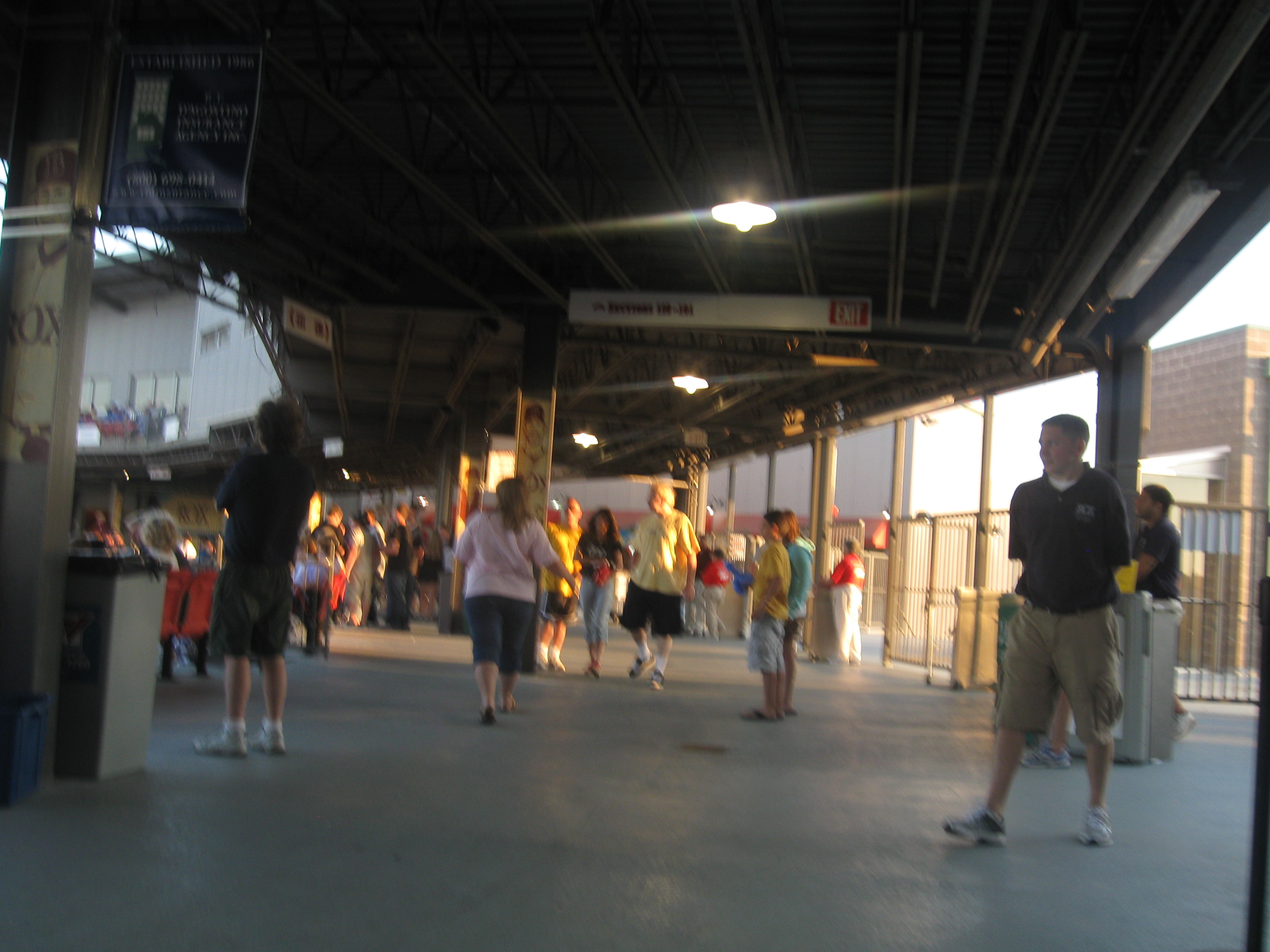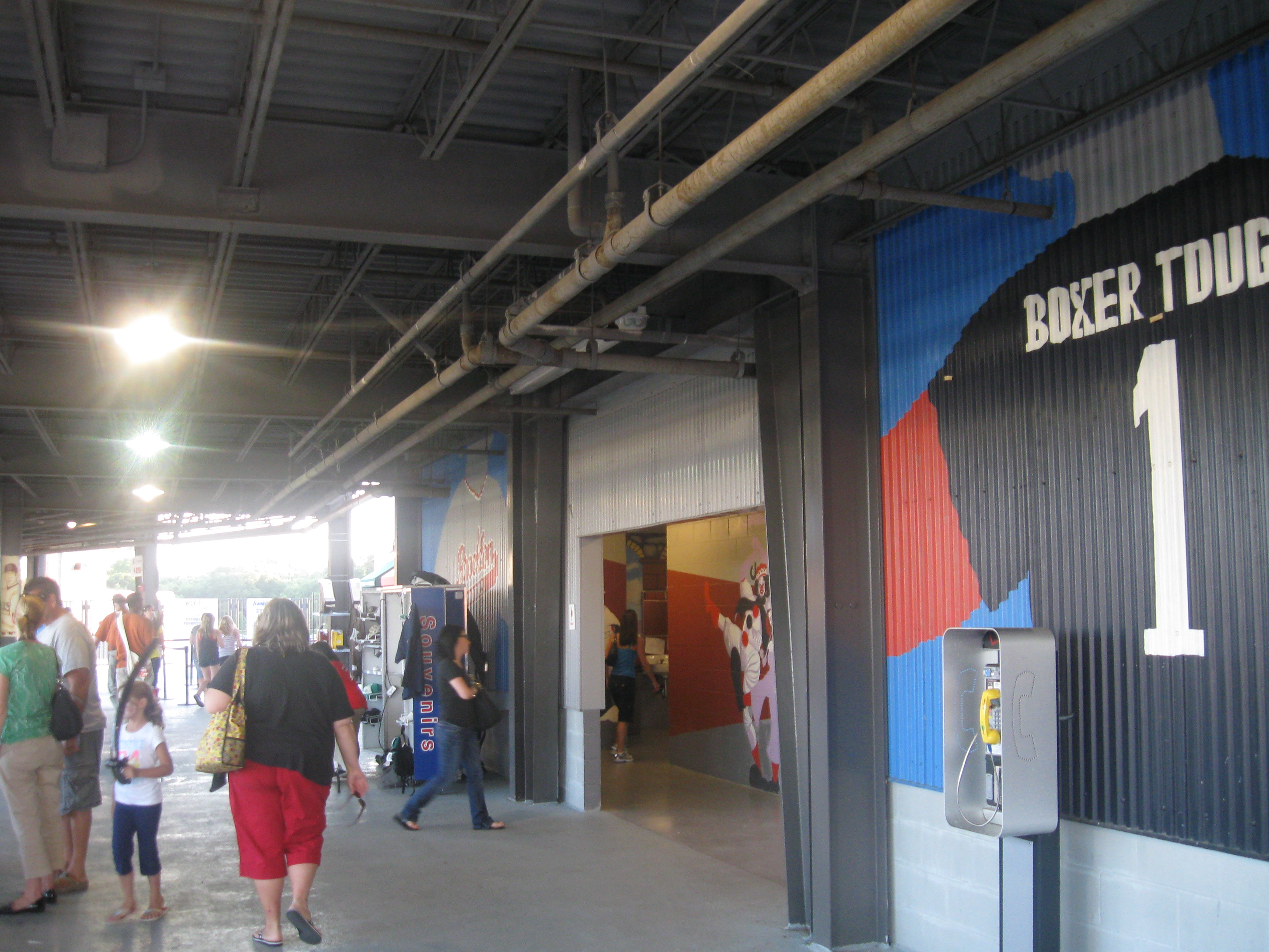 The entire concourse has a view of the playing field and spacing seemed adequate. It was nice not to have the back of a press box in the way behind home plate, like it is at many other Independent League ballparks in the Northeast. Neat touches around the concourse were the artist renderings of Rox players drawn on the support beams. Not so neat were the renderings of clowns on the walls of the bathroom entrance. Creepy. The concourse just goes behind the infield on the first base side and there’s some open congregation and kids play in this section. Nothing goes into the outfield. Food and drink options were fine with several offerings, though the lone unique item seen was kielbasa.