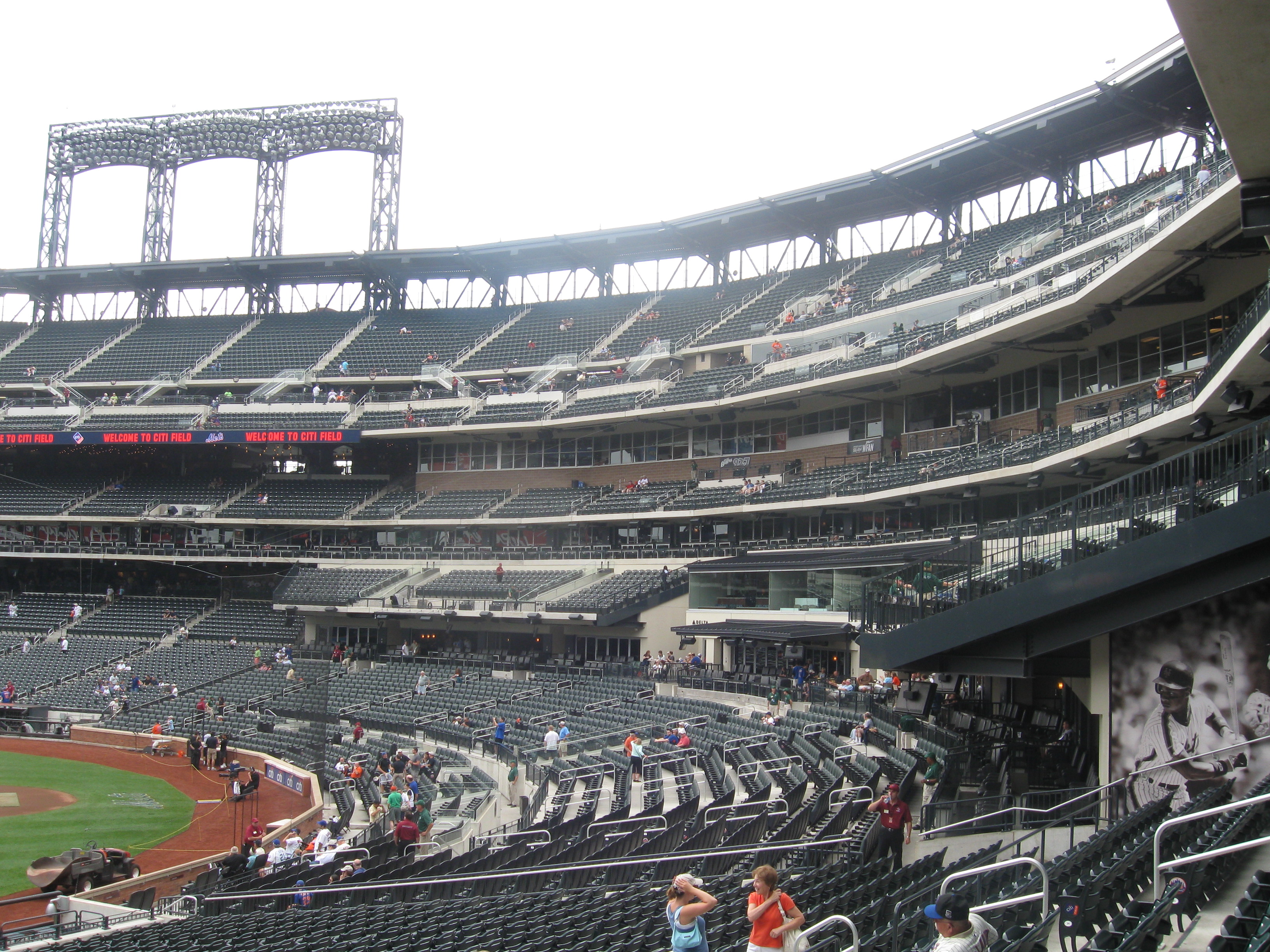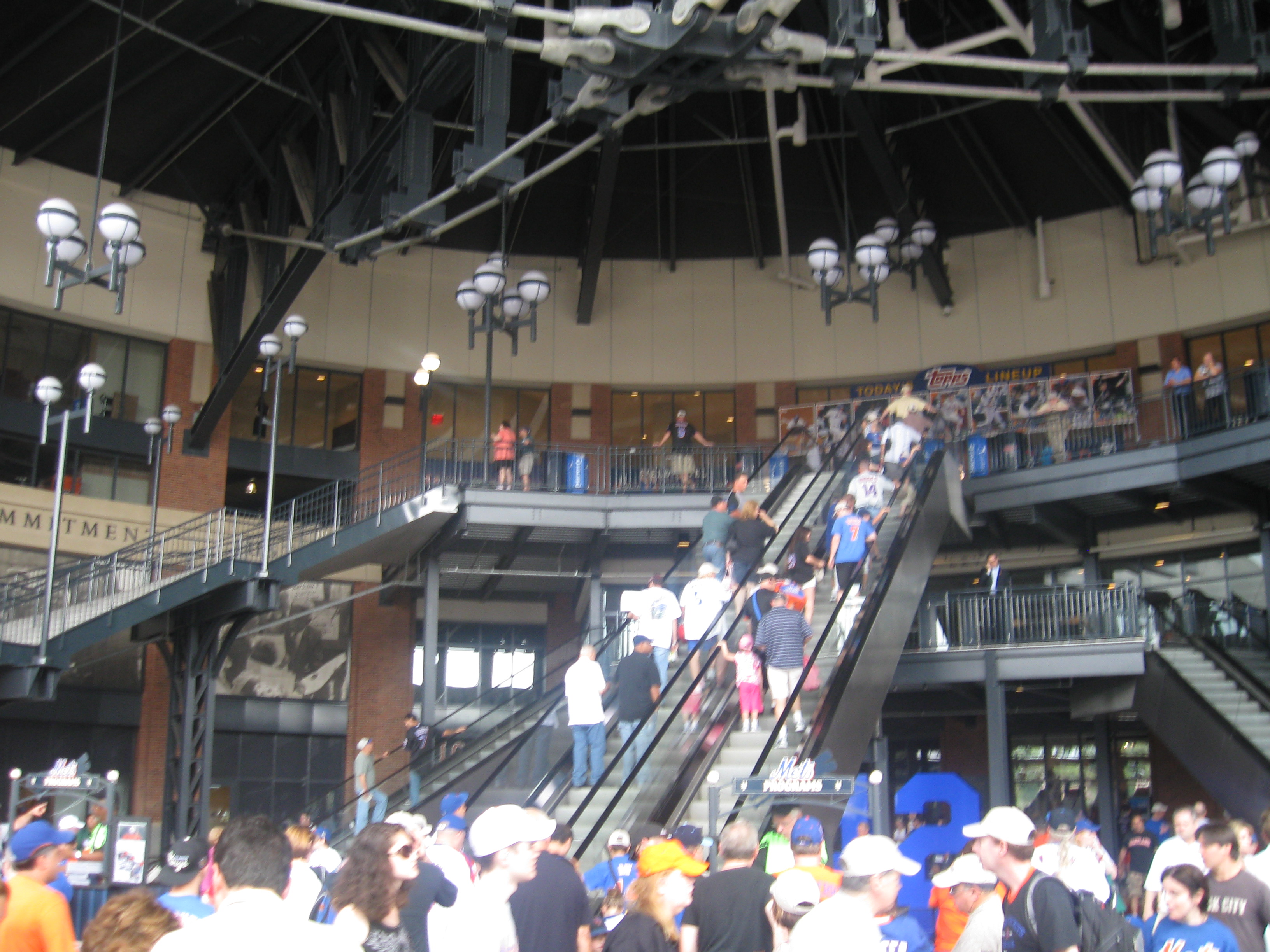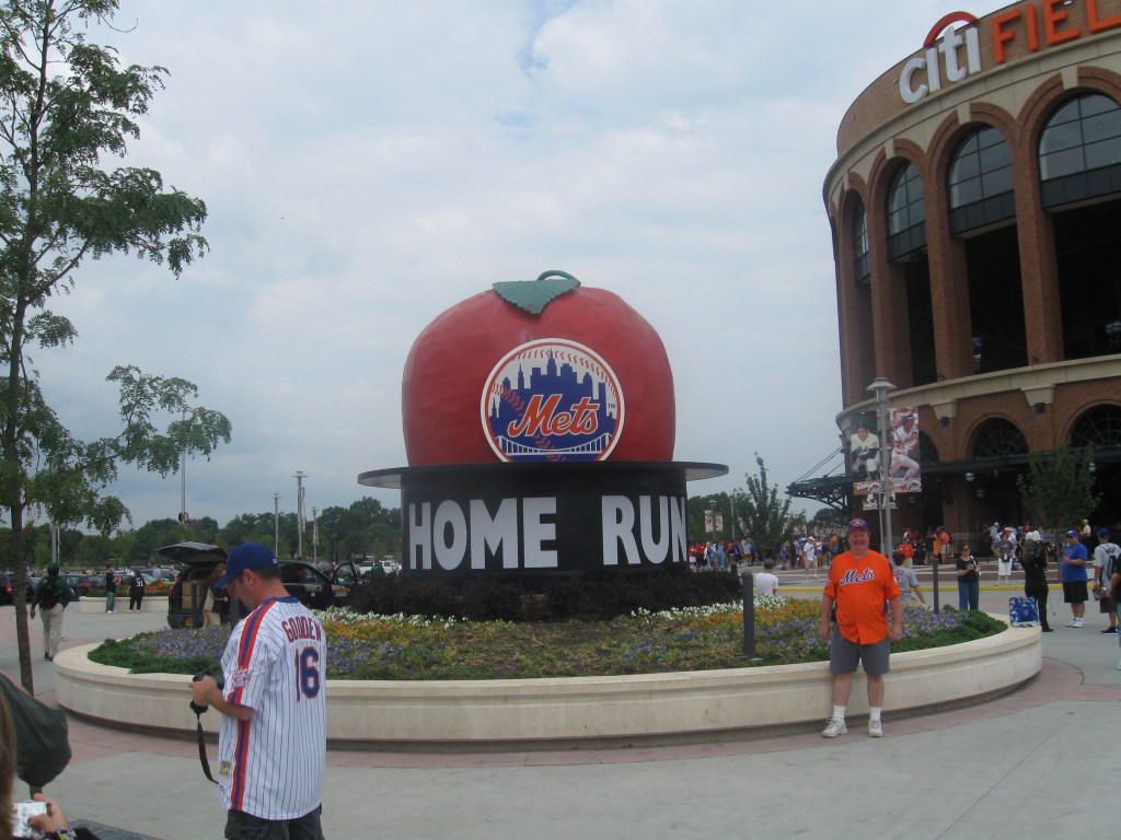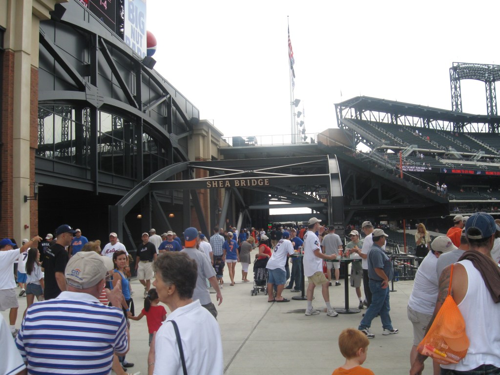 In 2009, the New York Mets moved from their aging, but mostly loved home of Shea Stadium to brand new Citi Field, which was built in the parking lot across from Shea. We visited the new stadium on a rare, pleasant summer afternoon as an overcast sky kept temperatures comfortably in the low 80s. The Mets started in 1962 to give the city a National League team after the Giants and Dodgers left town. It’s been an interesting 40+ years for the franchise with some historic players and teams, like the two championship squads in 1969 and 1986. Since my last visit (at Shea in 2004), New York became competitive again after a brief down period. Unfortunately, despite overall success when looking at their record, it was nothing but bitter disappointment as they lost Game 7 of the NLCS in the 9th during the ’06 season, while the next two years produced a historic division collapse and a loss in their last game at Shea that eliminated them from going to the postseason. The ballpark has some great features, but there are also several flaws. Namely that the stadium honors a different team and there are way too many high-class seats. Many Mets fans understandably and justifiably don’t like that their ballpark pays tribute to the Brooklyn Dodgers (which has no association with the Mets). Steps were at least taken to improve and fix that.