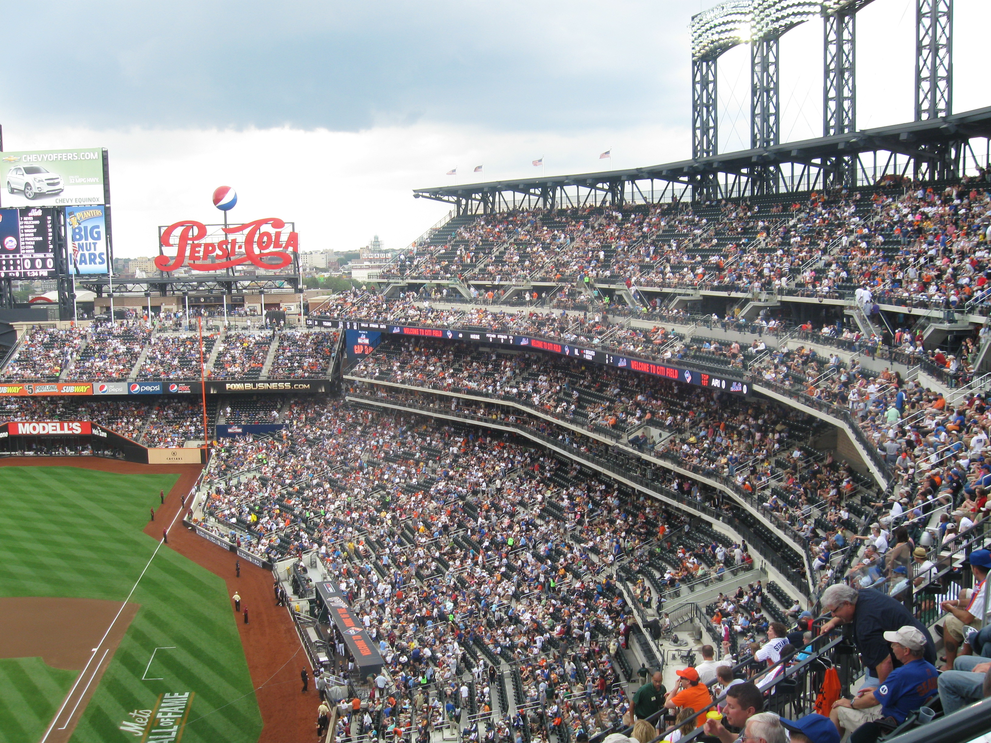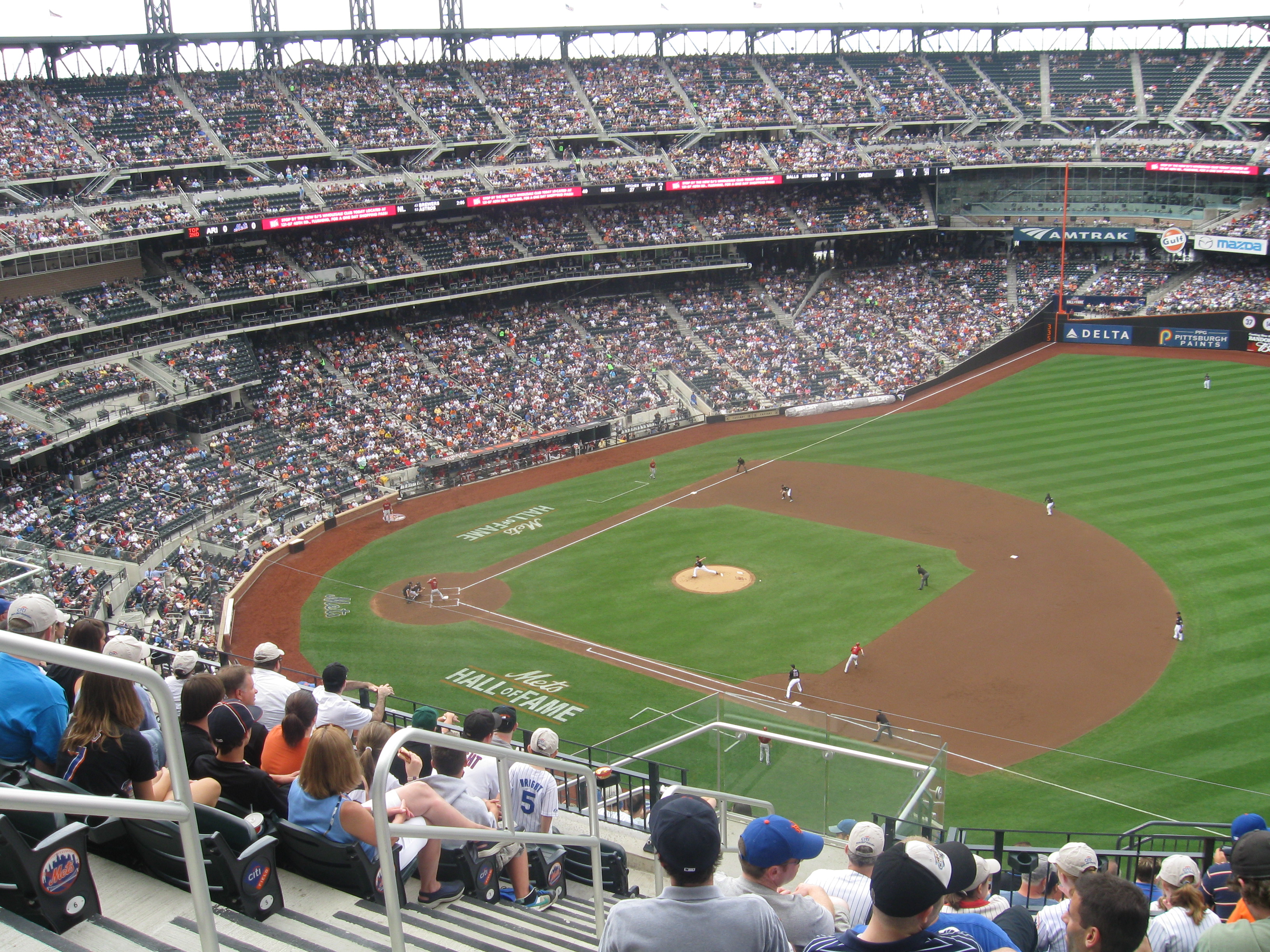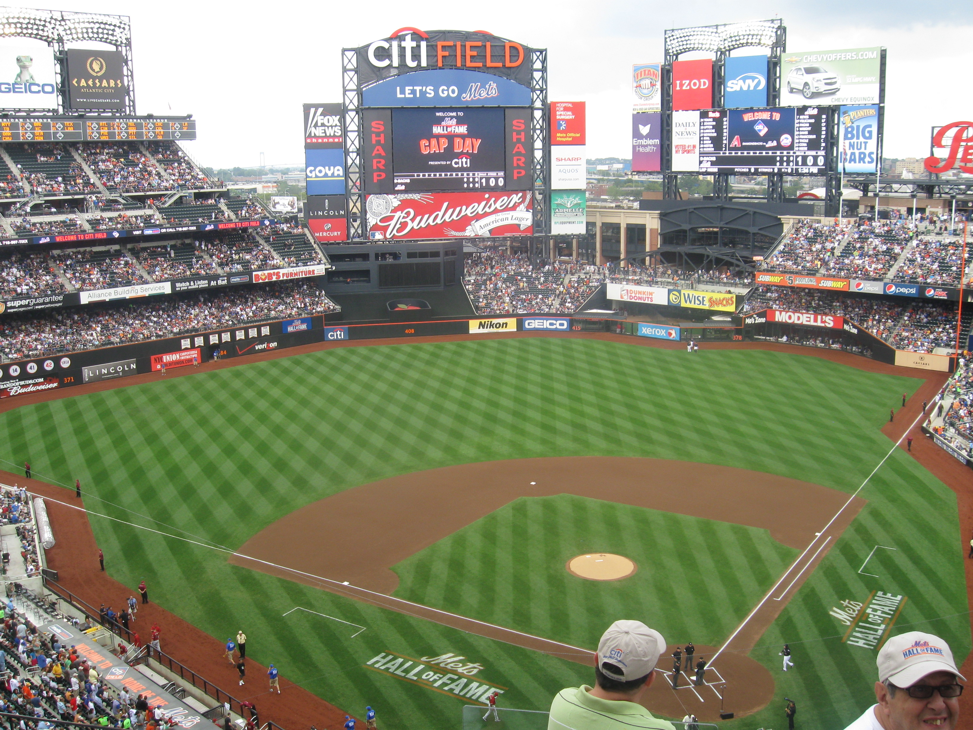 The scoreboard at Citi Field is nice and all, of course an upgrade from Shea, but I actually liked the other one better. The main board here is in Center, with crystal-clear HD video. It’s sandwiched by ads, but at the top it says “Let’s Go Mets” with the Citi Field logo above it. There’s another slightly smaller board in right with most of the statistics. I did find game replays weren’t too common. The board also seems to overpower the outfield, which is better than the view below. An out-of-town scoreboard is unusually on the roof in left and there are ribbon-boards between seating decks.