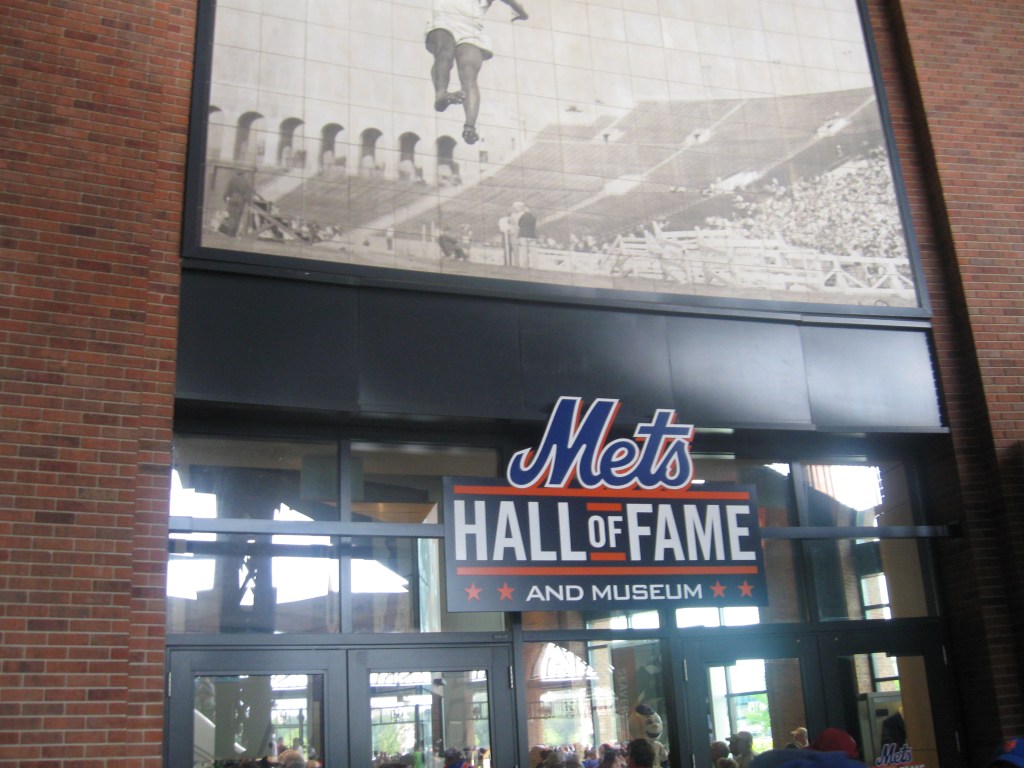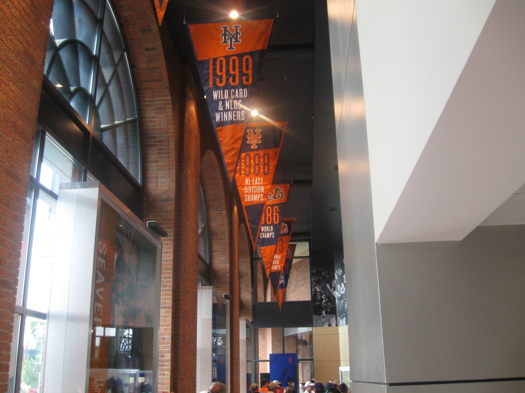 The organization took a lot of heat their first year at Citi Field for not honoring the Mets history enough (almost paying more attention to the Brooklyn Dodgers). Even though, stadium colors aren’t as team-oriented as Shea, the Mets listened and took strides in 2010 to fix the lack of displays and it worked. Outside of the ballpark is a highlight and it starts with the old Mets Home Run Apple displayed in front of the stadium. Perfect picture opportunity there. Along with images of past Mets lining the sides of the exterior, there is also a nice “Fanwalk” which has bricks bought by fans and displays describing historic Mets moments. My favorite is the Robin Ventura home run turned single to beat the Braves on my birthday in 1999. By far the highlight of the honors is in the rotunda, where the Mets Hall of Fame and Museum is. It truly is both a Hall of Fame and Museum with a ton of displays, exhibits and features. Inside the ballpark, retired numbers are on the left field wall (#37 Stengel, #14 Hodges, #41 Seaver and Shea), along with banners for Division, League and World Series crowns. In right field, there are two flags that fly with World Series Championship honors.