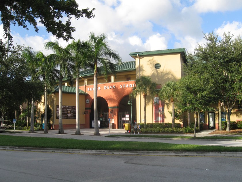 Jupiter is located on the southeast coast of Florida, situated near a section of the state called the Gold Coast. To the North, the landscape gets more open and less populated, while the big shore towns of Palm Beach and Fort Lauderdale lie to the South. We were on vacation in the state and made a stop in Jupiter to see the Single-A Hammerheads. Roger Dean Stadium is the home of the Hammerheads and the stadium was built in 1998. It is the only facility to be home to two teams in the same league (the Palm Beach Cardinals also play at Roger Dean). In addition, the stadium houses spring training for the Marlins and Cardinals. So far, the Jupiter squad has not found much success as they’ve yet to win an FSL championship and attendance has been low.