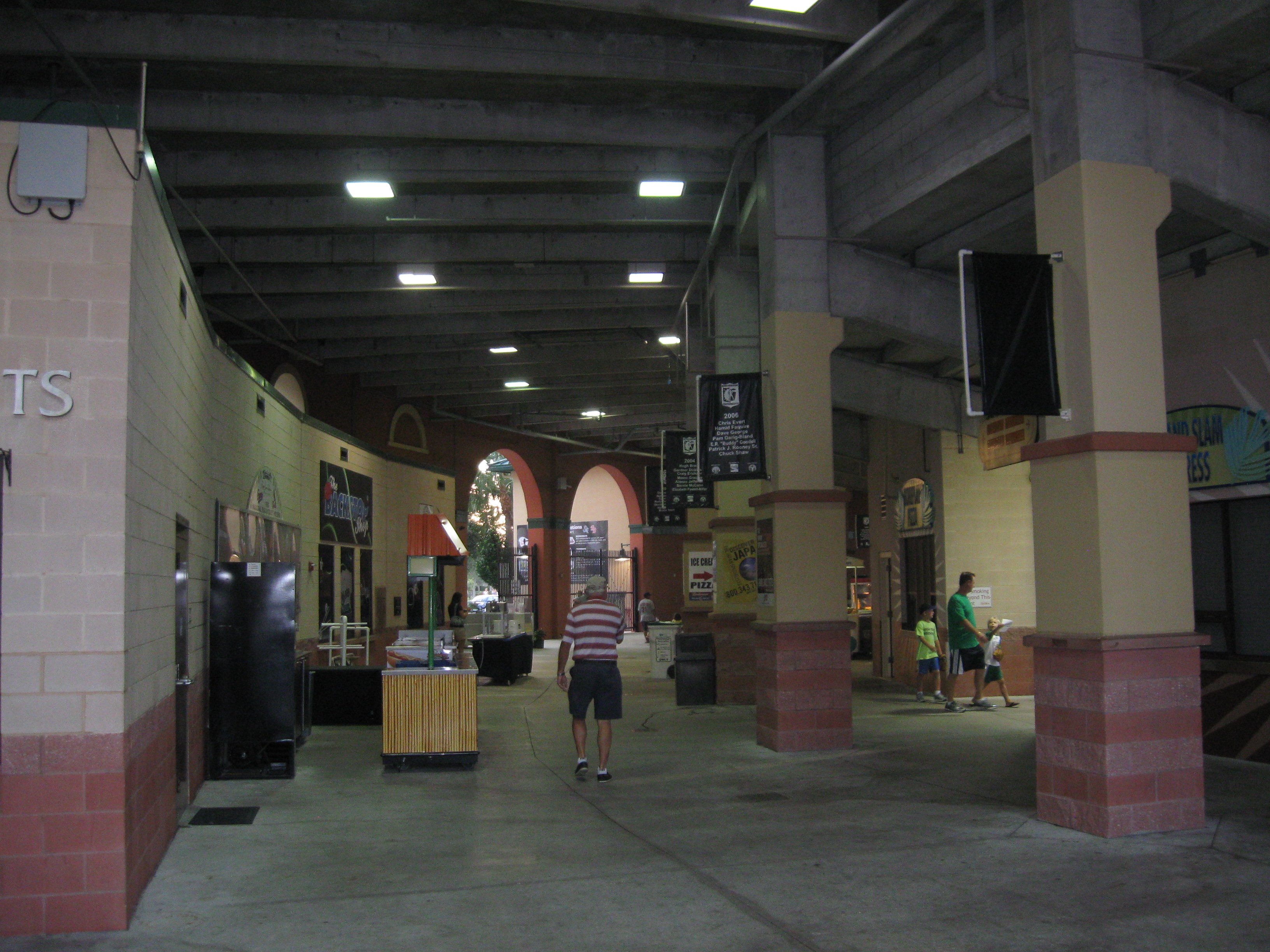 Most of the concourse is enclosed and it is somewhat roomy, with the exception being several square support columns that are placed every five feet or so in the middle. The soothing Florida coloring is mostly retained in here with walls decorated in beige and peach. There is an average sized team store within the enclosed section. The concourse does head out into the open air at the ends, but there isn’t much to speak of as the field is still obstructed by seating until you get near the end.