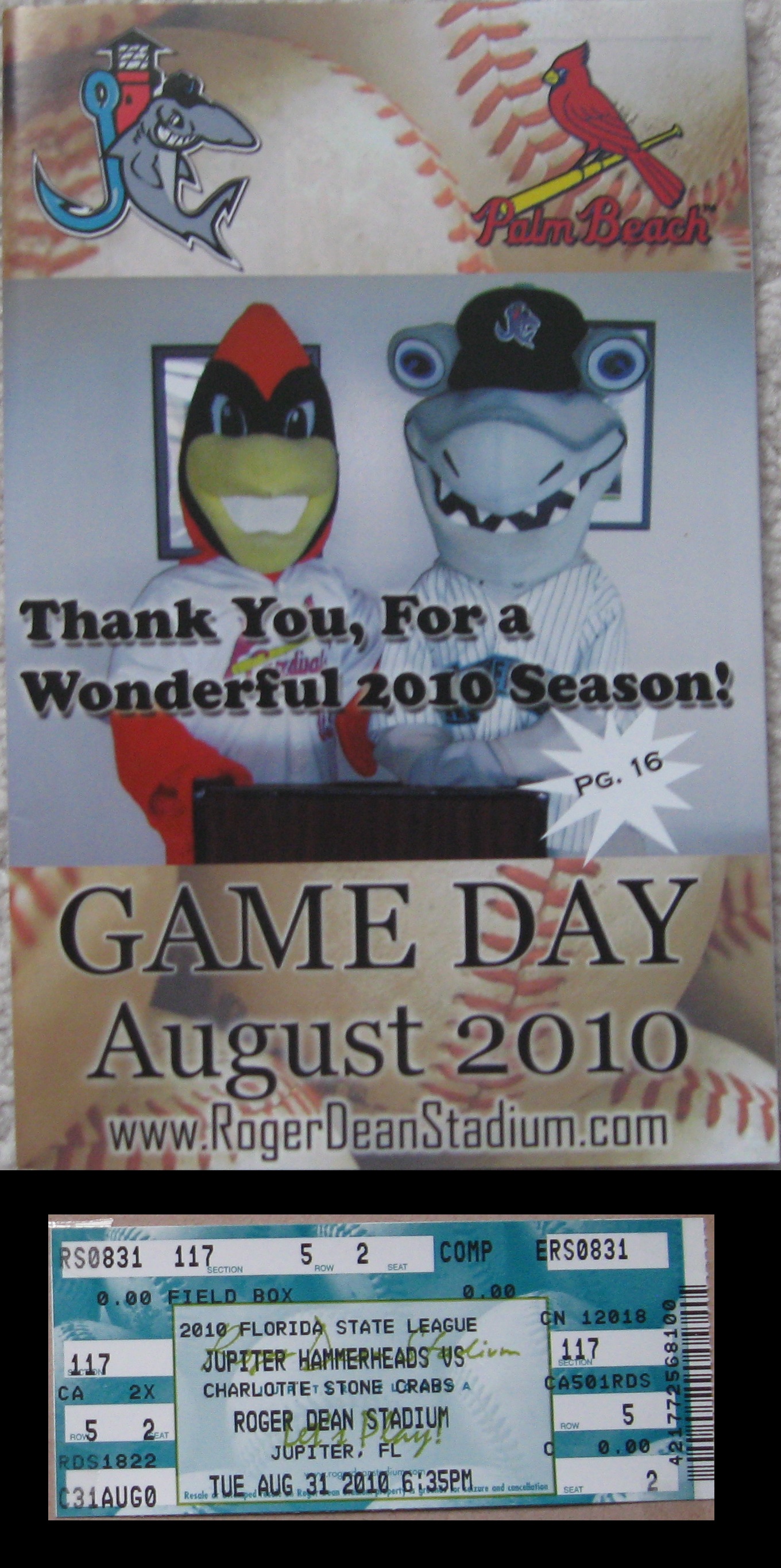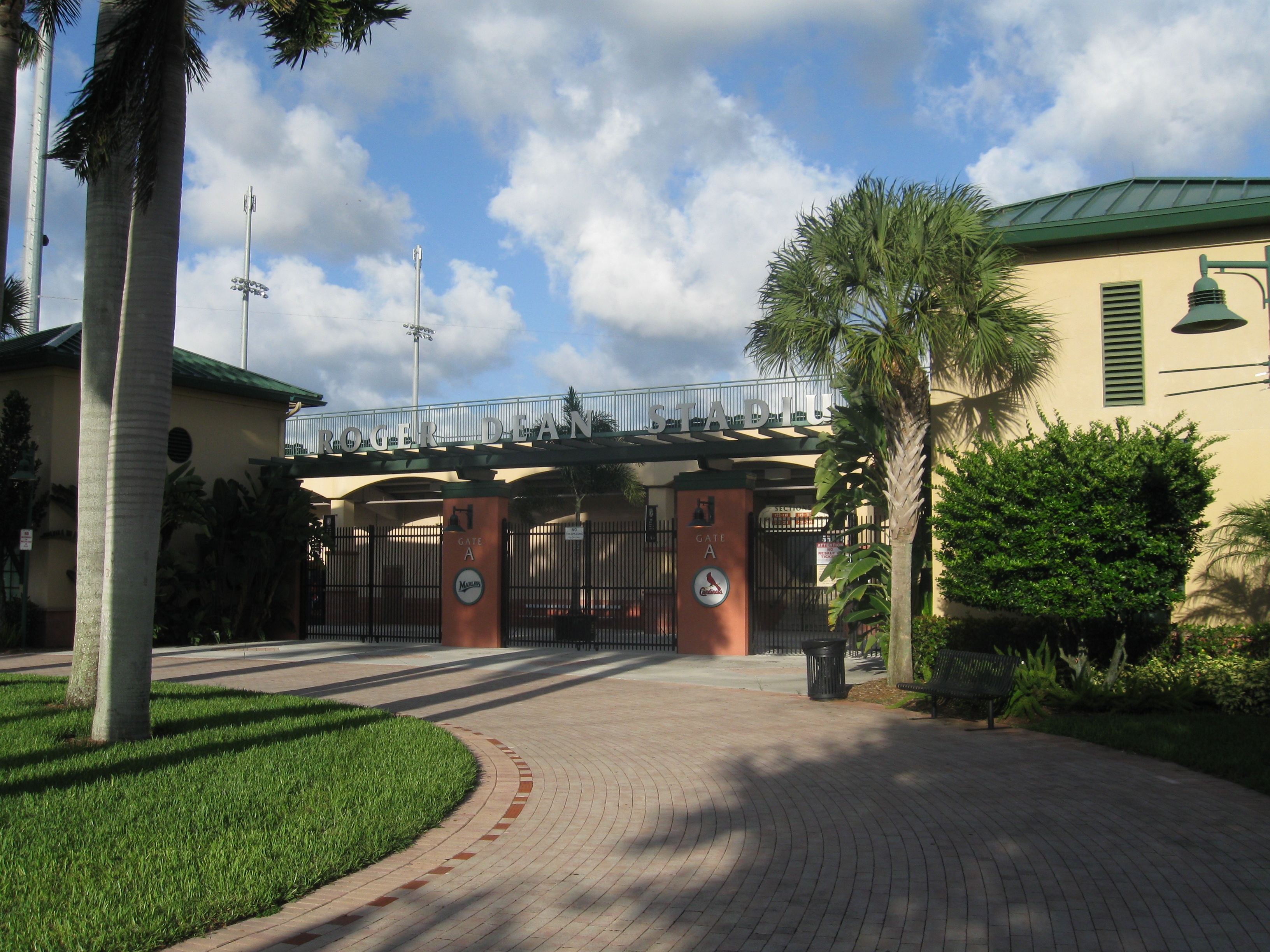 Jupiter is located on the southeast coast of Florida, situated near a section of the state called the Gold Coast. To the North, the landscape gets more open and less populated, while the big shore towns of Palm Beach and Fort Lauderdale lie to the South. We were on vacation in the state and made a stop in Jupiter to see the Single-A Hammerheads. Roger Dean Stadium is the home of the Hammerheads and the stadium was built in 1998. It is the only facility to be home to two teams in the same league (the Palm Beach Cardinals also play at Roger Dean). In addition, the stadium houses spring training for the Marlins and Cardinals. So far, the Jupiter squad has not found much success as they’ve yet to win an FSL championship and attendance has been low.