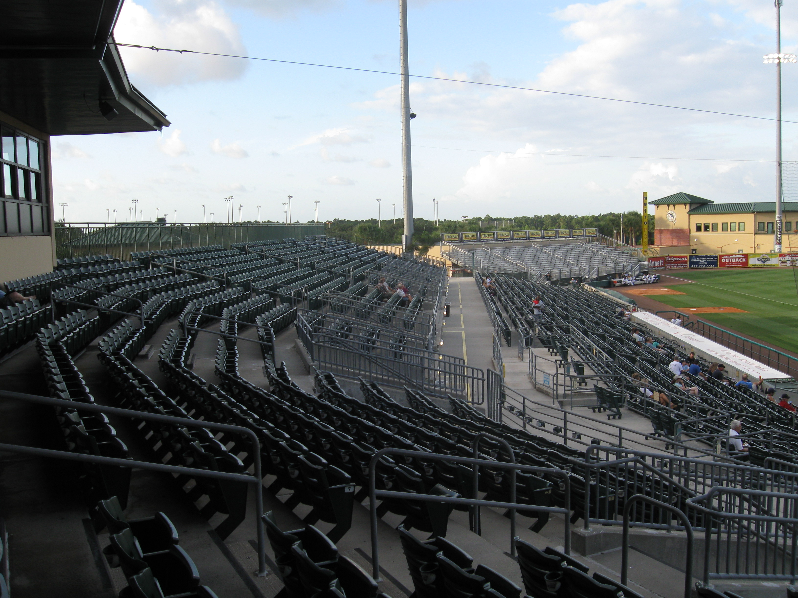 While watching the game, the design of the outfield light fixtures struck me as being different. The two rows of lights were not at the top of the pole, but instead 3/4ths of the way up the lightpole. It appears that this is a retrofitted design, because Hurricane Frances caused damage to the lights in 2004…..Since it is a multi-team spring training facility, there are a whopping 13 other baseball fields in the complex.