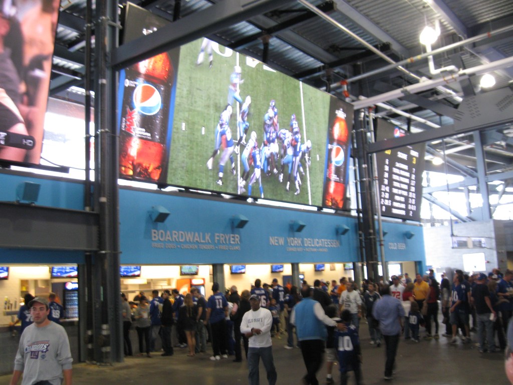 Fans enter through one of six gates and the main entry is the West Hall which features a Giants mural that gets switched to the Jets when they play. Straight ahead is the entrance to club seating, while there are ramps that lead to mini-concourses designed for some lower 100 sections. There are three levels of concourses, with the middle being for suite and club members and the look remains silver/gray throughout. The 100 level concourse is the nicer of the main two as it seems more open and there are some areas open to the public like the Captain Morgan’s Club, which is similar to a bar. The coolest thing I saw were the monster HD video screens above a few of the food stands. These three separate video screens displayed the game feed, game stats and NFL RedZone. The third level concourse is more crowded and more basic. With all of this real estate, you would think they’d figure out a way to make these areas wider as halftime was a bottleneck for the upper level