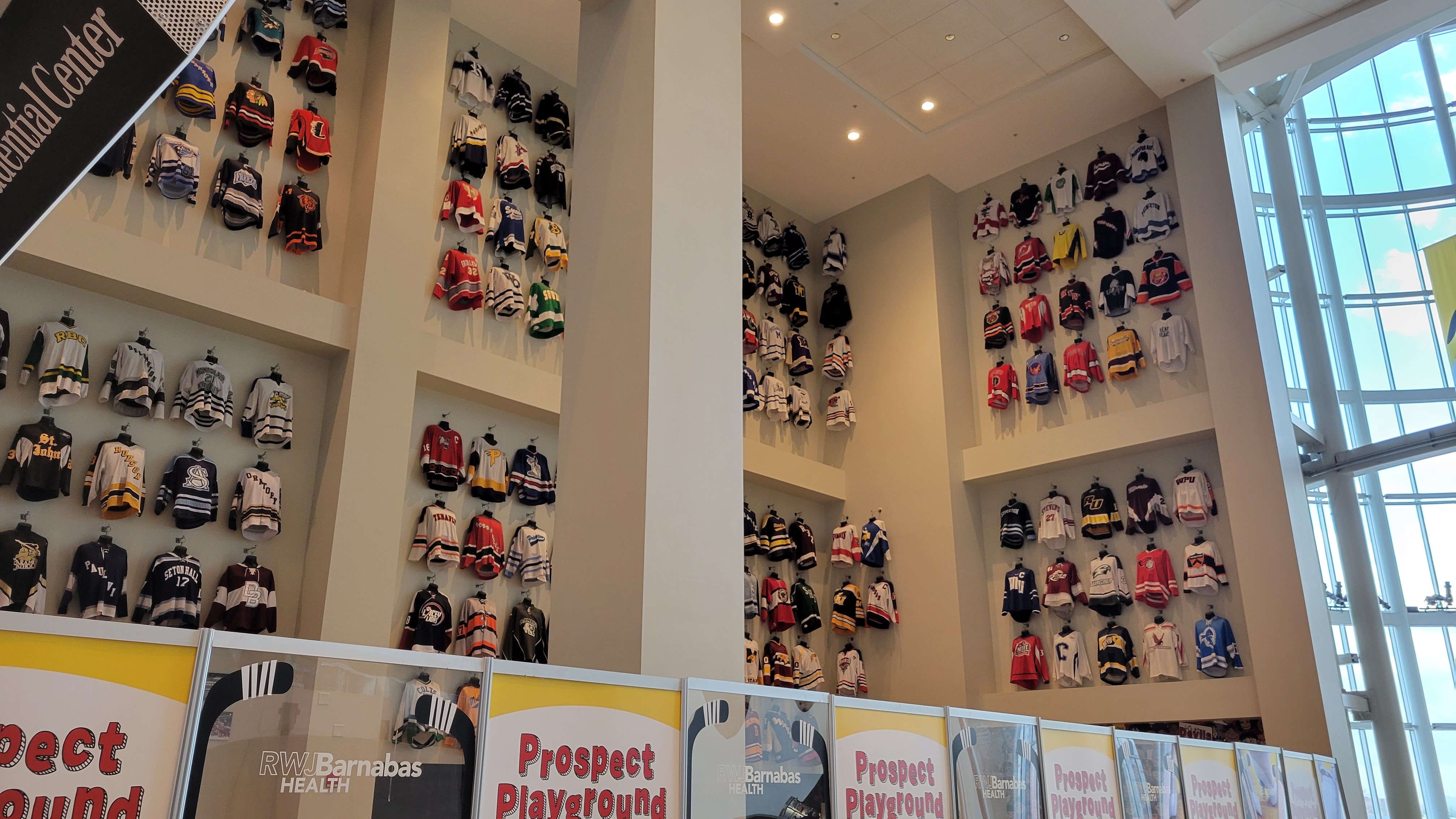 Inside, the 200-foot by 30-foot art mural is a sight to behold as it honors the Garden State. Athletes and landmarks are included in the painting on the first level concourse. Other smaller murals are displayed in the concourse and a section displaying the hockey jerseys of all the state High Schools is in a harder to see section above a kids play area (they were scattered around during my first visit). Team history displays are limited to just one small, glass-case section on the upper concourse. This is next to a collection of musical items for artists who have played at The Rock. Above the ice, banners are neatly arranged from the rafters. One side is for Division/Conference Titles, an end for Cup wins, an end for retired numbers (5) and a side for Seton Hall achievements.