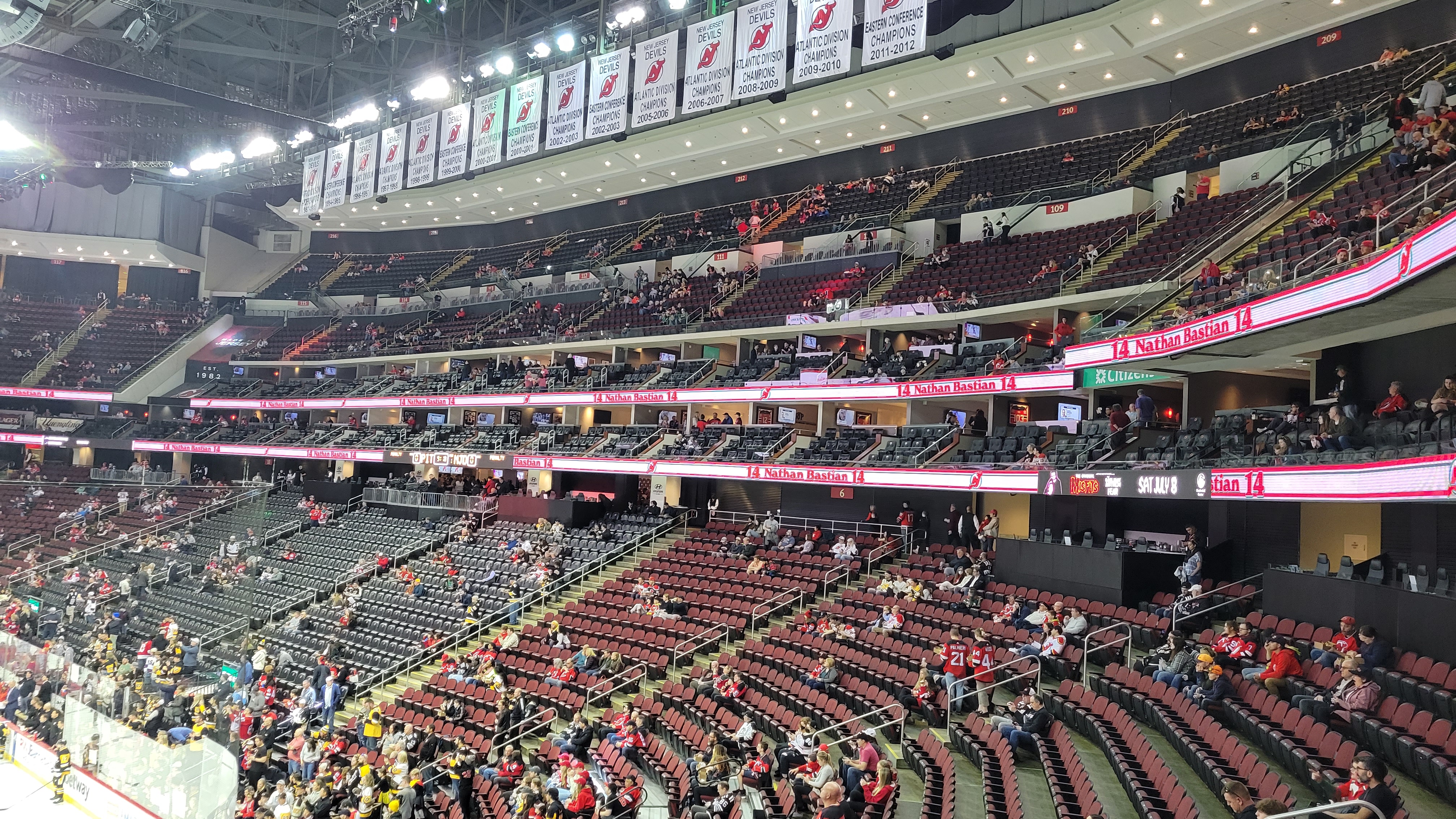 Inside is a facility that puts an emphasis on higher-priced, specialty seating. Above the lower bowl on the sides are two “lounges” that include club and buffet access, in addition to a cushy gray seat in one of the three center sections. The Devils were one of the first teams to do this in what unfortunately has been a growing trend. These sections all go for over $200, leading to many empty chairs and casual fans who don’t care about the game. Otherwise, lower bowl seating rounds the rink with wine-colored seats that are comfortable and feature an average amount of spacing and row depth. The next rung up is a row of suites, though behind one of the nets is a restaurant available on a per game basis (non-group) with a ledge seat and buffet. The upper-level then begins at the ends and these are the best seats if you want to sit on the second deck. On the sides, another level of suites, pushes those sections higher and further. The whole upper-side seating area is only eight to ten rows deep and there is an annoying walkway and staircase that separates the upper deck between 100 and 200 sections. The 200s suck because there are so many seats that have railing and glass obtrusions getting in the way of an ice view. Very frustrating as a fan. The arena overall may look nice and posh, but the emphasis on specialty seating hinders other sections. Of course, this is a trend that will not stop (must make money). I do at least appreciate that the arena isn’t just a boring couple rings of circular seating.