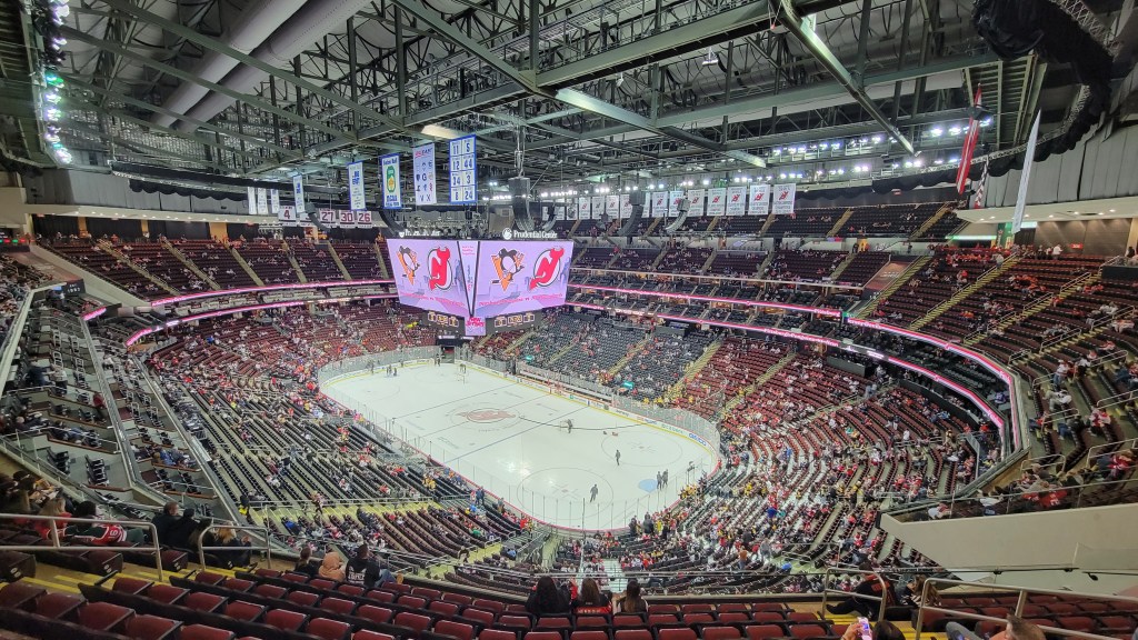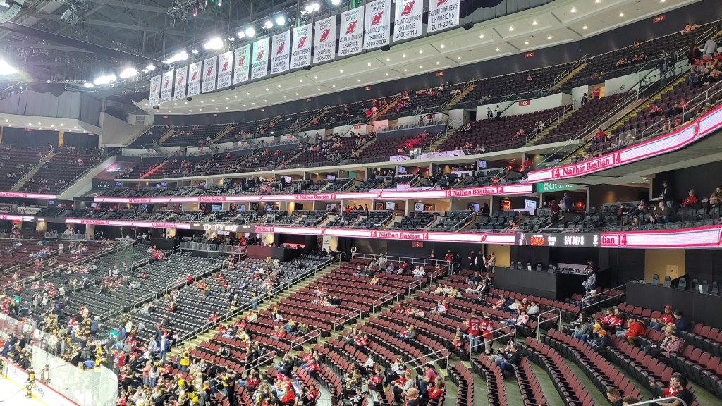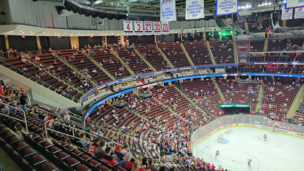 I derided the Devils fan base or lack there of until recently. Going back, attendance has never been a strong suit and when I visited in 2010, the Devils finished 25th in paid attendance that season, despite still having a perennially good team. Plenty of empty seats often are visible on TV games, primarily due to those expensive club seats taking up a large chunk of real estate in the lower bowl (the Devils can blame themselves for this). However, I did notice that many in the crowd had Devils gear on and having now lived in this state for over 15 years, there seems to be increased pride of them being New Jersey’s only professional team (others play here, but have New York on their name). Of course, you won’t change allegiants to passionate Ranger fans that live in the area, who certainly outnumber Devil fans in the state. I do feel like casual Devils fans are a little more than casual of late. That was definitely noticeable in the atmosphere (see below) and I was impressed with the size of a Tuesday Night crowd late in the 2023 season for a good team, in spite of their standing in league attendance rankings (still near the bottom). I’d say it was about 70% full.