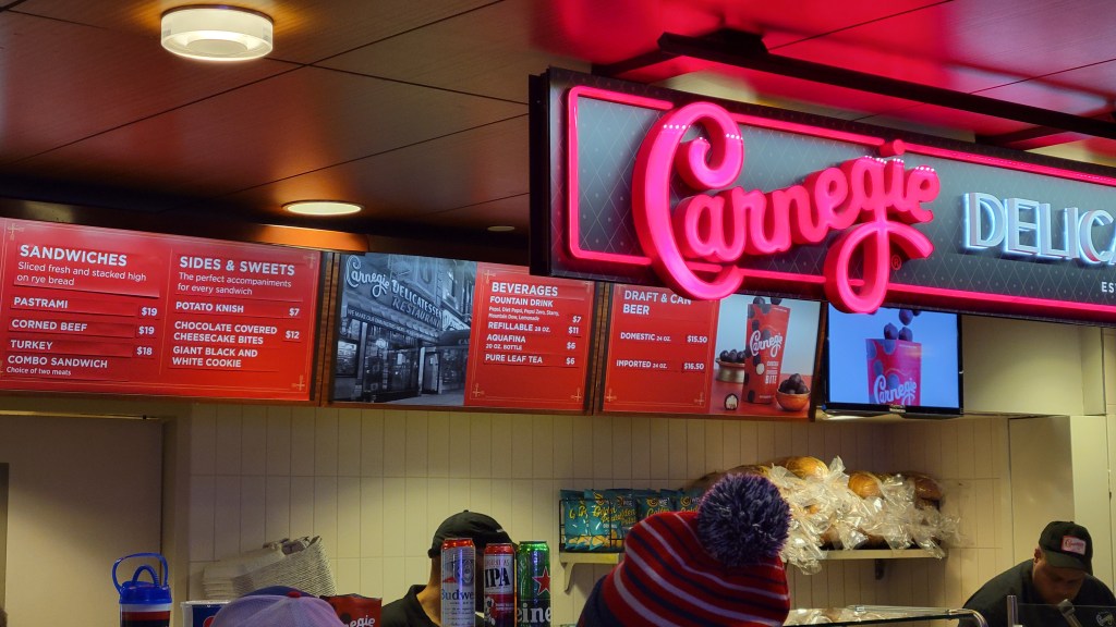 Food variety is impressive as the usual arena food is supplemented by an array of local chefs and restaurants. Being a known chef in NYC is desired and you’ll see several stands that have “Food By: first name, last name”. The ones that interested me included, Hot Honey Fried Chicken, Lavo Meatballs, Avenue Cantina and Tao Sushi. Of course, you would expect traditional City food as well and I was pleased to see things like a knish and deli sandwiches like Pastrami on Rye. Drinks of all varieties can be had and (for a hefty price) beer from the boroughs includes options from the Bronx Brewery and the Brooklyn Brewery.