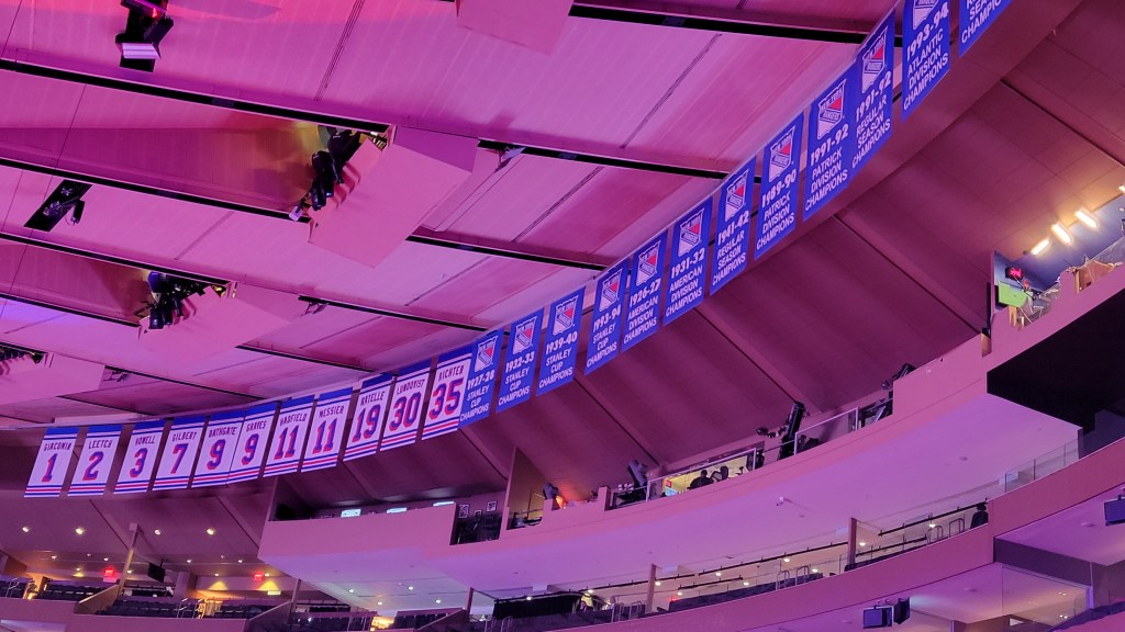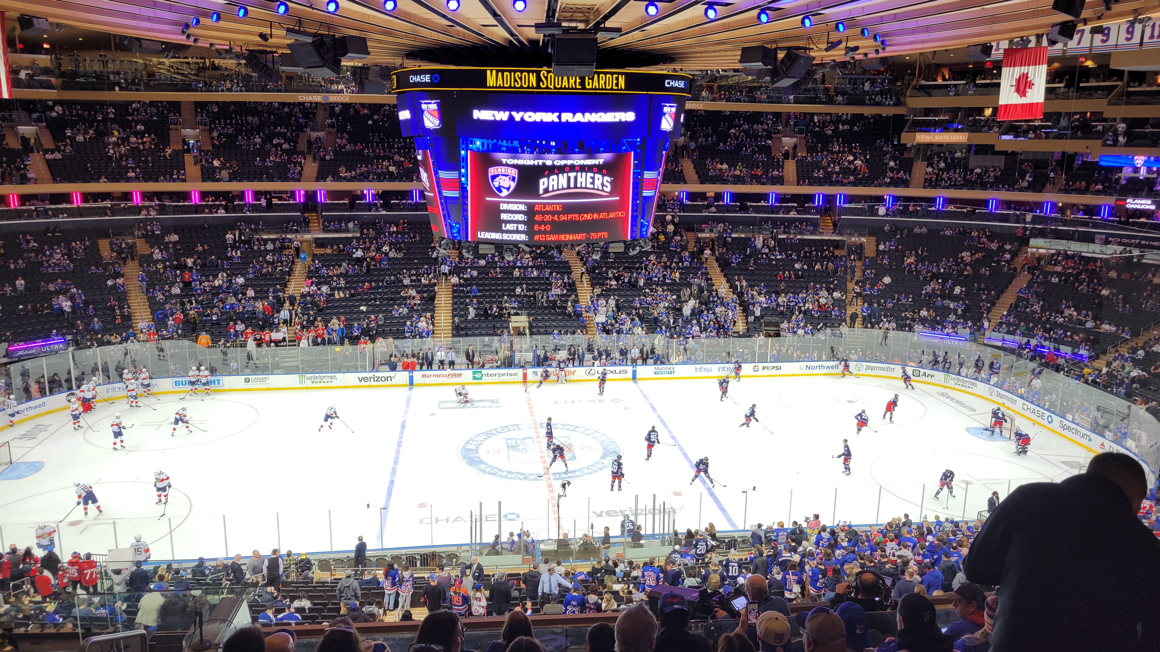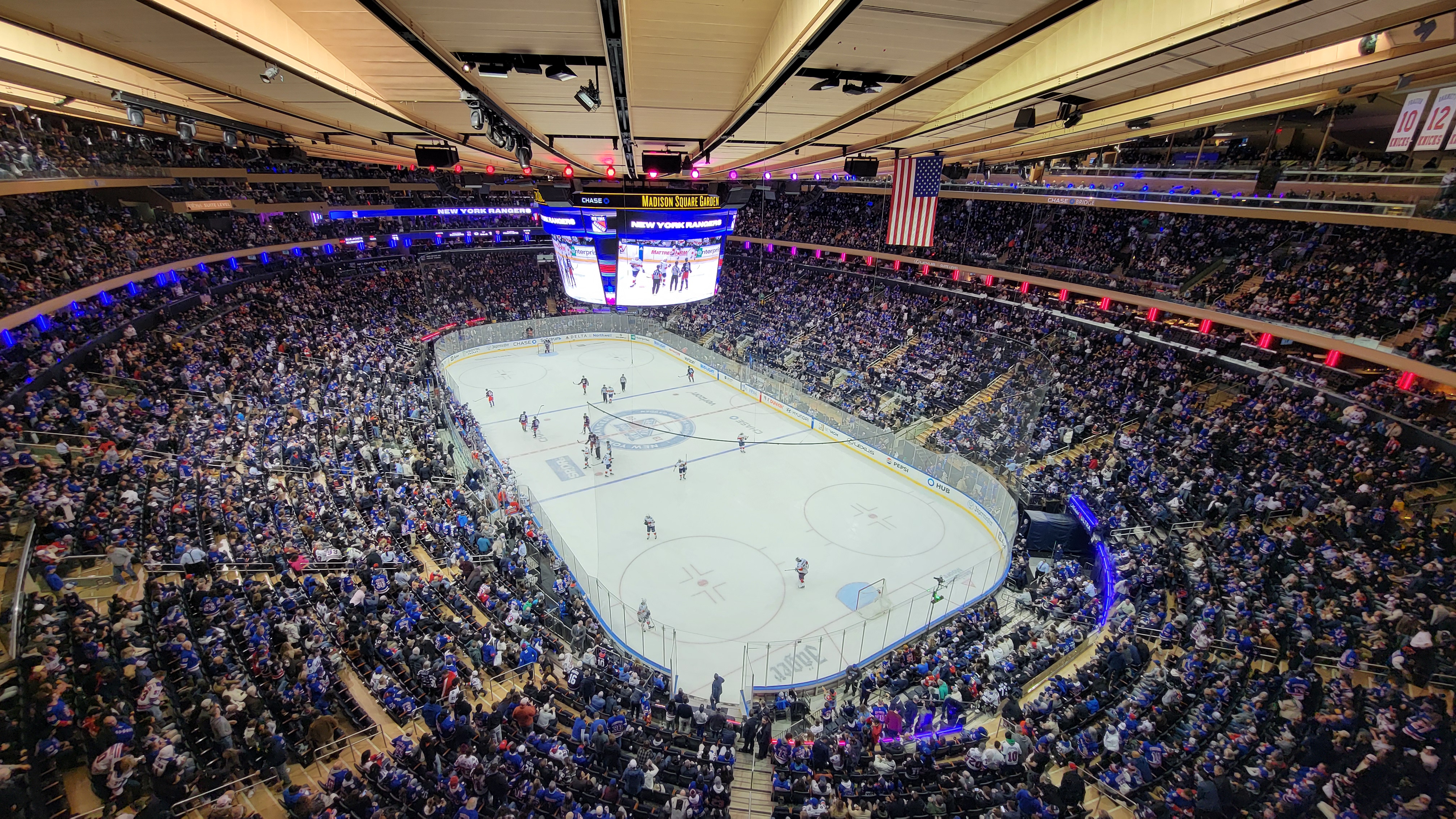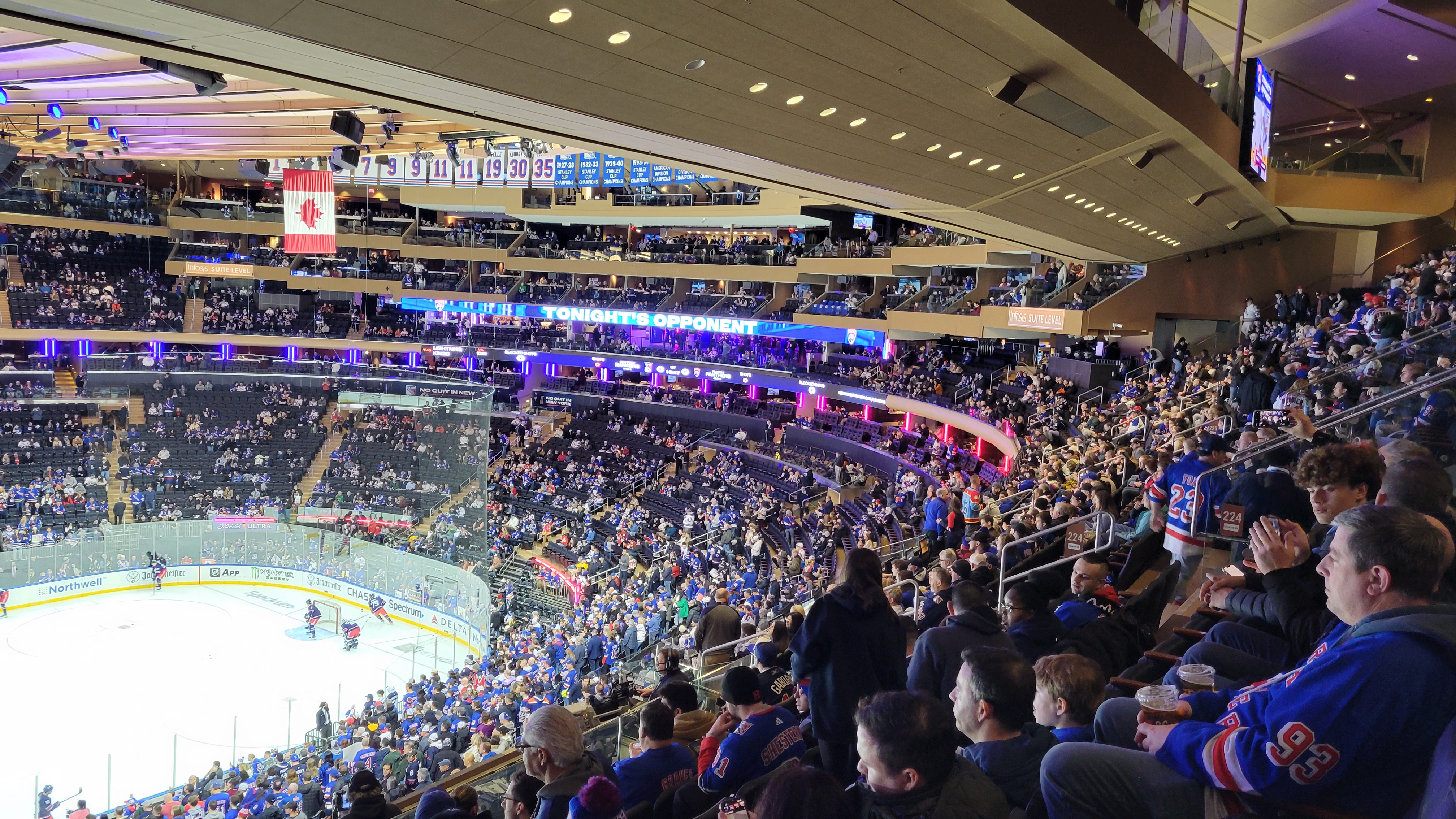 The atmosphere is amazing, but it has to be noted that the 2010s redesign reduced it a bit. The deafening noise created by the old building does not translate as well anymore, especially with how things were in the old 300 and 400 section. Ticket costs have been pricing out many real fans down below, but there are still plenty of loud and true hardcore fans in attendance that comprise one of the most vocal and animated crowds in the league. The group is also quite vulgar as I lost count how many audible f-bombs there were (though I cracked up at one dude who shouted in a high-pitched, New York accent: “Shoot the f’n puck!”). It can get very, very loud in here and I’m impressed that even early season games reach a notable decibel level. The “Let’s Go Rangers” chant is the loudest and most frequent, while chants of their goalie’s first name can bring goosebumps. For many years, this would be the awesome “Hen-rik”, clap-clap “Hen-rik” after a big save from Lundqvist. Currently, they’ll do it for Igor Shesterkin. Then there is the chant that starts with a whistle, followed by a small “Potvin sucks”, which has been going on since the 1980s (in reference to the Islanders’ Denis Potvin). I always have loved hearing the Rangers horn and goal song, which is remarkably one of the very few (only?) that has lasted decades in the NHL. It’s catchy and unique to the team. Other traditions heard and seen: Dancing Larry, who during the 3rd period does this crazy dance to “Strike it up”. Then at the end of the game after a win, the team gathers at center ice and raises their stick to salute the crowd, something most teams have copied at this point. When it comes to the playoffs, there are other buildings that are louder and overall more raucous. Despite this, MSG still is higher on the list for playoff atmosphere .