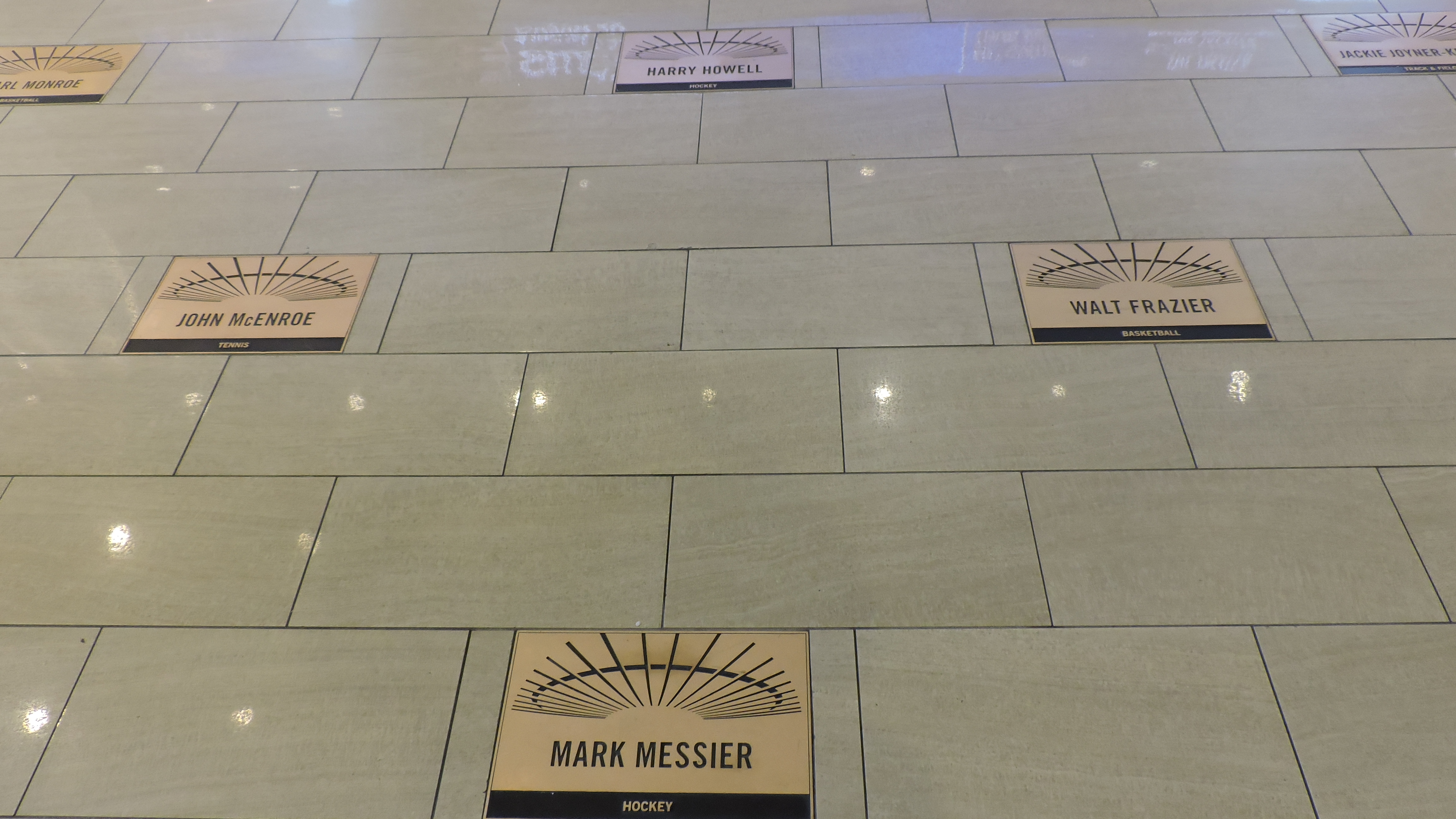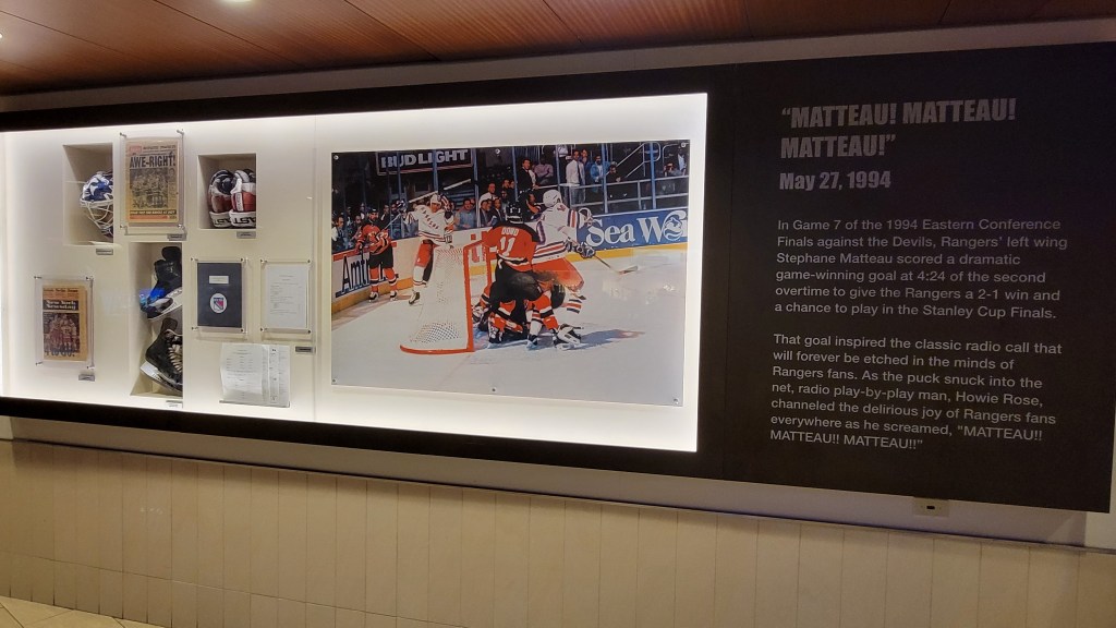 The main entrance in Chase Square features a “Walk of Fame” as plaques on the floor honor the excellence of the athletes, performers and announcers and coaches who honed their craft at The Garden. The better displays can be found in the Madison Concourse, where around the top wall is a well-designed timeline of all the famous moments in building history (and there are plenty of them!). The biggest ones have their own place on the wall below with a more detailed description and some terrific memorabilia to go with it. The Rangers are included in here too, but there is a certain “This is MSG” feel compared to “This is the Home of the Rangers”. That doesn’t take away from the great quality and how impressive those moments are. Banners for both the hockey team and the Knicks are found at each end of the arena. Small blue banners denote the year for each Division, Regular Season and Stanley Cup championship that the blueshirts have won. You’ll also find 11 retired jerseys up here.