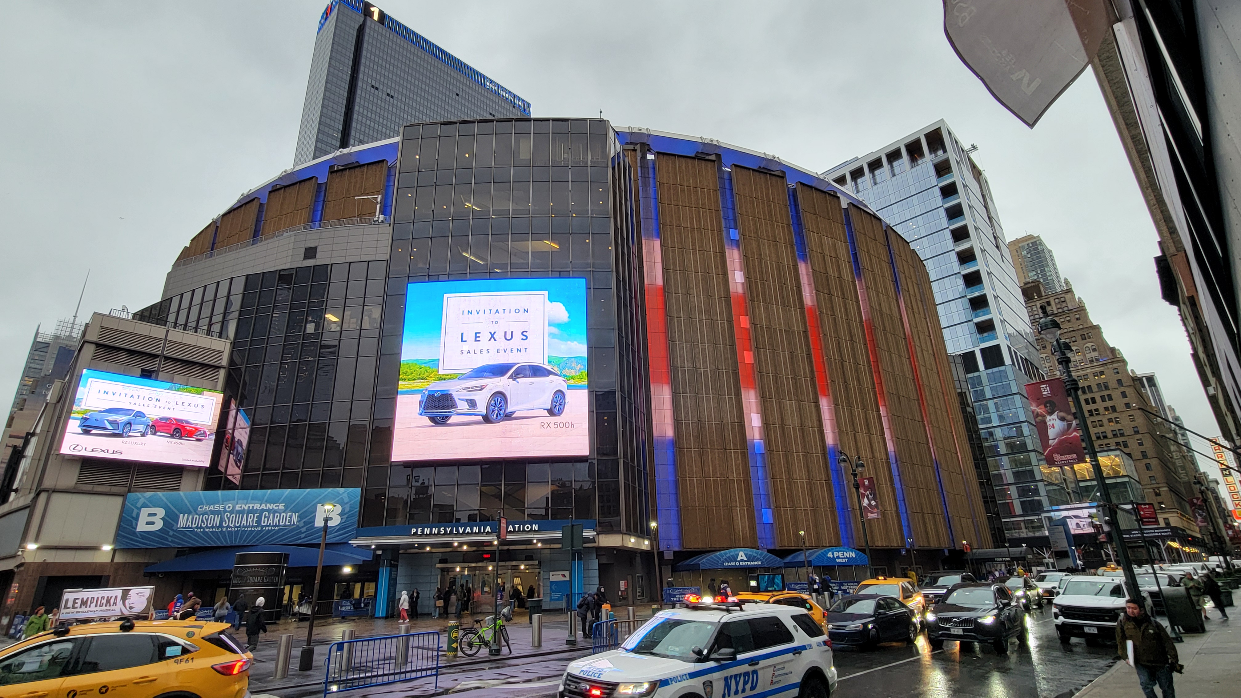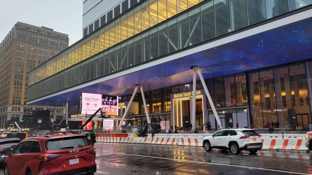 For those that do venture outside to take a look at the building, it is a tall one that still somehow gets dwarfed in size by all the surrounding structures. MSG is circular and most of it is made up of vertical concrete beige-colored panels. There are spots though with window outlooks and of course it wouldn’t be a premier NYC building without video screens all over that are plastering advertisements. It makes for a hodgepodge of visuals. The famous marquee before Penn Plaza is sadly gone, however vertical lighting adds a nice element at night as they shine for the team or event inside.