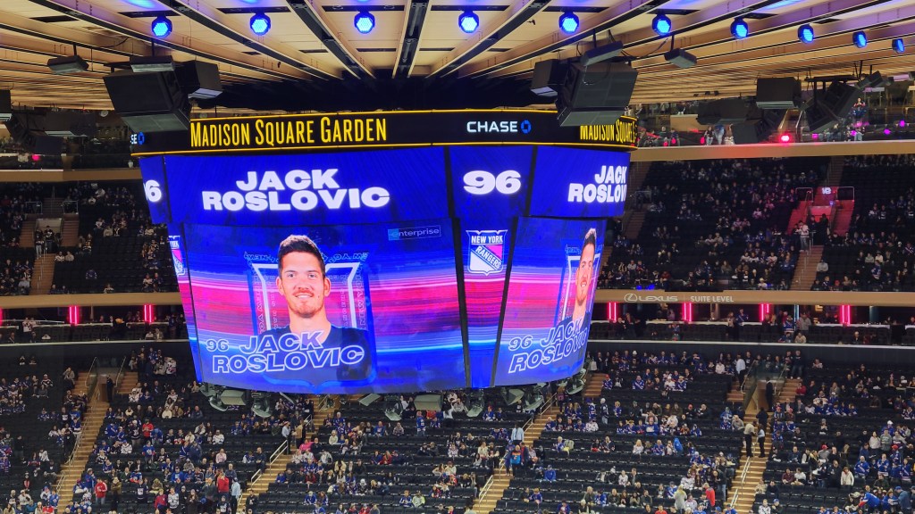 New York City is made up of five distinct boroughs with the most dense being Manhattan. The majority of NYC’s popular attractions can be found on this island that sits between the East River and the Hudson River. The middle section of Manhattan is known as Midtown and that is where you’ll find Madison Square Garden. It has got to be one of the most unique urban settings for an arena as it sits on top of a super busy underground transportation hub (Penn Station), while above ground, it is surrounded by massive skyscrapers. World Famous attractions within walking distance include Times Square, the Empire State Building and a little further out: Broadway and Rockefeller Center. Across from MSG, check out the repurposed Moynihan Train Hall. It is an impressive building that opened in 1914, originally as the home to the city Postal Service. You can still see the creed at the top (“Neither snow nor rain nor heat…). Plenty of restaurants are within the area and these are usually small in square footage, but high in character. Mustang Harry’s is a recommended place before a Rangers game as we had a good pre-game dinner and drink. There is a distinct look, smell (weed and pollution) and feel to when you step out above ground from Penn Station in the heart of the city that is unlike anywhere else.