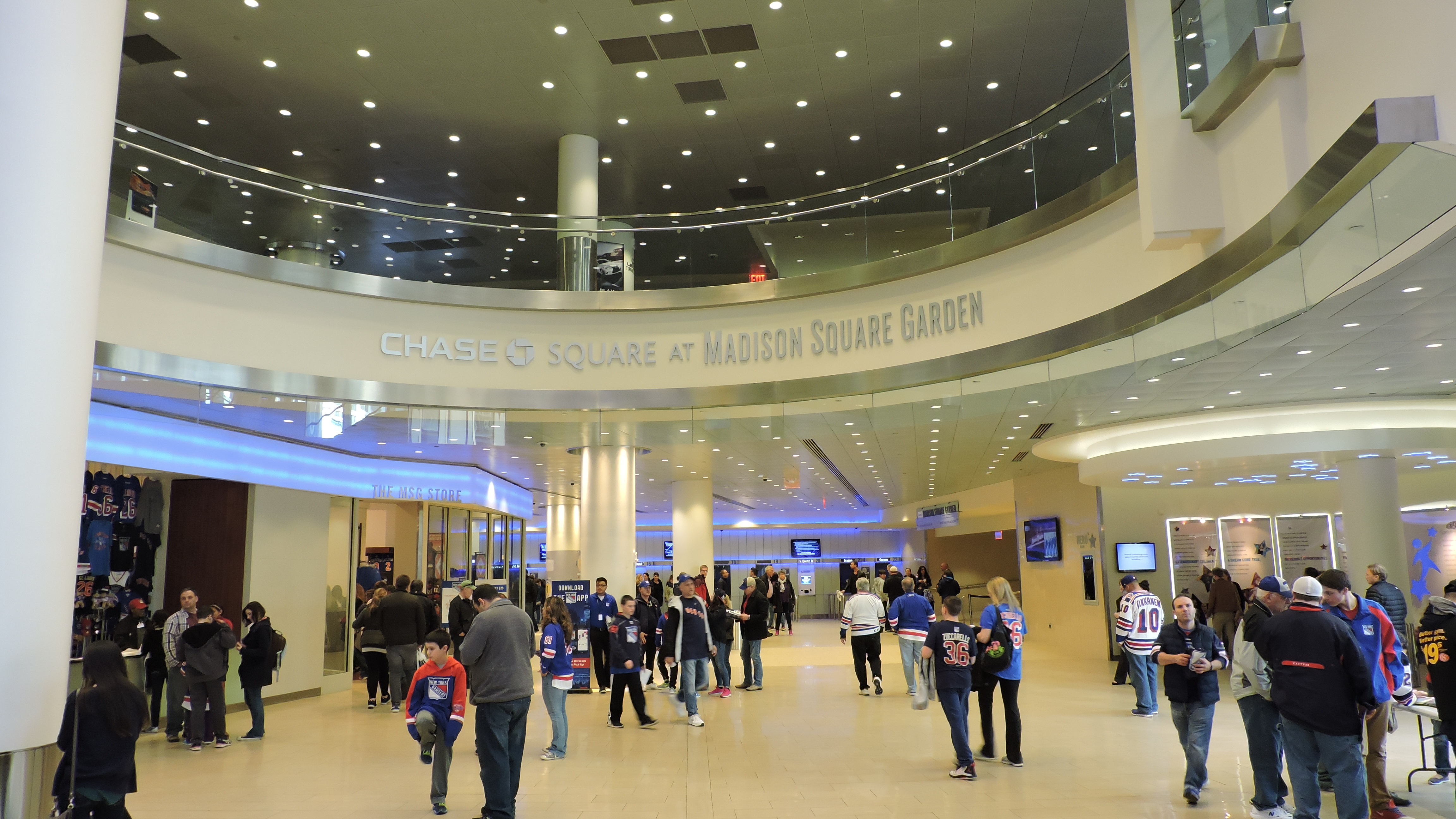 Small corner entrances can be found along 8th Ave while the largest introduction to the building is Chase Square on 7th Ave. This somewhat vanilla area connecting Penn Plaza and MSG features a light-colored and spacious entranceway that includes the box office, a store and a few plaques on the floor. People line up to get in an hour before game time, where you annoyingly have to scan your own phone ticket to go through the turnstiles (hate it). This brings you to one of four “Towers” which lead you up small escalator by small escalator. It’s cramped and takes awhile as this section of the building is a reminder that you are in New York City and it was built in the 1960s. The arena floor is actually on the 5th level of the building while the concourses are even further up. There are two of them, as the “Madison” level is the main concourse and then the “Garden” one is for the seats in the 200s. Space is really tight in this area with logjams common. The 100-level concourse is better as displays and lighting go with improved maneuverability. There is also some space at the very top of the seating bowl, where you can find a few concessions and bathrooms. Speaking of those, they are atrocious as lines become ridiculous at intermission.