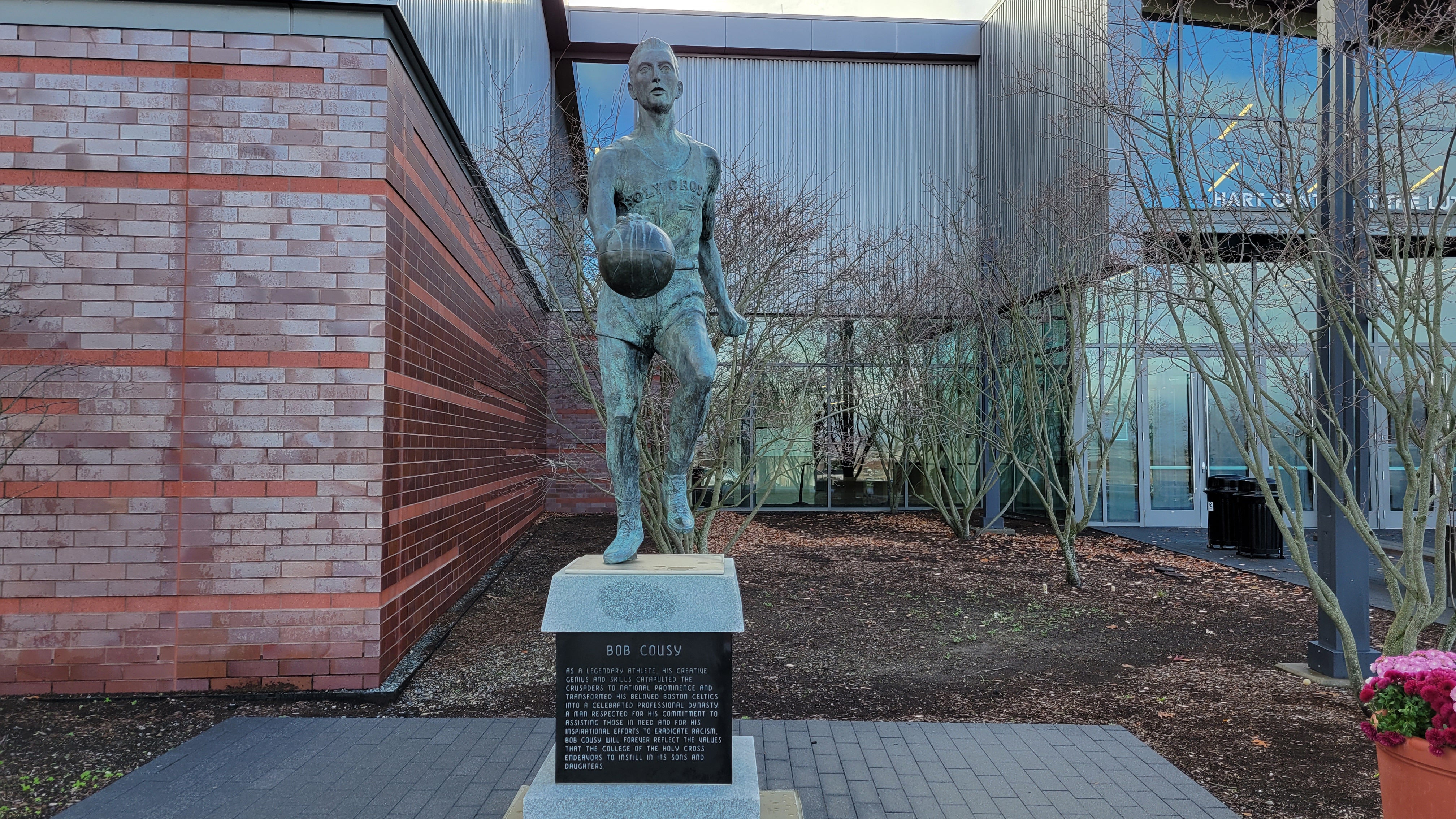 Near the entrance, there is a full-size statue of Bob Cousy and a brief description of his career. This is a good introduction to the arena and the program’s most famous player. The walls inside the concourses are nicely decorated with pictures, plaques and the mission statement featuring the shield logo. The most prominent display is the Varsity Club Hall of Fame with members each getting a lengthy inscription. Within the arena, Holy Cross does a nice job displaying banners and the 1947 and 1954 championships stand out quite well. There are retired numbers and Tournament appearances up in the rafters as well.