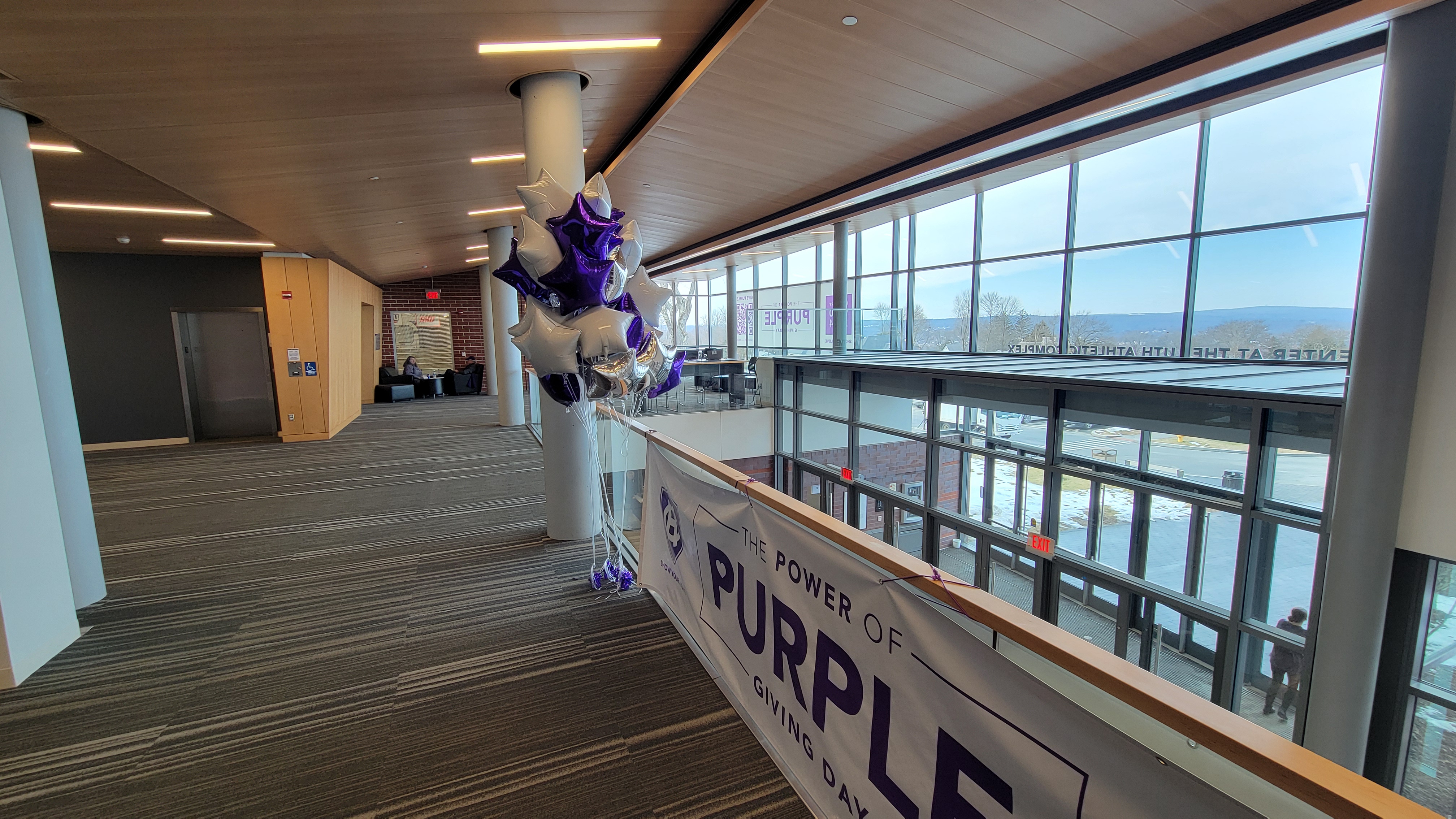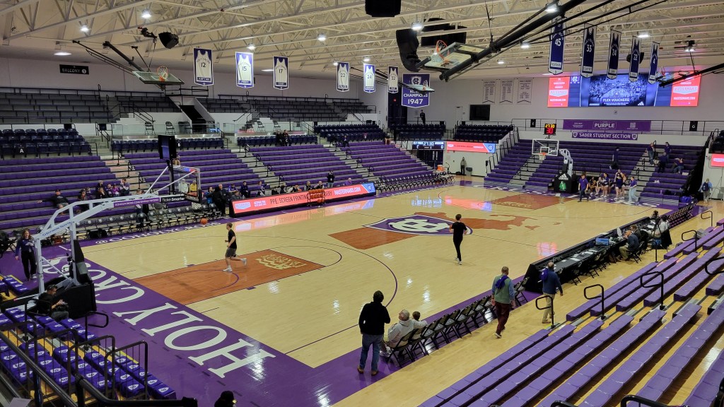 One of the things that always jumped out at me if I saw a Holy Cross game on TV before the renovation were those big numbers outlined in gold or white that are on the walls above the top seating. These went around the arena 1 thru 10, awkwardly defining the sections for the highest seating…..Before arriving for the game in 2024, they were handing out purple donuts. That was a nice treat!