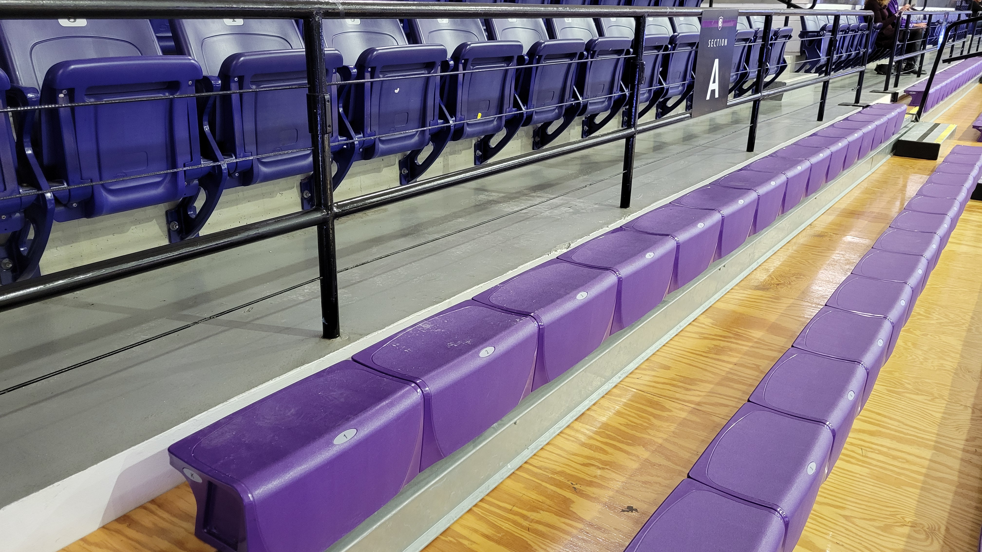 The renovation between my appearances did wonders for the inside as there is a lot of room to maneuver. Entering into the main atrium, to the left is a small gym that they divided into a Family Fun Zone and an alumni buffet. Straight ahead is a hallway of sorts that has a sleek look with charcoal and purple coloring. Concessions, wall displays and bathrooms are found here. An added bonus is the upstairs as you’ll find more open space and even a few chairs to relax in at halftime. The gym is a separate entrance and once inside, the ground-level corner entrance is a little awkward as finding your section is not clearly evident.