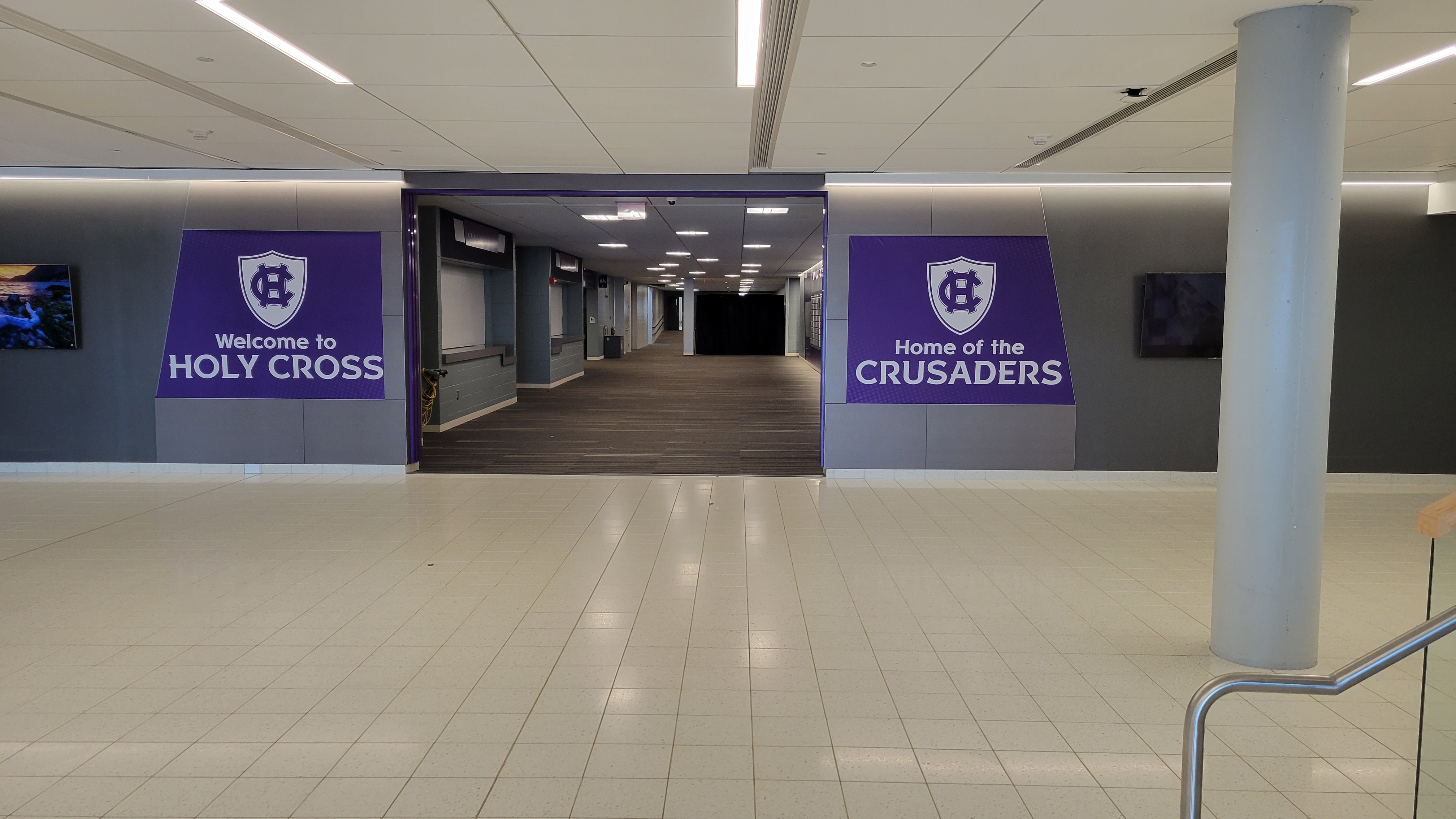 On the opening weekend of the College Basketball season, we made the three-hour trip to Central Massachusetts for a stadium double-header, starting at Holy Cross’ Hart Center. The College of Holy Cross is a small, private catholic school that is very well regarded and quite desirable to attend. The school is one of many colleges across the city of Worcester, which is the second largest in the state with a population around 200,000. Thus, Wormtown is much more city (and a rather generic one to visit) than college town. The Crusaders have a storied basketball history, winning the 1947 National Championship with Bob Cousy on the team. Tom Heinsohn then led the program to the 1954 NIT Title. Holy Cross was at its peak in this era as future NCAA Tournament appearances only came once per decade thereafter. They joined the Patriot League in 1991 and the best run for the squad came from 2001 – 2003 where as conference champions, they gave high seeded teams a scare each March. While in the region to check out UMass basketball, I stopped back in Worcester to catch an afternoon game in 2024. Since my last visit, the Crusaders finished in the Top 3 of the league standings only twice and their lone NCAA Tournament return came via an improbable run in 2016 as a #9 seed. The Hart Center was built in 1975 and renovations have made it a modern, vibrant building with all of the purple and it features one of the best atmospheres in the league.