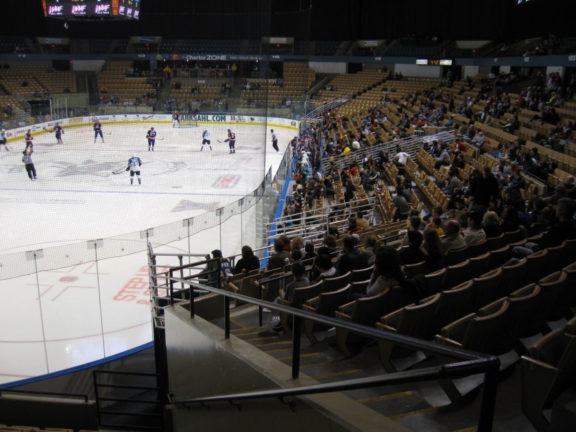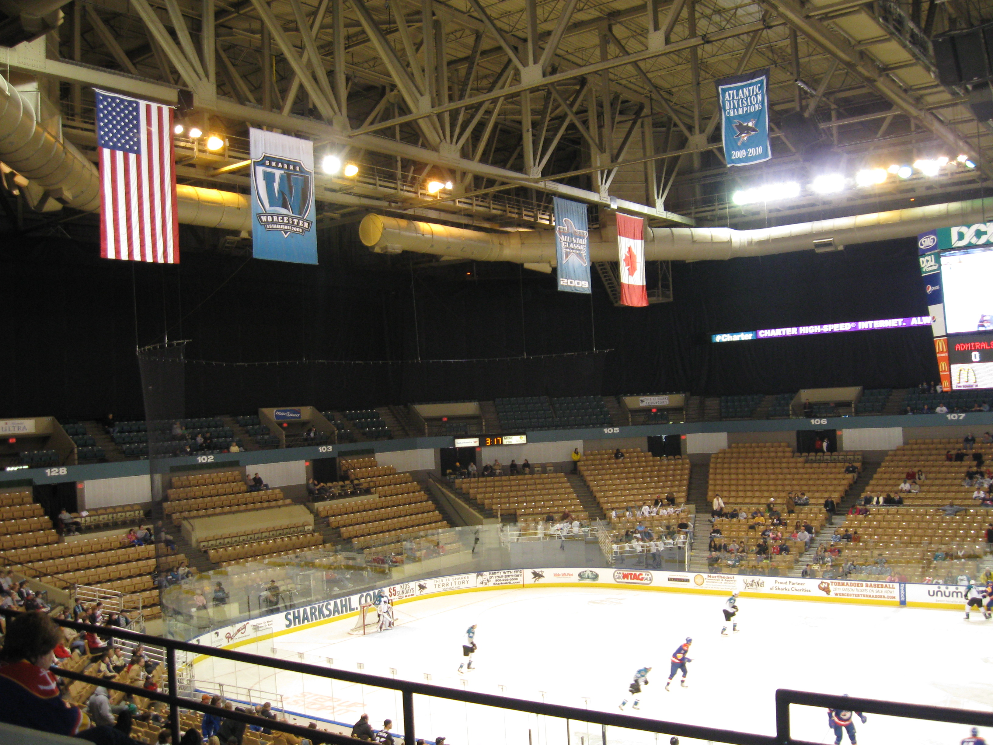 The city of Worcester is the second largest in Massachusetts with an estimated population around 180,000. It sits right in the middle of the state as the landscape becomes hilly. We spent time here over a weekend and with little to see attraction-wise, sports was the focus. Worcester’s arena is the DCU Center, built in 1981 and home to the AHL’s Sharks. This is the only tenant in the building and the Sharks began play in 2006, after the city went a year without a team (the IceCats were there from 1994-2005 until moving to Peoria). The Sharks have made the playoffs three of the past four seasons and capped last year with a division title. The DCU Center sports a large capacity and bright entrance, then the building gets rather boring from there.