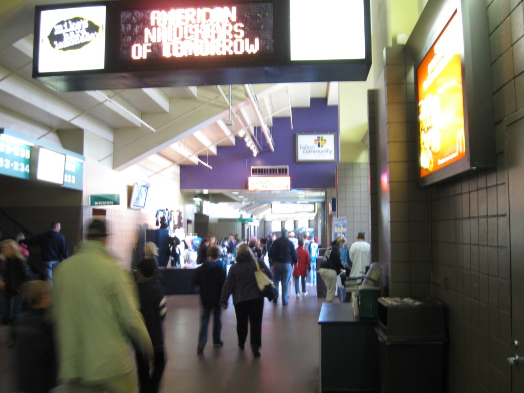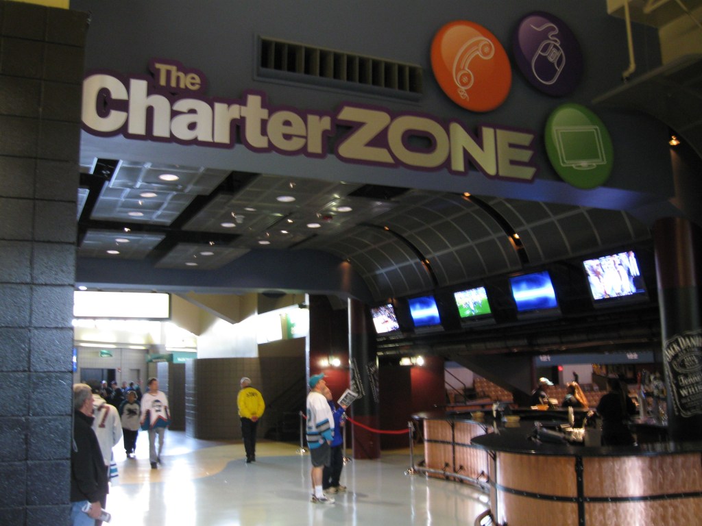 Fans enter into a common area full of “DCU Center” flags and Sharks banners. After the ticket collectors, the concourse is a fairly standard one that circles the arena. Not much to get excited about here. The one neat area was the Charter Zone, which is a bar built pretty much into the hallway concourse. It’s mainly standing room, but the 5 TV’s were nice to check out other sports (NFL games on this day) and you can get a drink. Scattered around were a few merchandise stands and make-shift stores for Sharks apparel. There were also other monitors in the concourse showing the game if you leave while play is ongoing. Bathrooms seemed to be small and not enough of them.