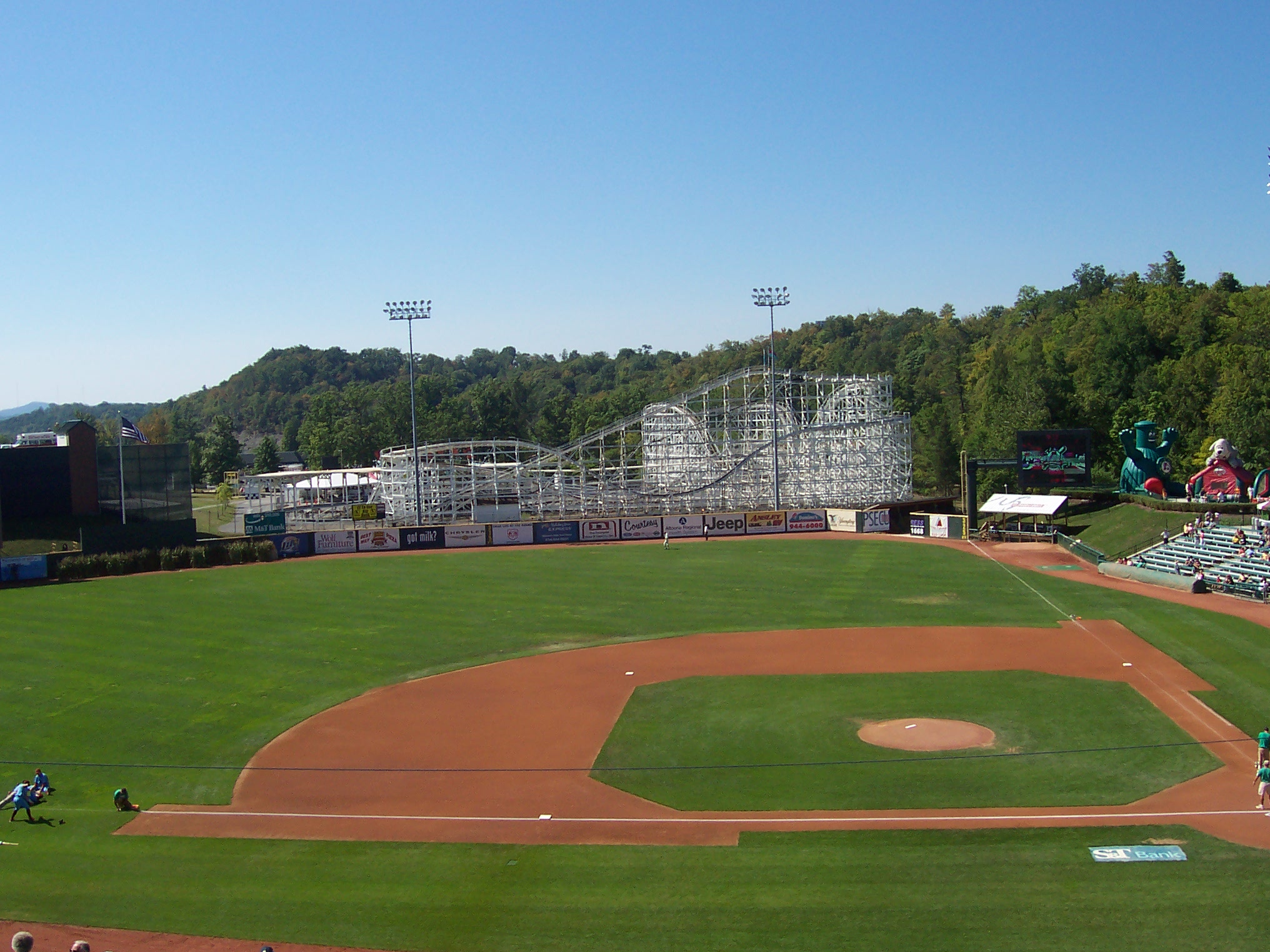 Ballpark design in the Northeast became somewhat stale during the boom in the 1990s and 2000s when so many were created equally. That is why it is very refreshing to see something a little different in Blair County. The seating bowl is set-up with two decks and many of those seats are in the upper-level, where leg room is quite sufficient. The second deck is split by a walkway with about four or five rows separated from the higher tier. Sightlines are still pretty good despite the divider. We could have used a roof or slight overhang on this hot afternoon as many stayed in the shade of the lower concourse to watch the game. Dark green seats are nicely angled in and the bowl ends just beyond the infield. Luxury suites (21 of them) and the press box sit above a white wall at the top of the stadium. Further along the right side are bleachers and a picnic area, along with a kids play section. On the left side, everything fits neatly into the park as a field-level picnic pavilion is followed by “Uncle Charlie’s Grille” in the corner near the foul pole. For those wanting outfield seats, they have those too as bleachers are just beyond the fence in left. Accentuating an already great stadium is a view that is hard to match. The background Allegheny Mountains are nice enough, but the Curve even take the effort to write “Altoona Curve” in red rocks on a smaller hill within the park’s confines. Likely the defining feature of Blair County Ballpark is the roller coaster visible directly in right field. This is the “Sidewinder”, part of Lakemont Park and while a few other rides are also visible, this great wooden coaster dominates the beautiful setting.