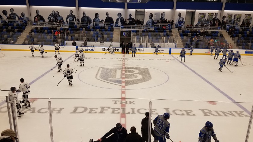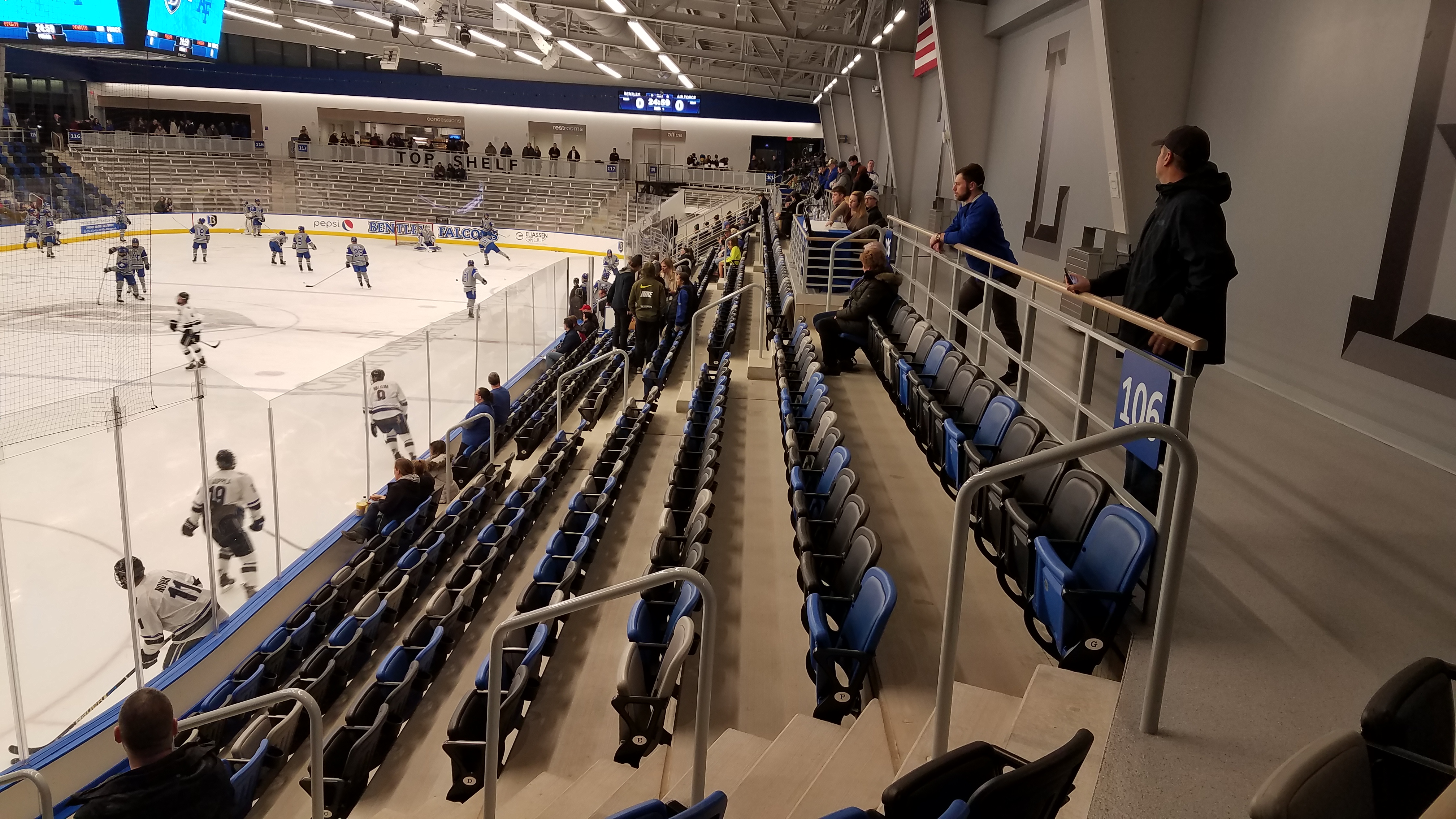 Bentley came in to this weekend evening game on an 8-game unbeaten streak and the crowd result wasn’t that great. The arena was maybe half-full (so less than 1,000). It’s understandable given Boston’s packed sports scene and I would imagine that only those with ties to Bentley come to the games. Student turnout was disappointing as their end section sat 75% empty with maybe 100 kids on hand (with half of them watching half-heartedly and looking up from their phones). The team ranks in the middle of the Atlantic Hockey attendance standings.