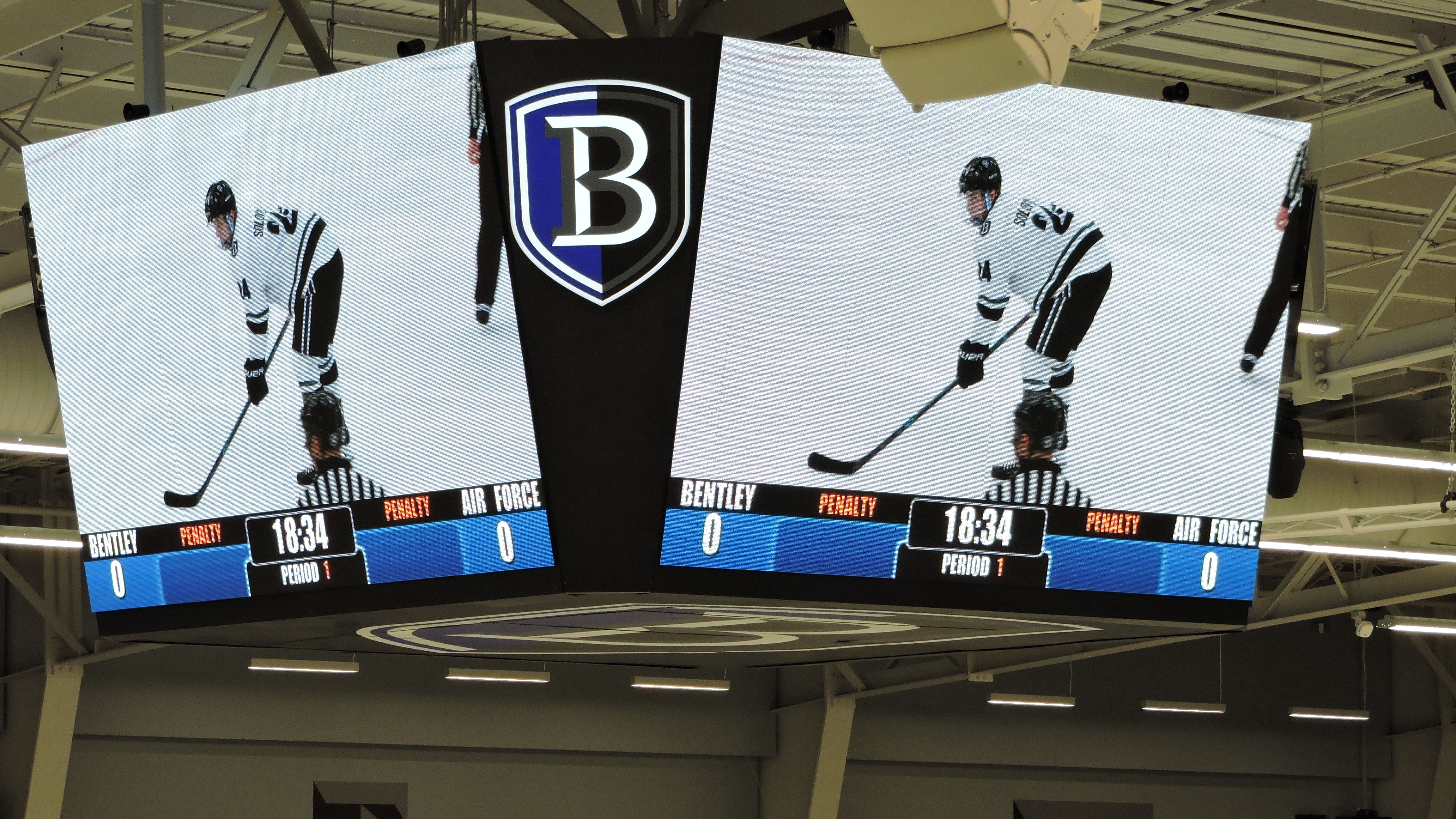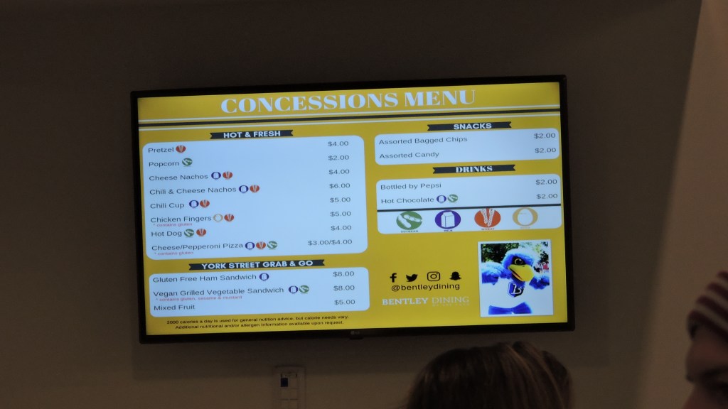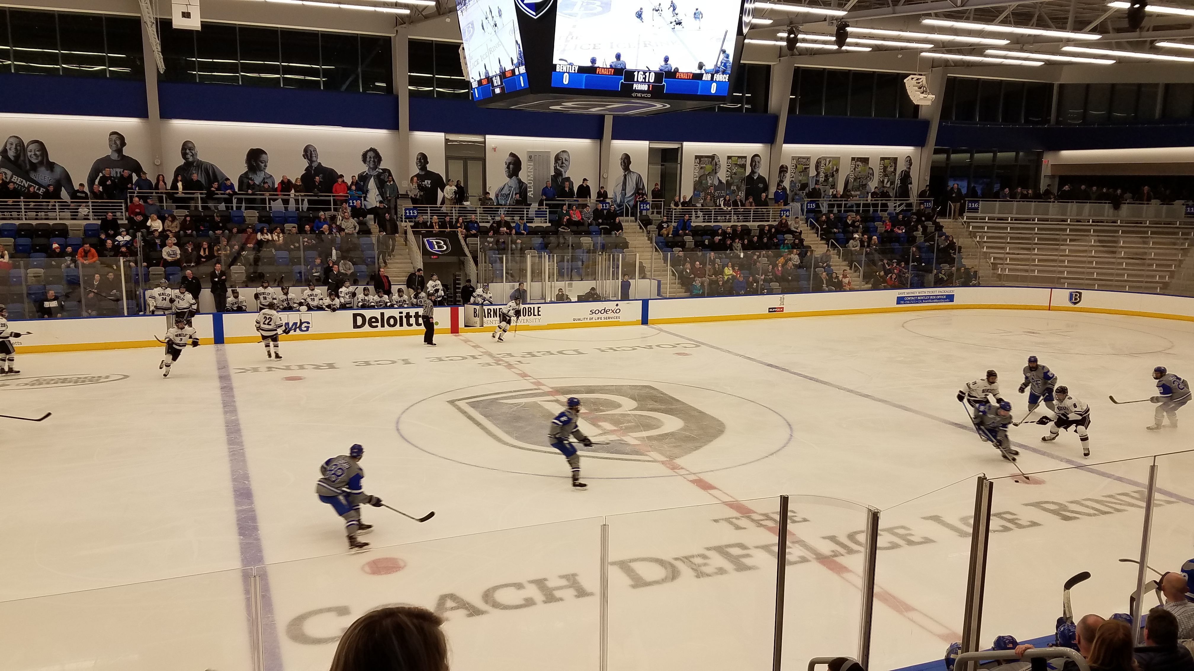 On a doubleheader that involved basketball at nearby Boston College, I drove to Waltham for a hockey game on a Saturday Evening. This city of 60,000 is located about 10 miles west of Boston and its manufacturing roots led to the nickname “Watch City” thanks to being home of a famed company. Another interesting tidbit is that Waltham has become a center for many from Uganda. It’s even been known as “Little Kampala” and there’s an Ugandan restaurant (Karibu) to boot. The city is home to two colleges and one of them is Bentley University, a small private school relatively new to the area, having moved from Boston in the late 1960s. They’re known for their business program and they also play hockey at the Division I level. Moving up a class in 1998, Bentley became one of the original members of Atlantic Hockey after the MAAC disbanded. They’ve had four winning league records and have only been to one conference tournament championship game (a loss in ’06). After decades in a municipal ice rink a town over, they recently debuted their on-campus arena in 2018 and it is a great little building that features a ton of technological advances.