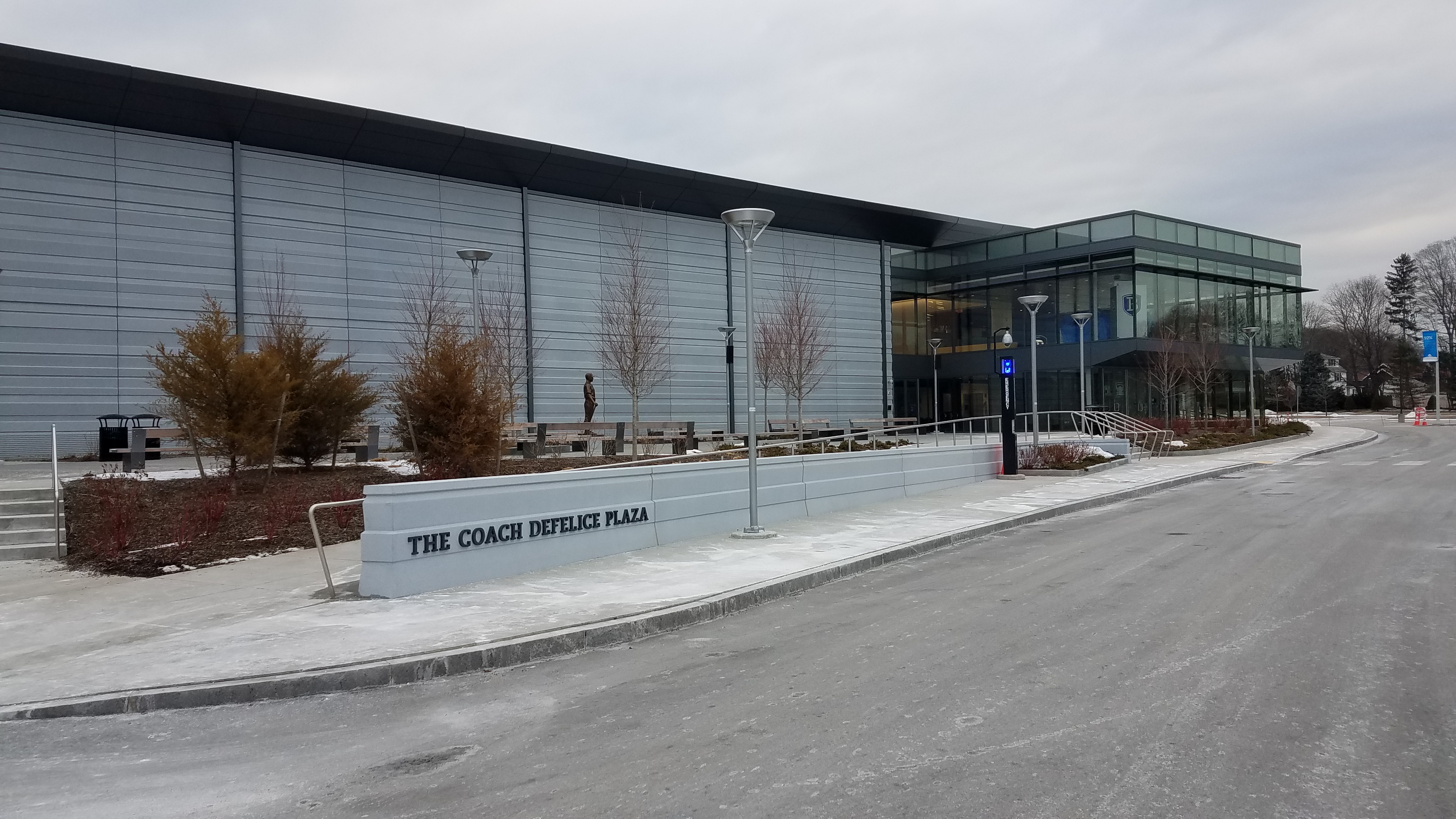 To go along with the nice interior touches, there is a statue for Bob DeFelice in the outdoor plaza. He is not only the long-time baseball coach, but also the school AD. Inside, there is a small display case for hockey that is lacking a little, but still nice that it is there. The wall featuring the faces has a couple nice displays including a list of every player to suit up for the Falcons and a small decade history on the team. There’s also a plaque explaining the recent origins of the student section “The Top Shelf”. Too bad they didn’t come close to living up to that billing. League team flags are on an end wall.