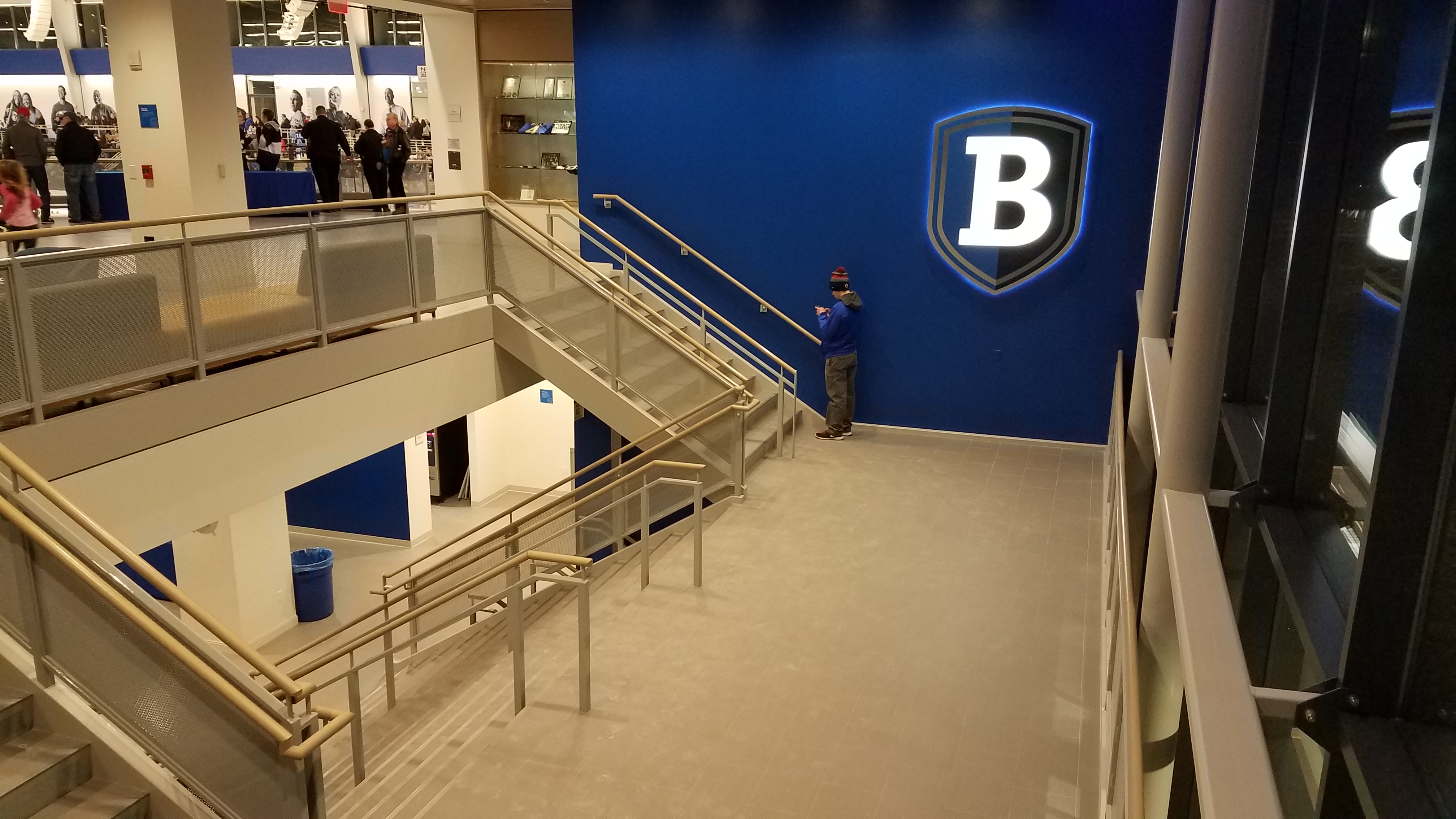 The entrance inside is at ground level and the opening portion features a lobby and a table to buy or pick up your ticket. It’s a nice introduction for the school with some walls painted blue and the classy Bentley shield logo fixated into different places. Stairs (or an elevator) are needed to reach the ice rink and the collection of students partially up the stairs to lackadaisically take your ticket is odd. The aforementioned glass overhang acts as a corner open space inside and it doubles as a nice collection area and the school’s team store. The “concourse” is a small walkway around the top of the seating bowl, which is fine for a small crowd, but an annoyance if the place is packed. To go along with a couple corner food carts, there is an end section that contains the bathroom, a concession stand and “The Cube”. This swanky, VIP lounge is a perk for those who want to spend a good amount of cash on a “Premium Package” ticket.