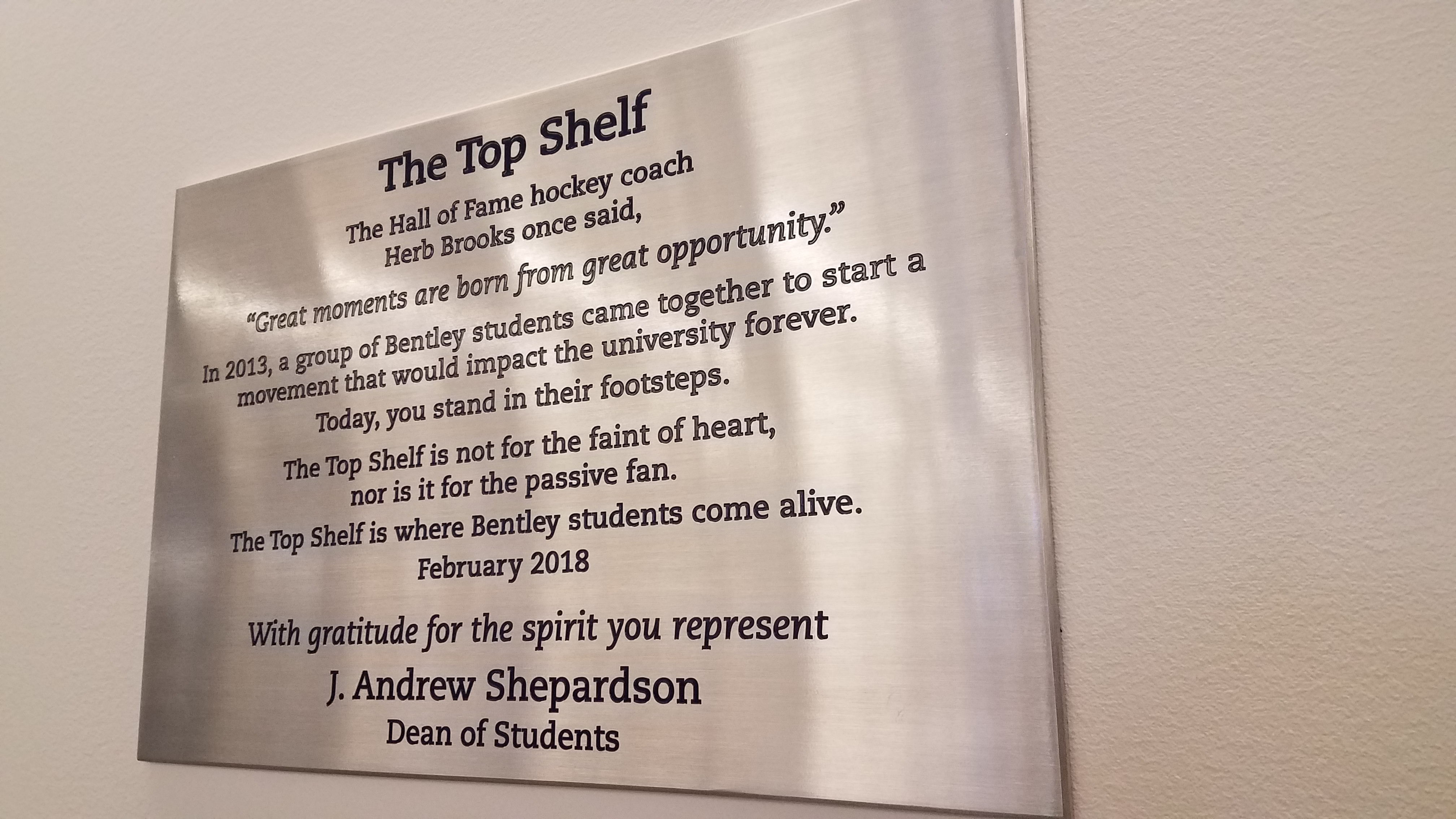 Bentley Arena is simple in that there are just 5-9 rows that go around the rink in a mostly uninterrupted fashion. I say mostly because there is the Section 109 press box that oddly has the position of being at the end of the arena instead of the traditional middle. The small surface area inside didn’t leave much room for that and I’m sure game announcers have a hard time when the puck is at the other end. Steepness of each row is pretty good, though only a few of the top rows get to take advantage of that since glass partitions get in the way of the view for the bottom half rows. Many decided to stand along the concourse and with a drink rail in front of them, that’s a decent option. Seats are very comfortable and they even have a little cushion as they vary between blue, gray and black. Opposite the press box at the other end is the student section (called “Top Shelf”) and this is bleacher seating. The character inside is great as one side wall has “BENTLEY” spelled all the way across it. The other wall is full of large student-athlete pictures in school apparel. It’s also bright inside (too bright?). Despite the small size, Bentley Arena outshines many across the college hockey landscape.