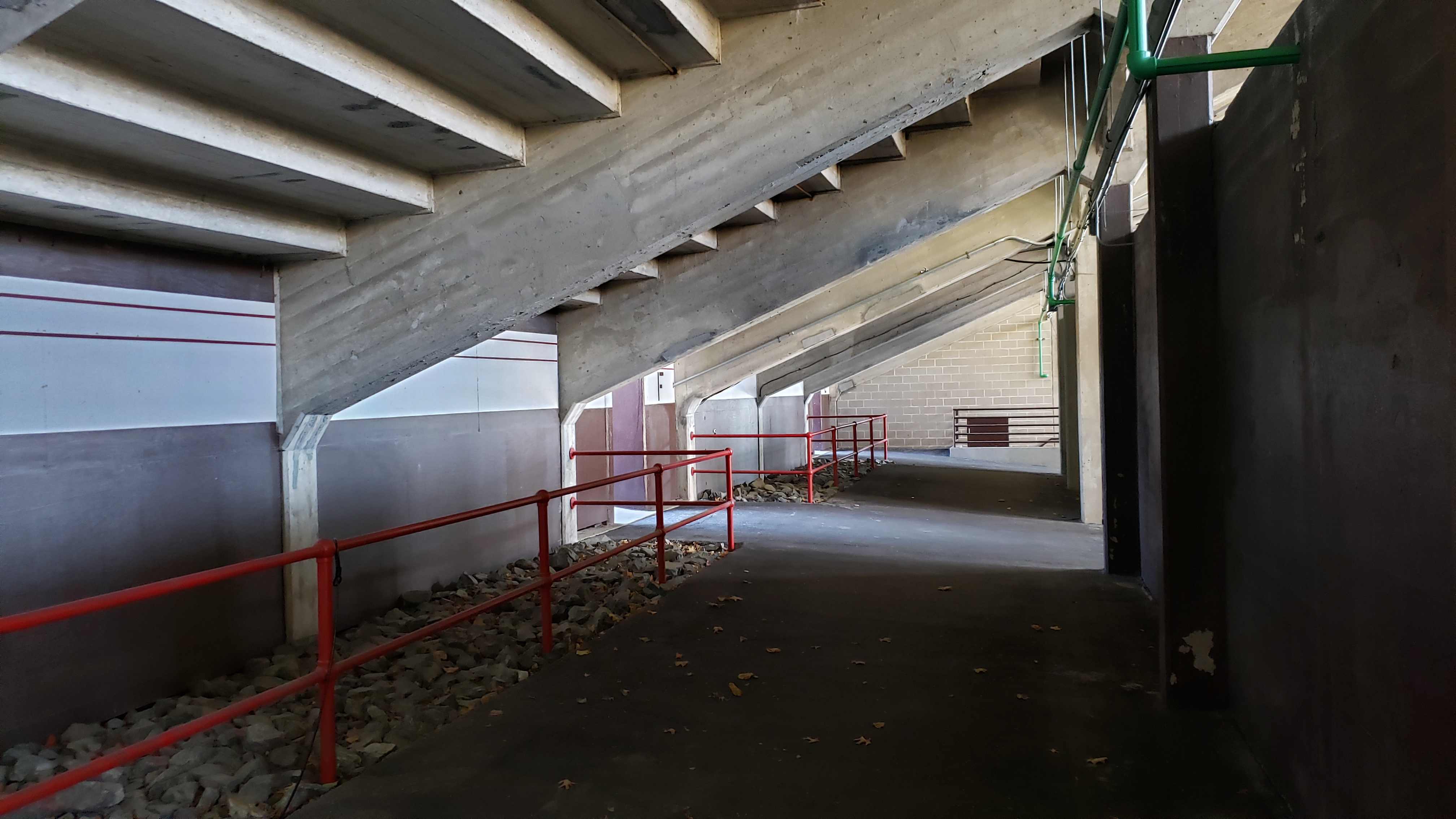 Underneath the large stands, is a concourse that is full of support beams and drab gray nearly everywhere. It’s a space with obstructions galore and one that is good for a stadium of 5,000, not 20,000. Concession tables are plopped in the middle and don’t expect anything special as options include Pizza, Hot Dogs, Burgers, Sausage, Chicken Fingers and Fries. There is no beer available and Coca-Cola is the soda provider. Lines can get long at times, but workers manning the grill are very pleasant. Going back to the limited space, the bathrooms are an even worse display. Men get just one area and they are either using a trough or going into one of just two stalls. Getting around to the visitor’s sideline is a pain as you have to take a long ramp along the outskirts of the stadium (you can’t even see the field as shrubs block the view). The walkway behind the visitor’s side is uncovered before going through an entrance hole to the seating. It’s a more interesting design here, resembling a cabin. You’re out of luck if you want to walk around the southeast end as security blocks that off.