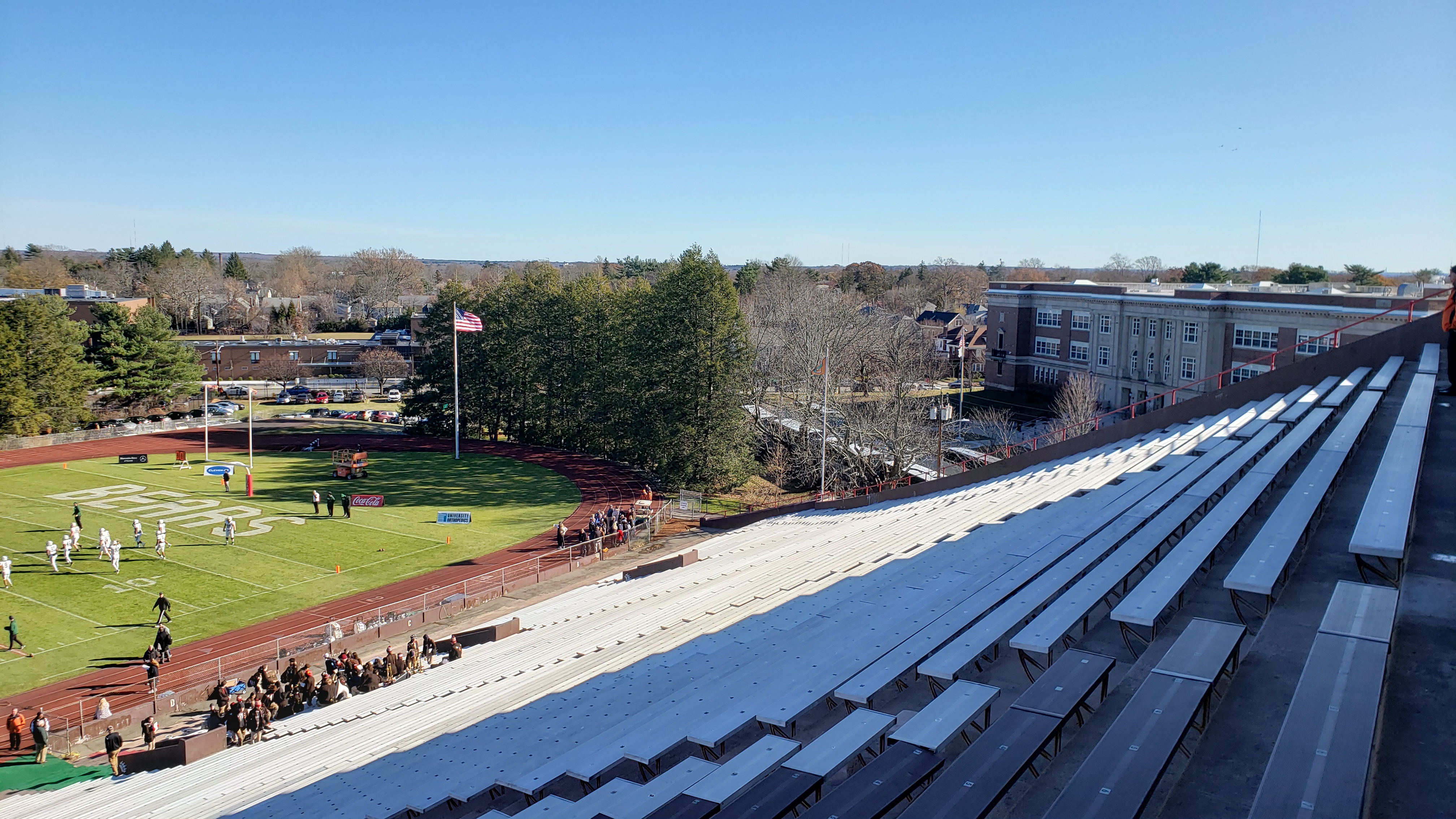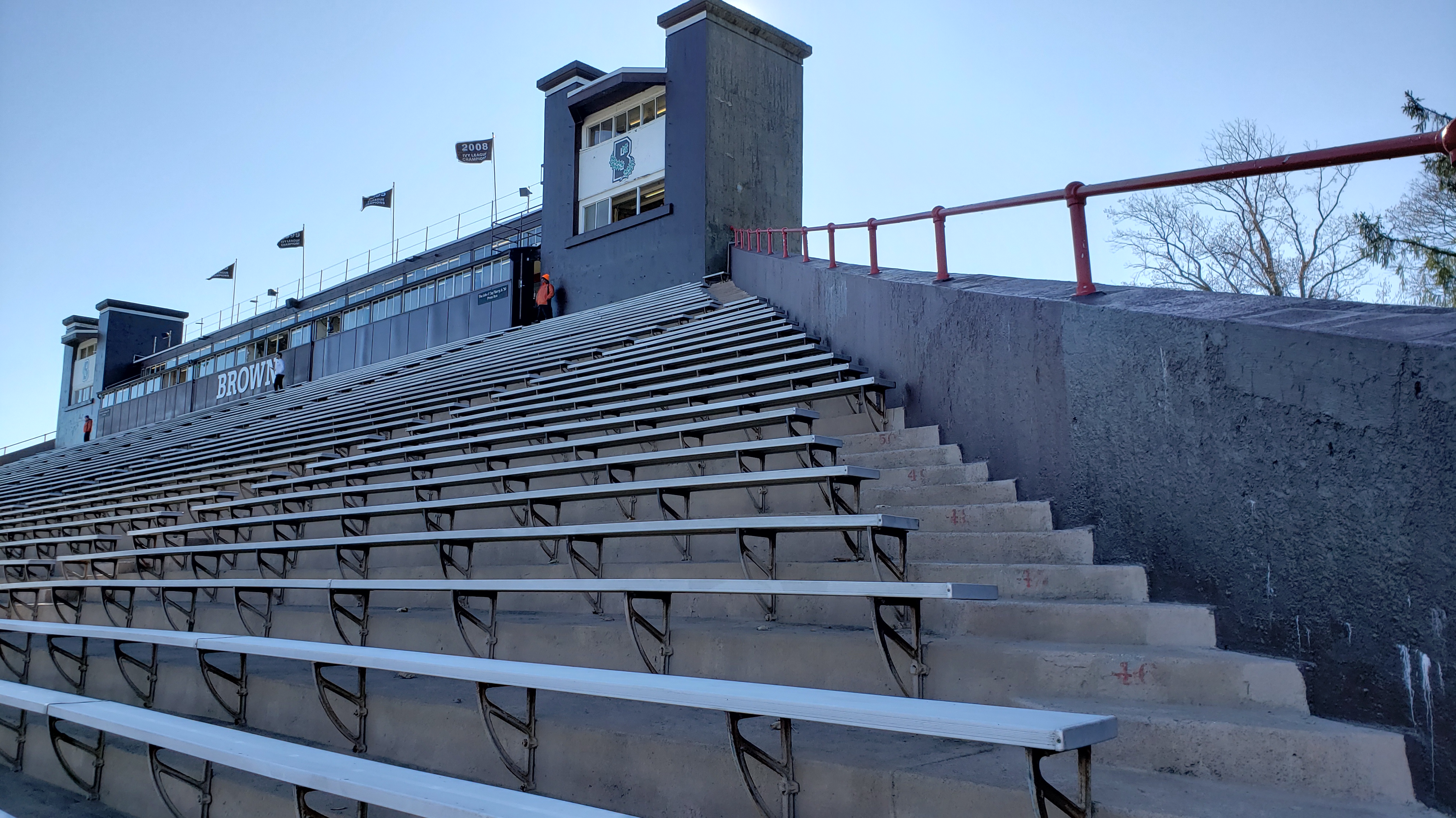 Most of the seating is on the southwest sideline as the trapezoid-shaped stands go up 72 rows to the top, making for a tiring climb from the bottom concourse entrance if anyone wants a panoramic view. The back-less aluminum benches are what you would expect from a comfort standpoint and the space between each row is average at best. The field view is ok as each row goes up at a standard increment, however diminishing the sightlines is a running track and the seats beginning at ground-level. A press box can be found at the top of this seating area and the wall features a “Brown” wordmark, which is above a subtle dark “B” colored into the seats below. Wheelchair seating is found at the bottom of the bowl and for anyone shaky with steps, climb with caution because there are no railings and the side steps near the wall rise at a discombobulating angle. Over on the other sideline is a much smaller set of bleachers that extends to each 20-yard line. This area is a lot less ideal to watch the game as the smaller pitch leads to worse sightlines, plus you have to stare into the sun. Shrubs and pine trees can be found at varying points around the stadium. While pleasant, pine trees placed near the visitor stands make it impossible to see the scoreboard.