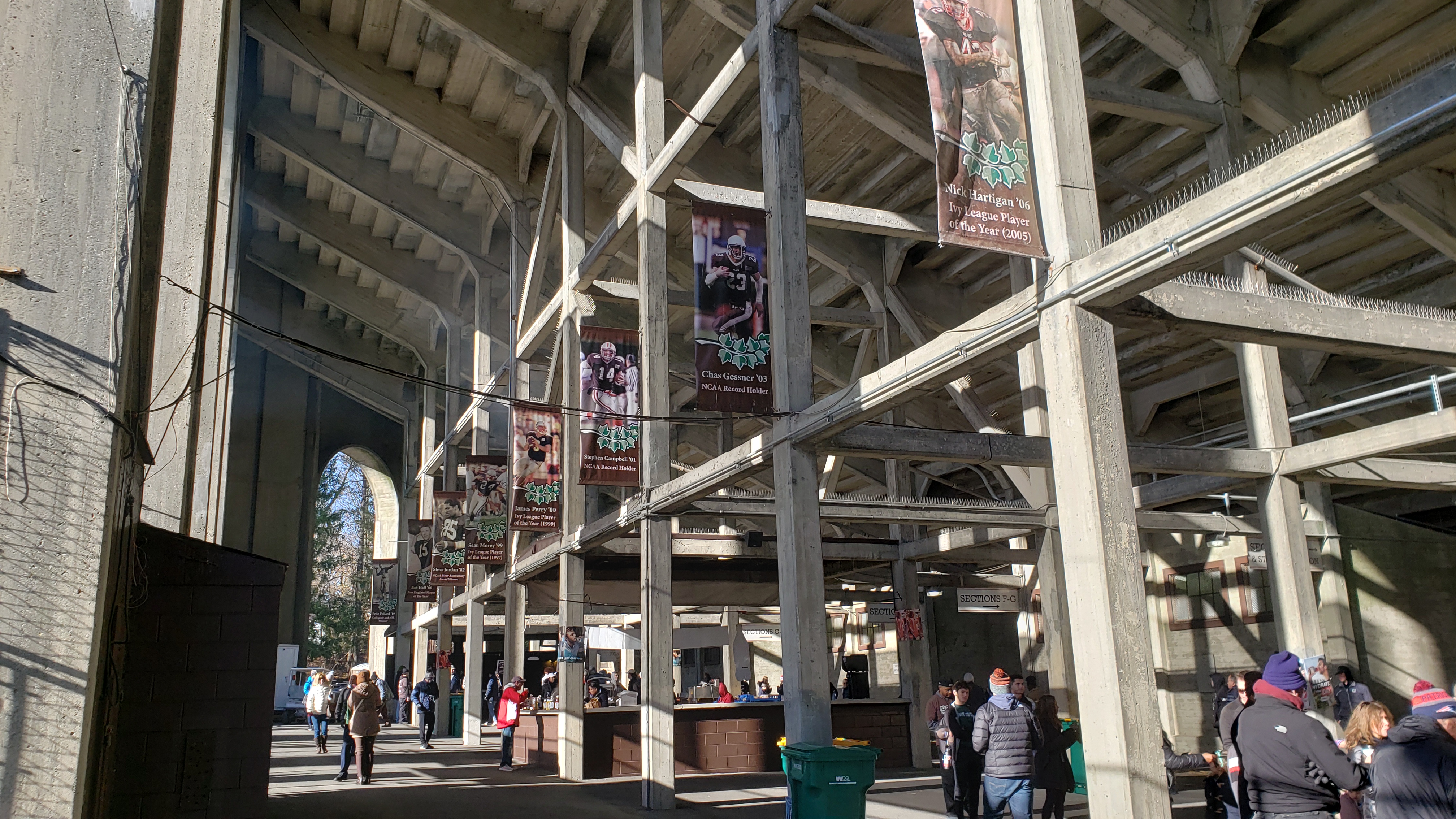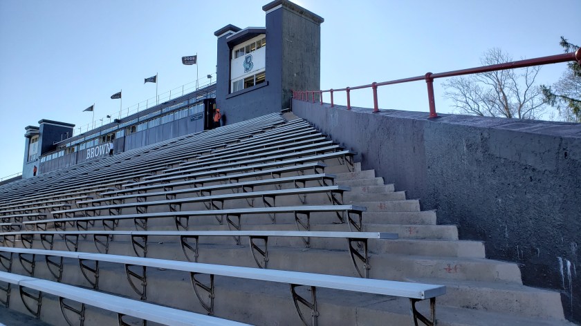 Brown Stadium is the only one in the Ivy League that has a natural grass surface…..There are no lights at Brown Stadium……I wasn’t a fan of the concourses and another reason for my dislike was how a few of the openings from the seating bowl didn’t lead to the concourse, but instead a locked door. One of those was for the Brown locker room, making for an odd sight as players exited and entered the field…..Supposedly the “DE – FENSE” chant began here in 1948?……Brown plays the University of Rhode Island each year and these two state rivals compete for the Governor’s Cup…..PA Announcer: Stop Shouting…..Why is it required that all Ivy League bands have to act like goofballs?……I almost got hit by a low-flying bird while walking to the stadium. Yup.