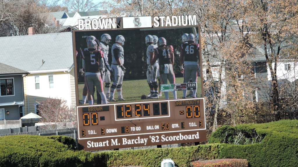 Only one end has a scoreboard and because of the track, it is set way back from the field. Overall it looks good with a brown base, top header saying “Brown Stadium” and a video screen that comprises most of the board. The problem is the screen is just too small and far away. Simulcasting the ESPN+ feed is great, but I could never make out the football during replays. The digital information at the bottom is adequate.