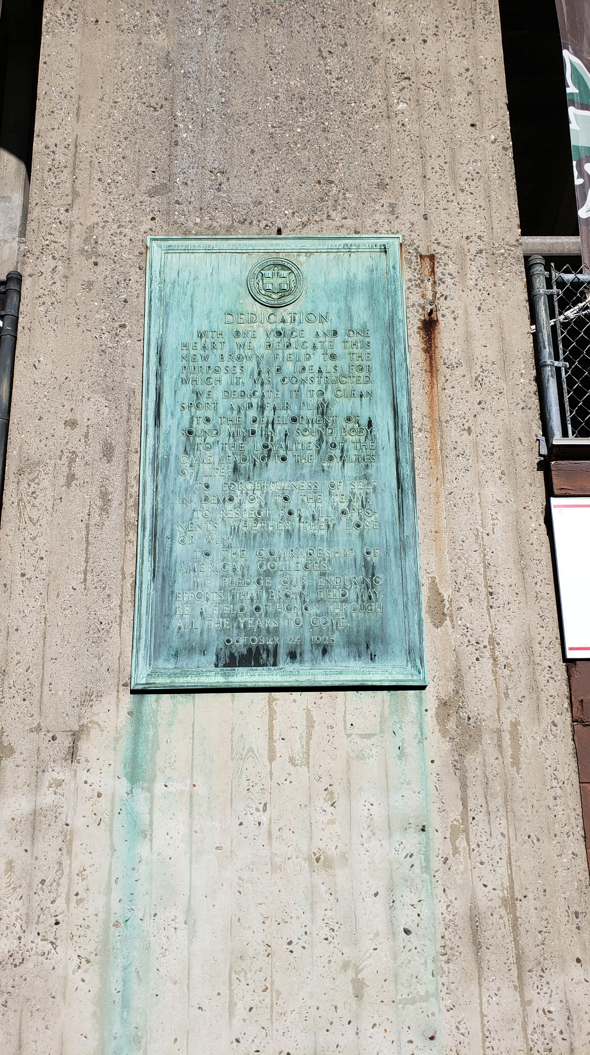 I like how the face of the exterior has some unique touches to Brown and how the banners provide a nice introduction to the program by listing the years of Ivy League Championships and those that won Player of the Year. More player banners hang in the concourse, though some descriptions are vague: “NCAA Record Holder”. What record do they hold? Ivy League Championship teams get more recognition inside as the flags for each title year fly above the main stands, while on the other side, visiting fans get to look at team pictures from those years. Perhaps my favorite display comes near the entrance, where a dedication plaque lovingly shows its age as it has rusted down to a sea green color. You can still read the inscription and the way sentences were written in the 1920s makes for a fascinating quick read.