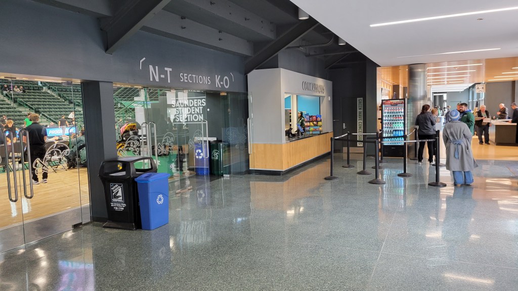 It’s only if you have a sharp eye in that you can tell this place has old bones. Everything else is modern and comes together for a really good basketball arena. Those older signs are just at the top of the arena as erector-set beams hide a brick wall and a wood-paneled roof. Down below is a basketball floor with extreme tight confines for seating as fans are remarkably close to the court. Each row goes up steeply making the sightlines even better. As for the design, it’s an elongated octagon shape and there are a few breakups of rows/sections by railings. Most side seats have a comfortable cushion. The ends though are bleacher-style and have a harder bench. Students sit all on one side (surprisingly not in front of the main camera) and one other random note, is be careful when exiting your row. Sometimes, there’s a step or two that can be easily tripped upon. In terms of luxury seating, there’s just a corner premium “room” where food and drinks are found as fans grab a counter top seat along the top walkway. Everything in the Devlin is a varying shade of green and that really sets some good character. Perhaps the most defining feature are the large windows that circle the arena at the top. If the sun becomes a distraction during day games, there are shades to shut it out.