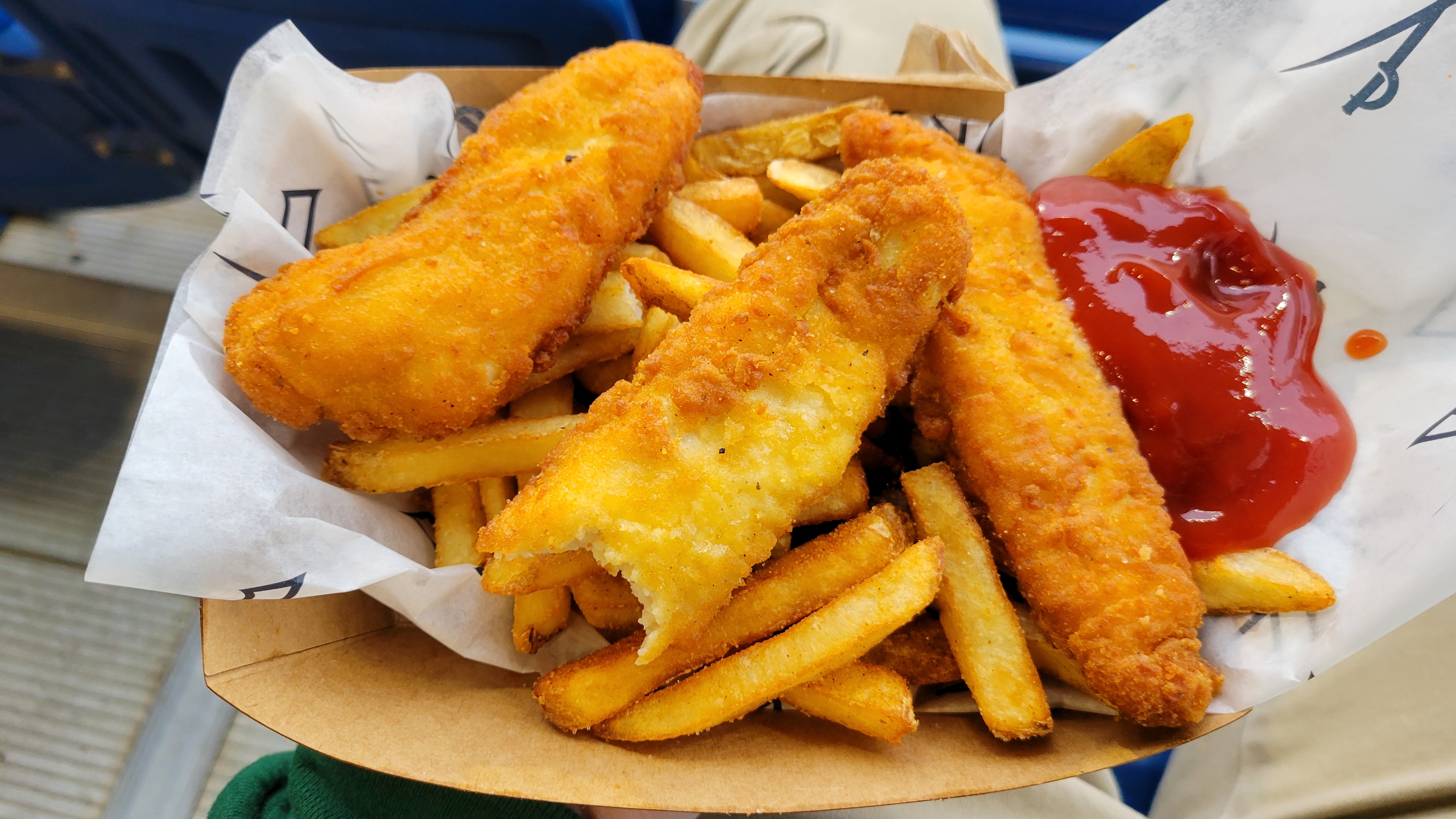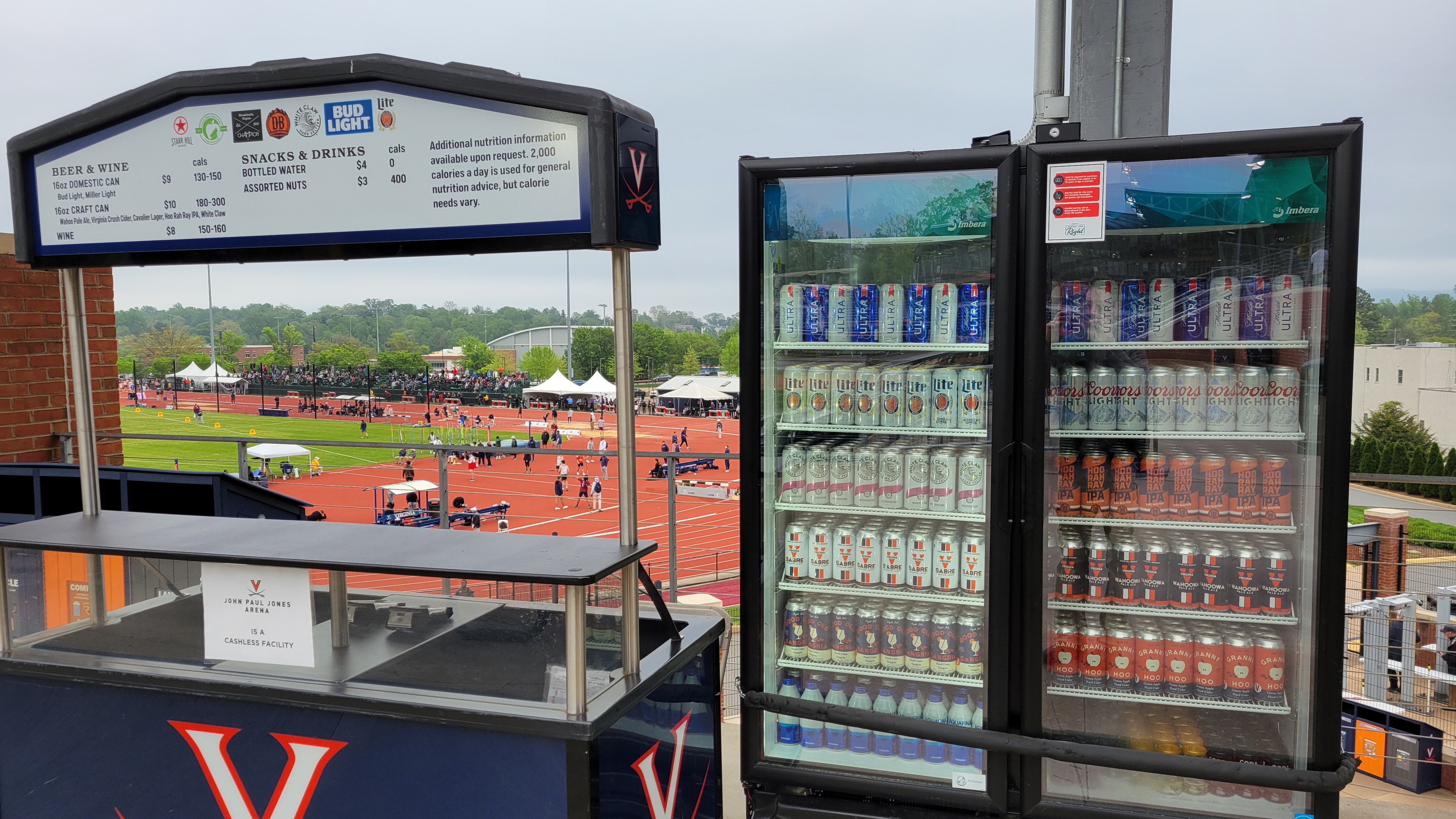 Varieties of hot dogs and burgers along with upscale looking concession stands make the menu seem better than it really is. There are still decent finds in here, including BBQ Mac and Cheese. Nothing truly appealed to me and I opted to fill up with the Chicken Tenders basket (but no Honey Mustard or BBQ sauce!). I will say the portable cart selling Nuts provided an intoxicating smell and the sight of Ben & Jerry’s made me struggle with picking one of eight flavors. Plus, every once in a while, there will be a Food Truck in attendance. The beer selection at The Dish is also enticing thanks to the vast array of Orange and Blue cans. Starr Hill Brewery has specialty team drinks including “Wahoowa Pale Ale” and “Sabre Lager”. Coyote Hole Ciderworks did the same thing with their “Granny Hoo” hard apple cider.