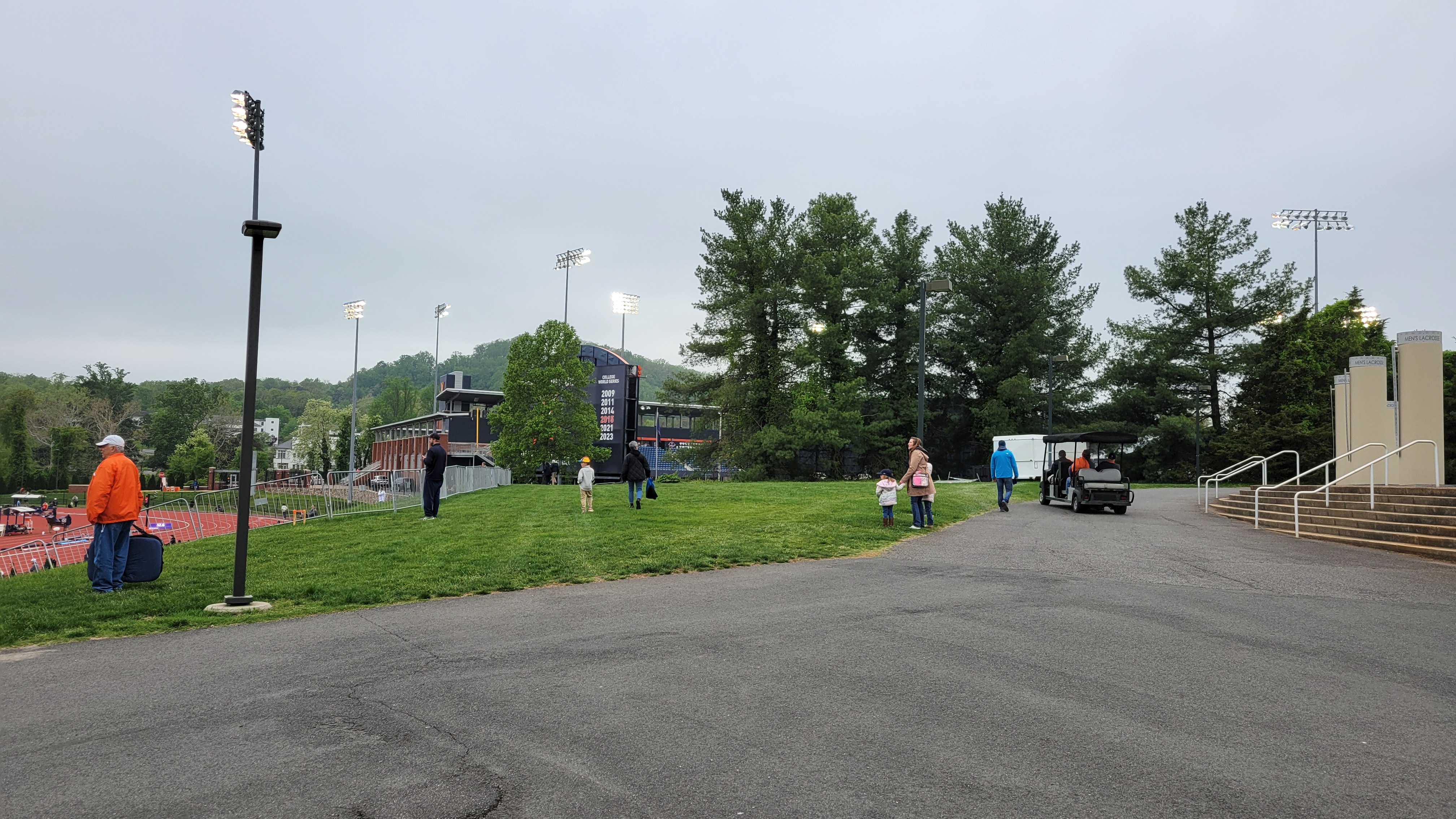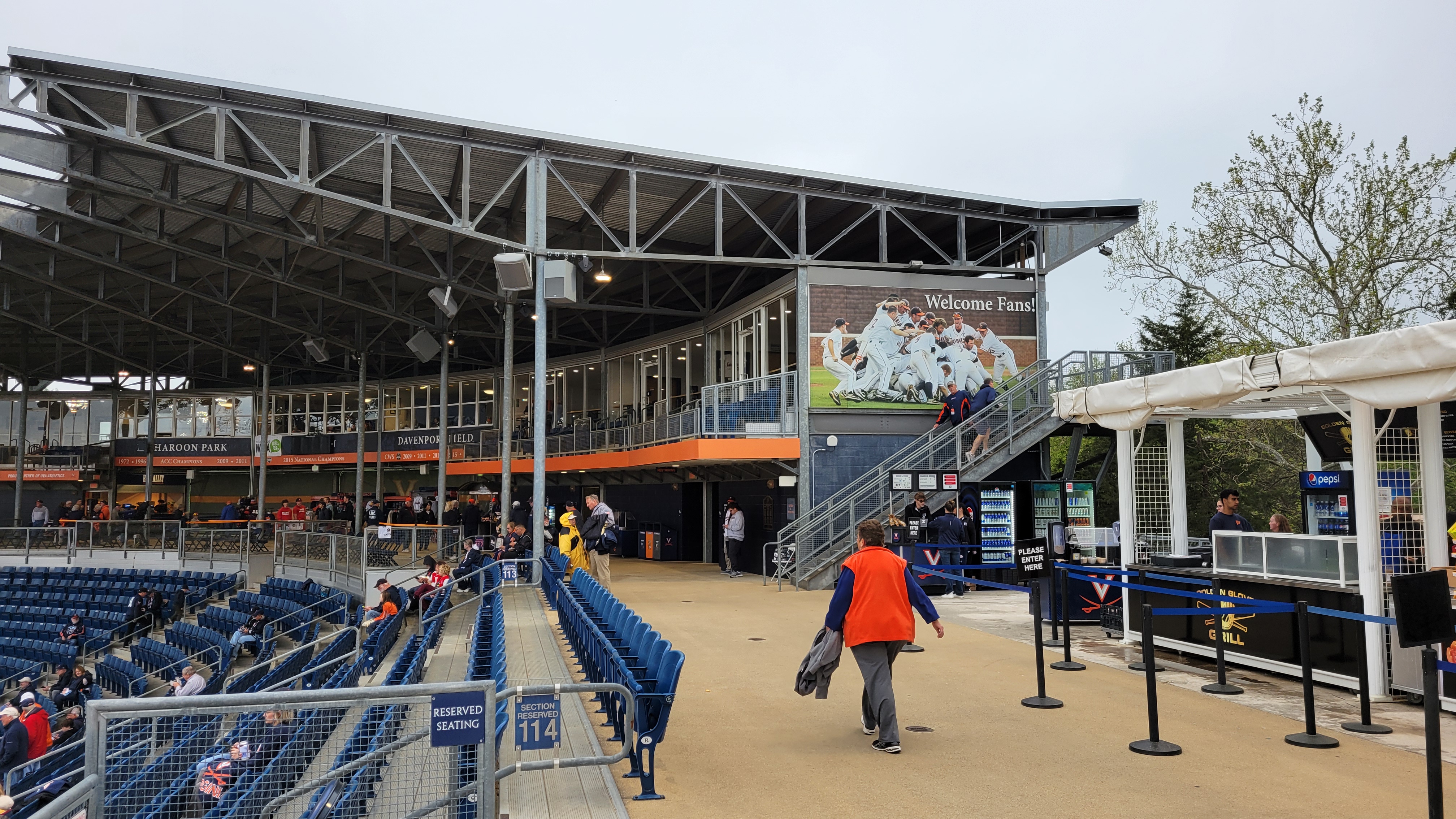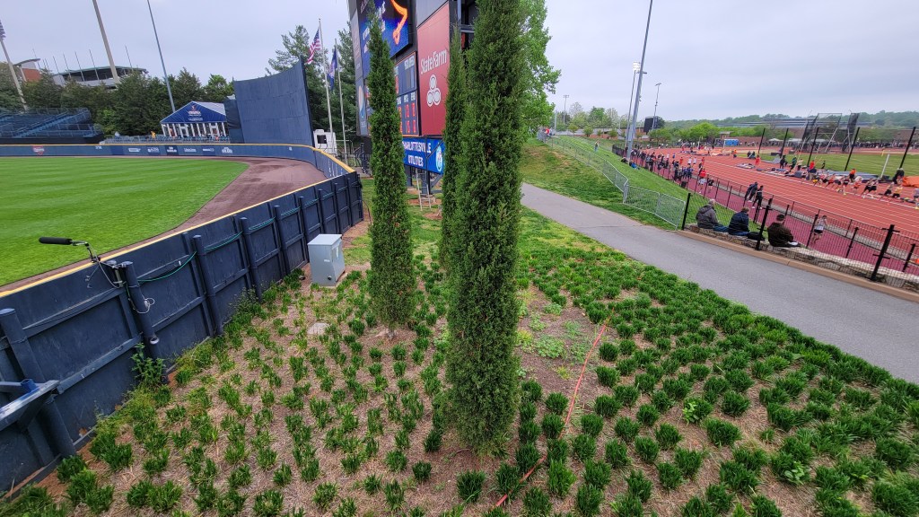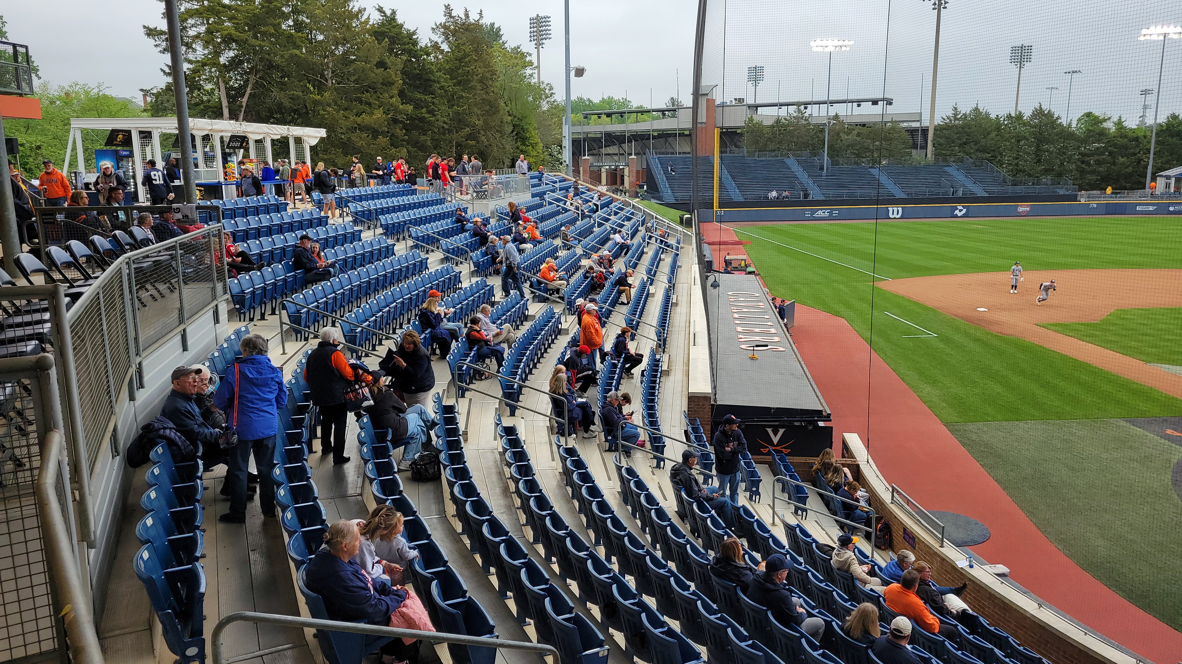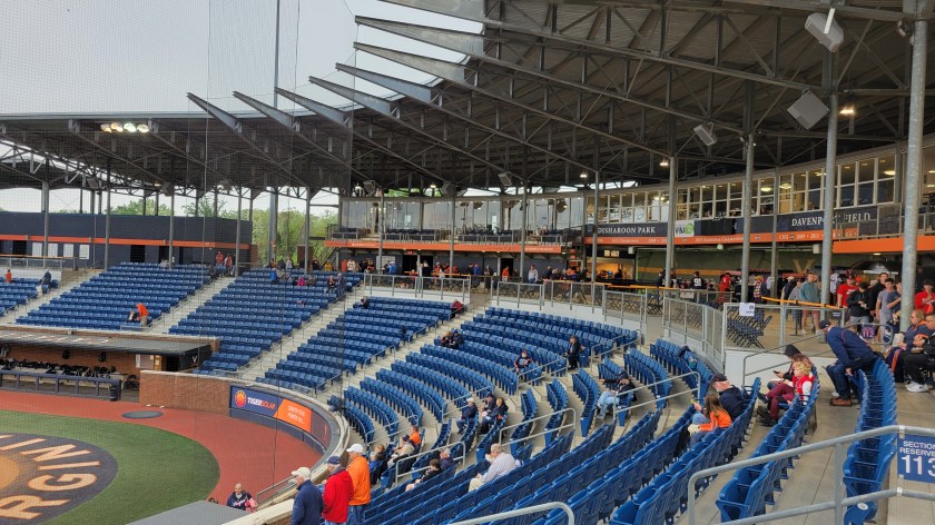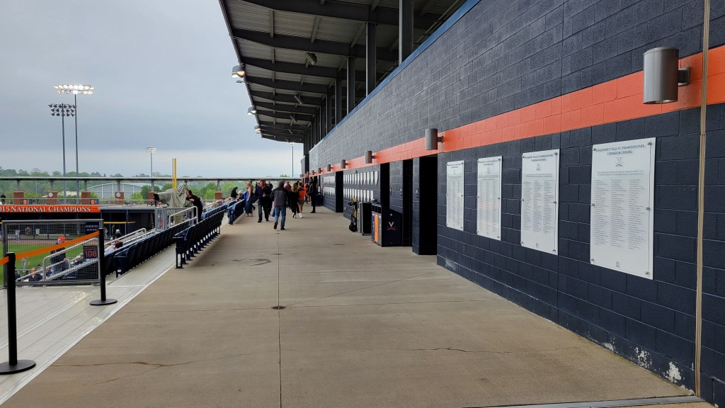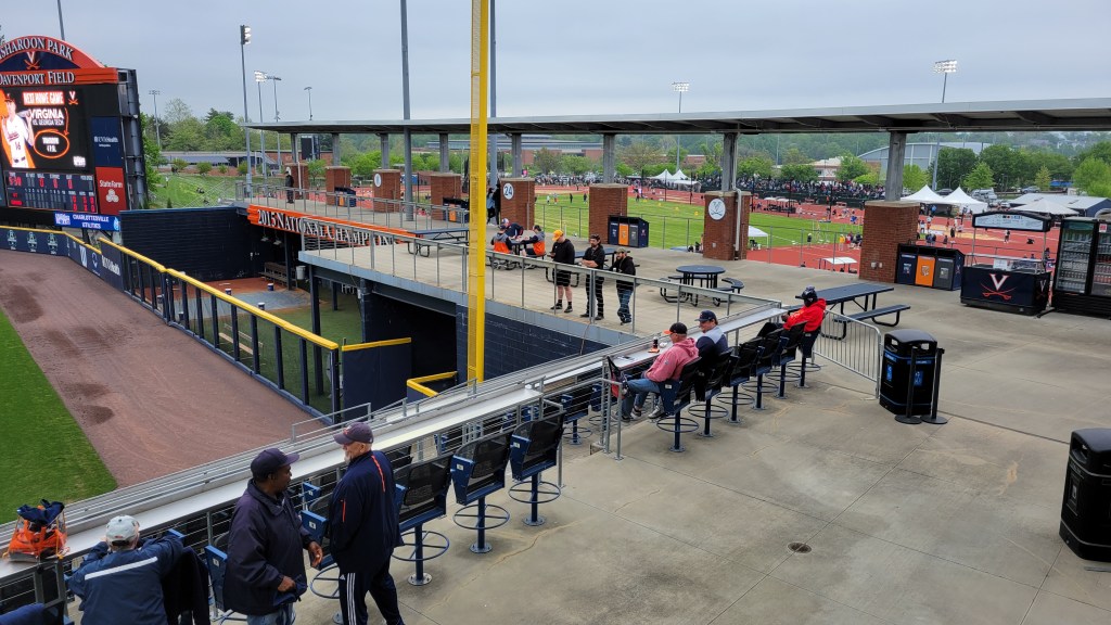 Besides the “Cavaliers”, UVA’s sports teams have the nickname “Hoos”. That is an abbreviation for “Wahoos”, a term Virginia players were given by an opposing team over a century ago…..The primary rival for the school is Virginia Tech…..Lawn chairs are allowed to be brought in and used along the side grassy slope…..Netting doesn’t extend down to cover the seating sections beyond the dugout and the older I get, the more I get concerned with a screaming foul ball into the stands.