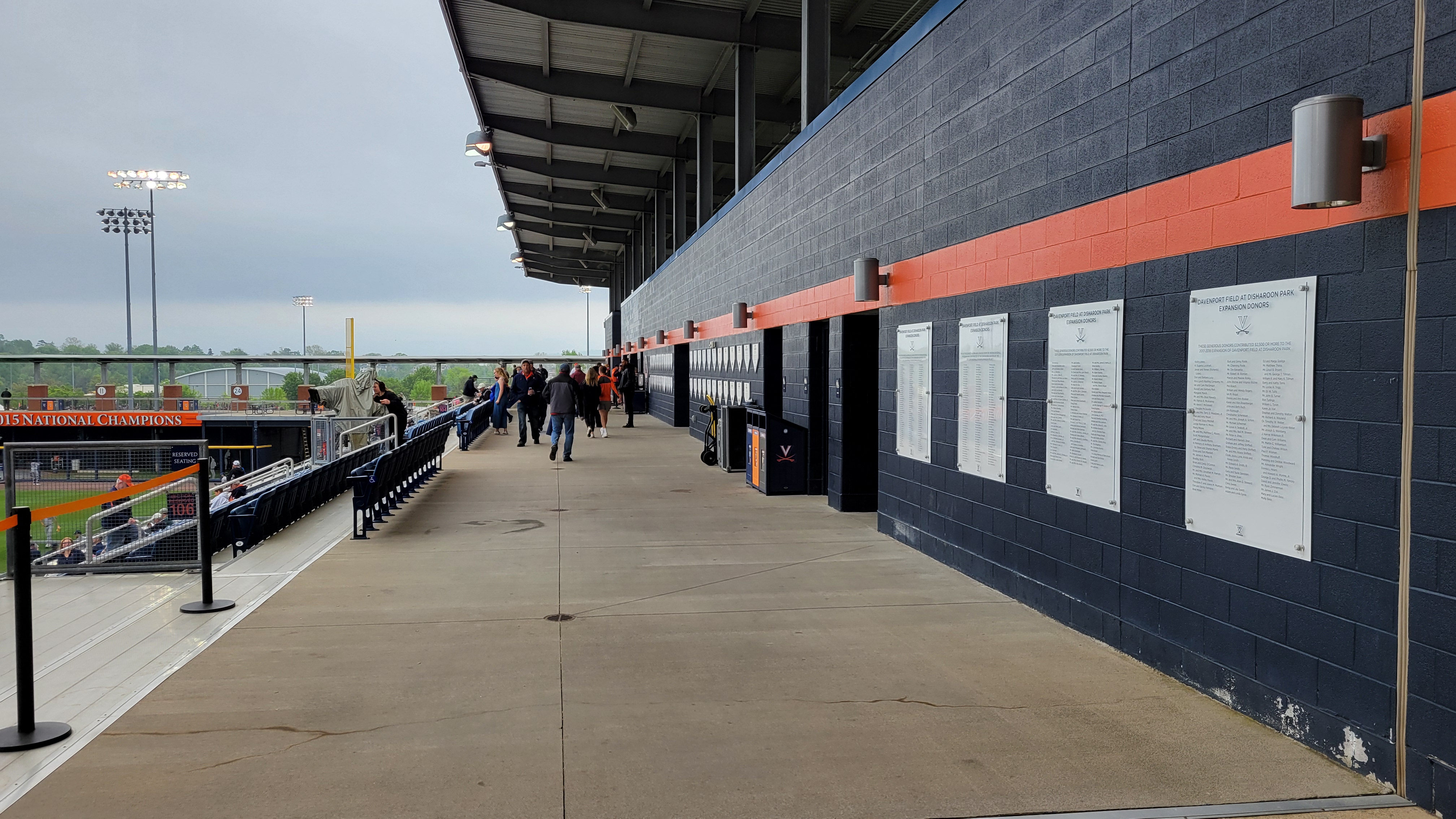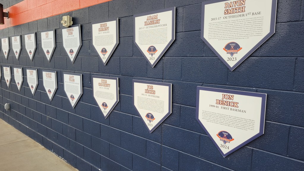 There will be a few places to see championships, CWS appearances and the numbers are complimented by a pair of dogpile pictures at the top end of the suite level. The blue and orange color scheme is great for character and I thought the honors of the team were eloquently displayed. A few plaques are around as well, separate from the Team Hall of Fame. Created in 2017, UVA has decorative home plates that feature detailed descriptions of each member.