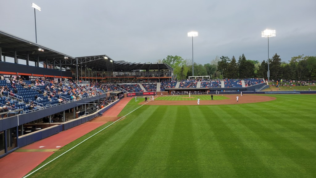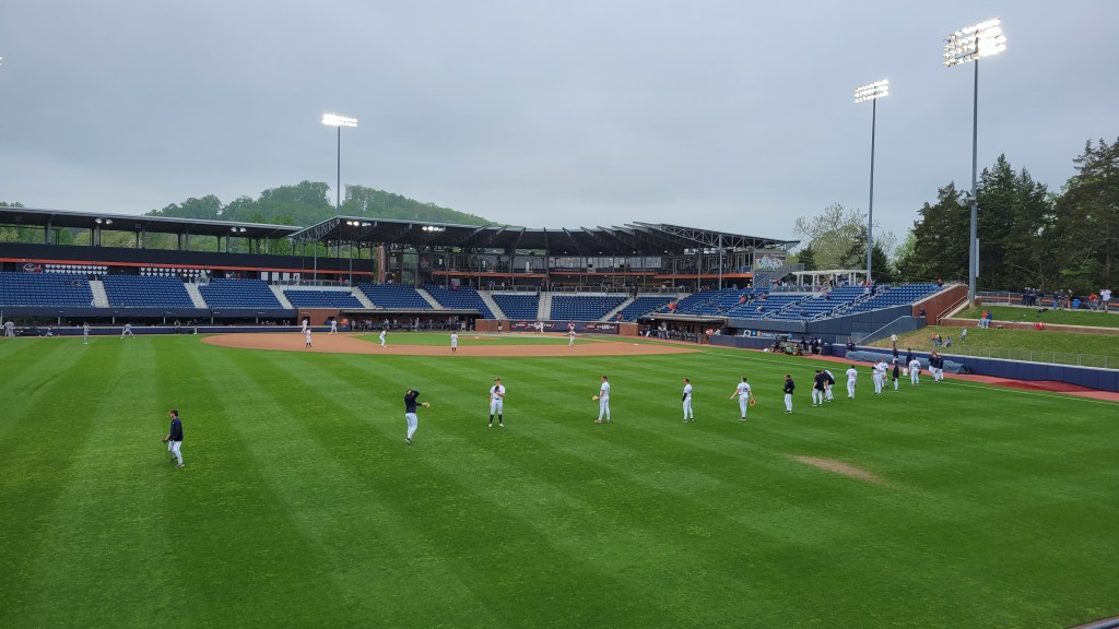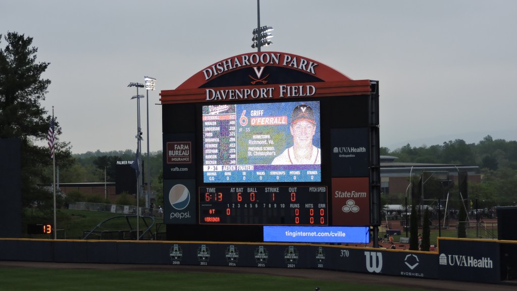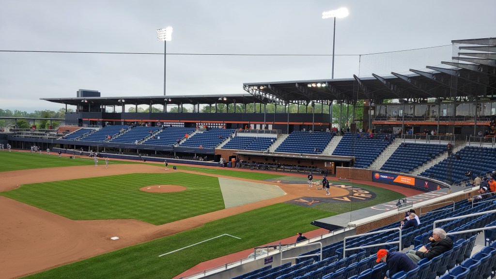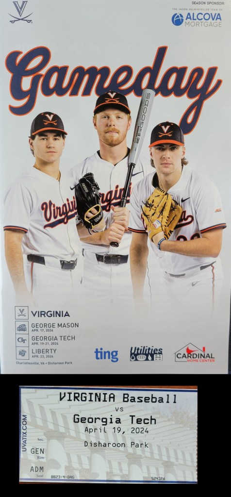 This was one of the more surprising contests that I’ve seen here at Stadium and Arena Visits. The potent UVA offense came in averaging over 10 runs per game, yet it was not until the 7th inning when they got on the board. In fact, they had 12 hits before seeing one of the Hoos cross the plate. Georgia Tech jumped all over the home side with a 6-run 2nd inning and then when the bats on the other side started coming alive late, the Jackets responded with another six runs in the 8th inning. They run-ruled Virginia as the 13-2 final came after 8 innings. Cam Jones had 4 RBI for GT and Aeden Finateri went 6 innings with 8 strikeouts.