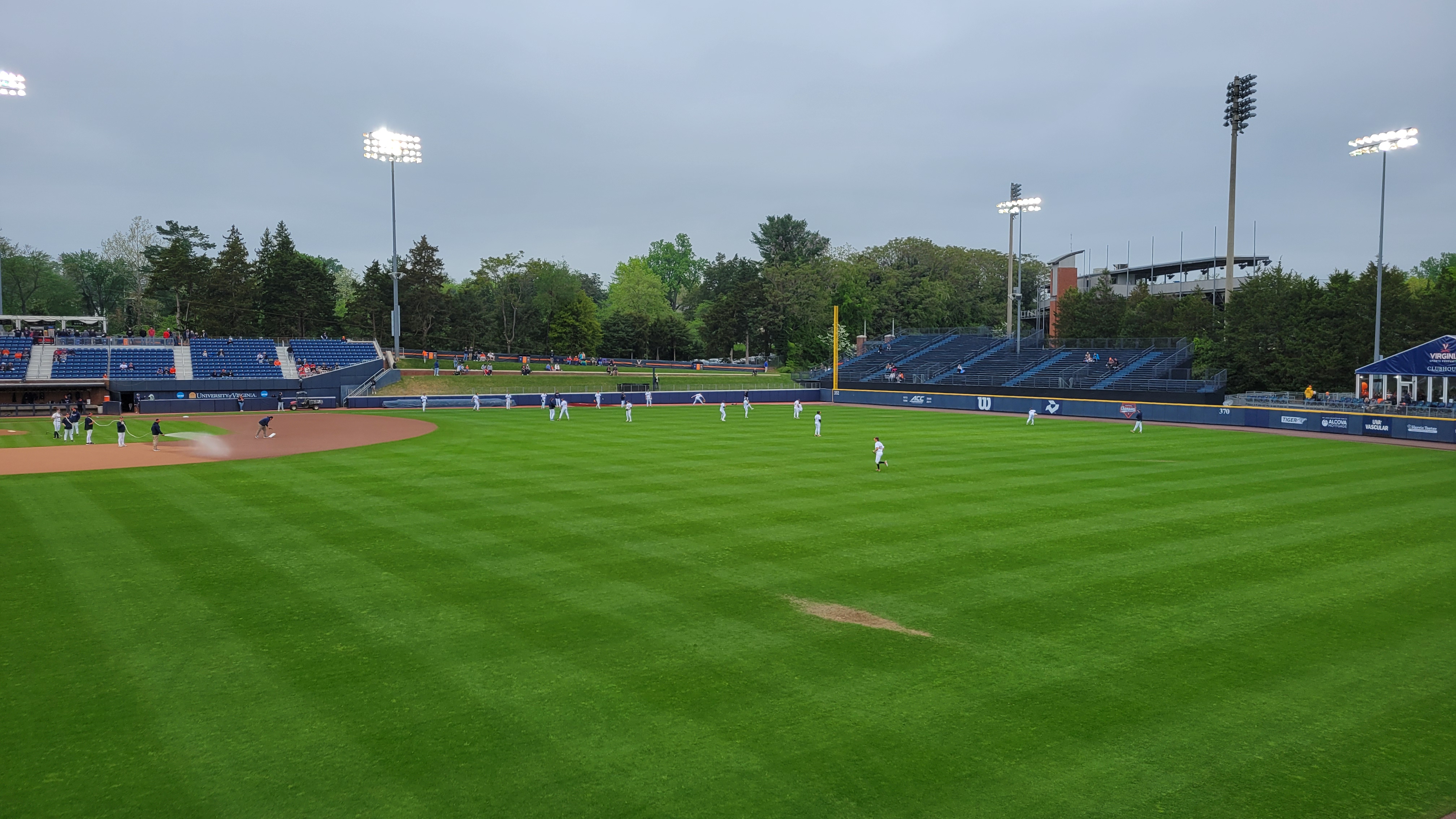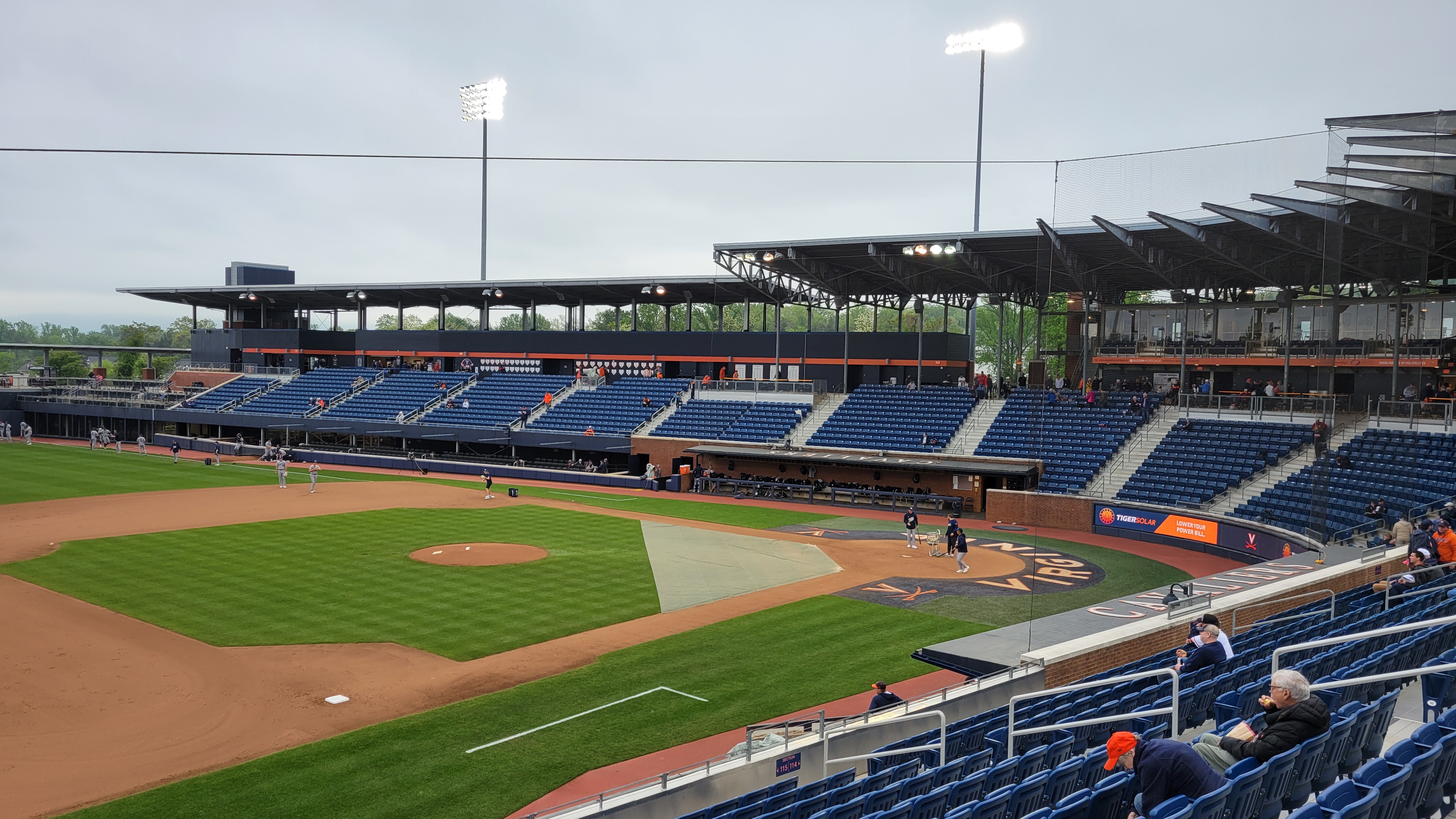 For a team and stadium of this caliber within the context of all college baseball, Virginia is where you would expect. Last season, they were 13th in NCAA attendance and 3rd within the ACC, which is typical of prior years. With that said, the turnout for the Friday Night game I attended wasn’t great. Yeah, the weather was cool, but a dry 60-degree evening in April is just fine for coming out to a game. Lots of empty rows as you can see below and I guesstimated a turnstile attendance of 1,500 at best (compared with a ridiculous announced number of 4,601) with student turnout non-existent. At least they were a dedicated group as many hung in ’til the end despite the lopsided score throughout much of the event. When UVA hosts a Regional, games are sold out as the Hoos play in front of a full house each game.