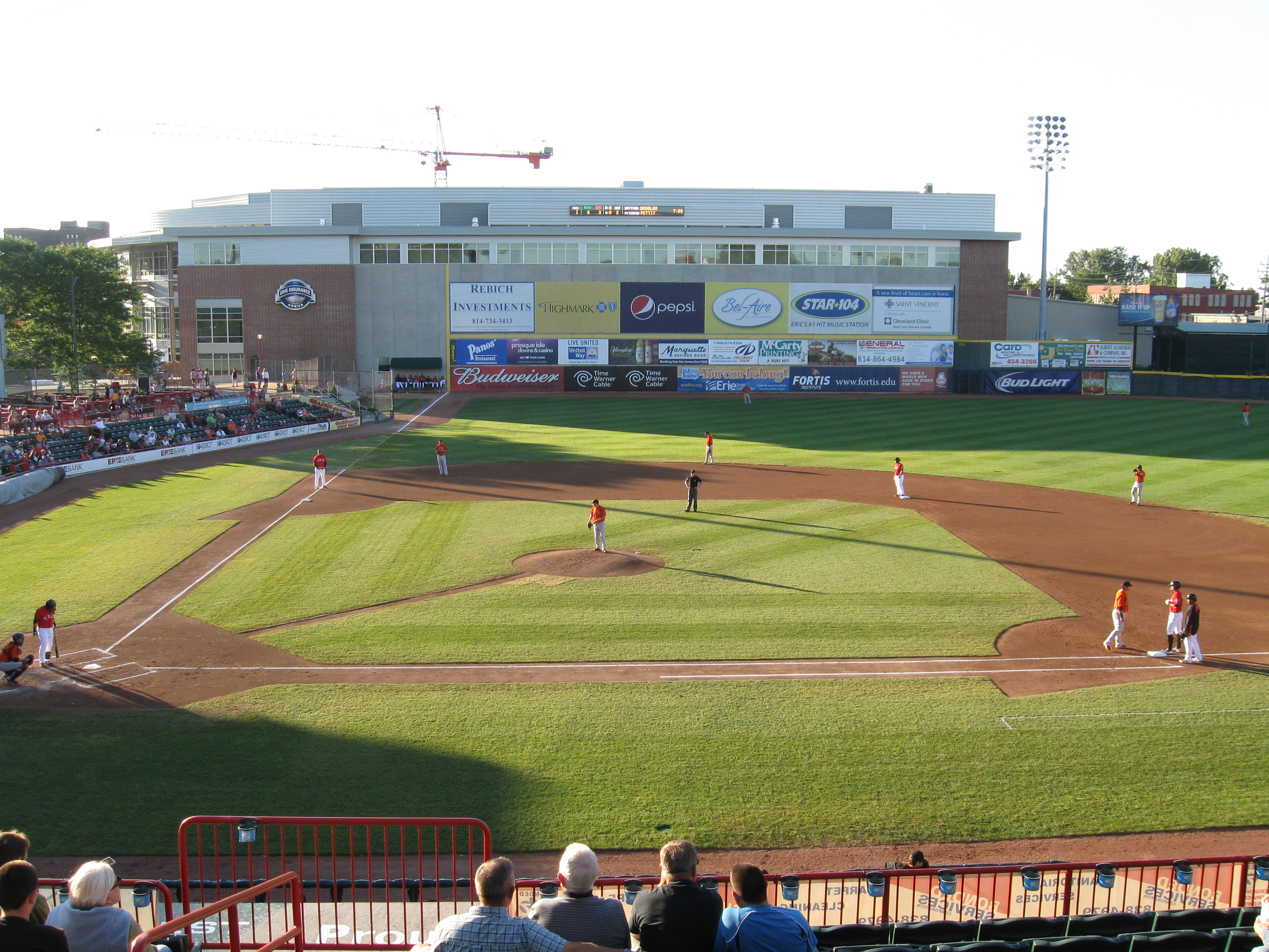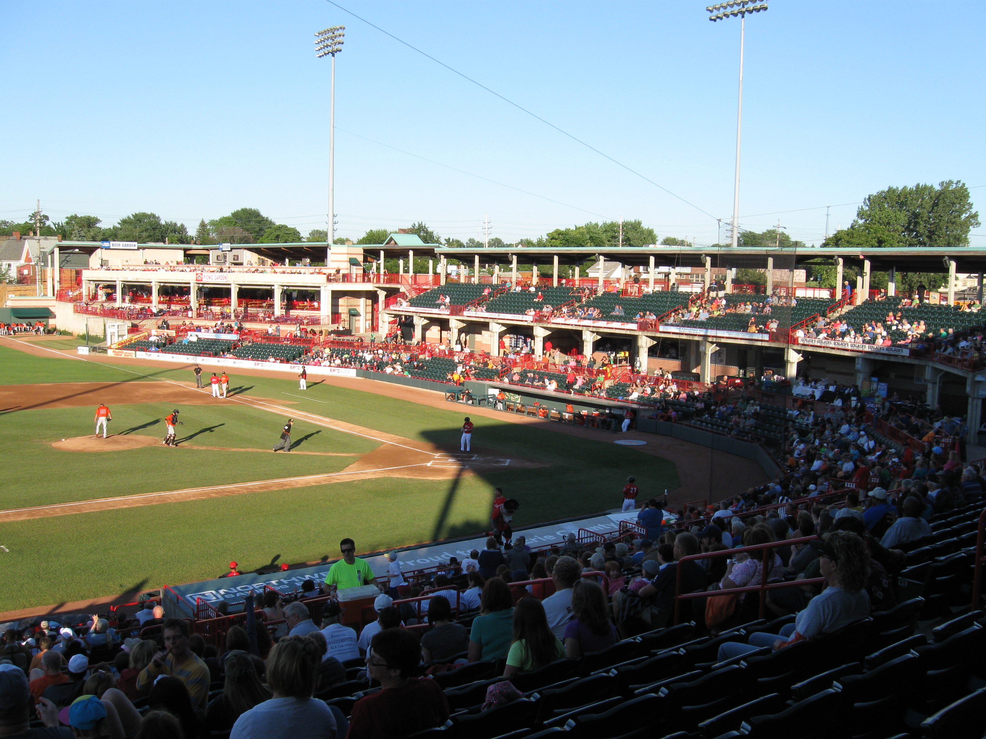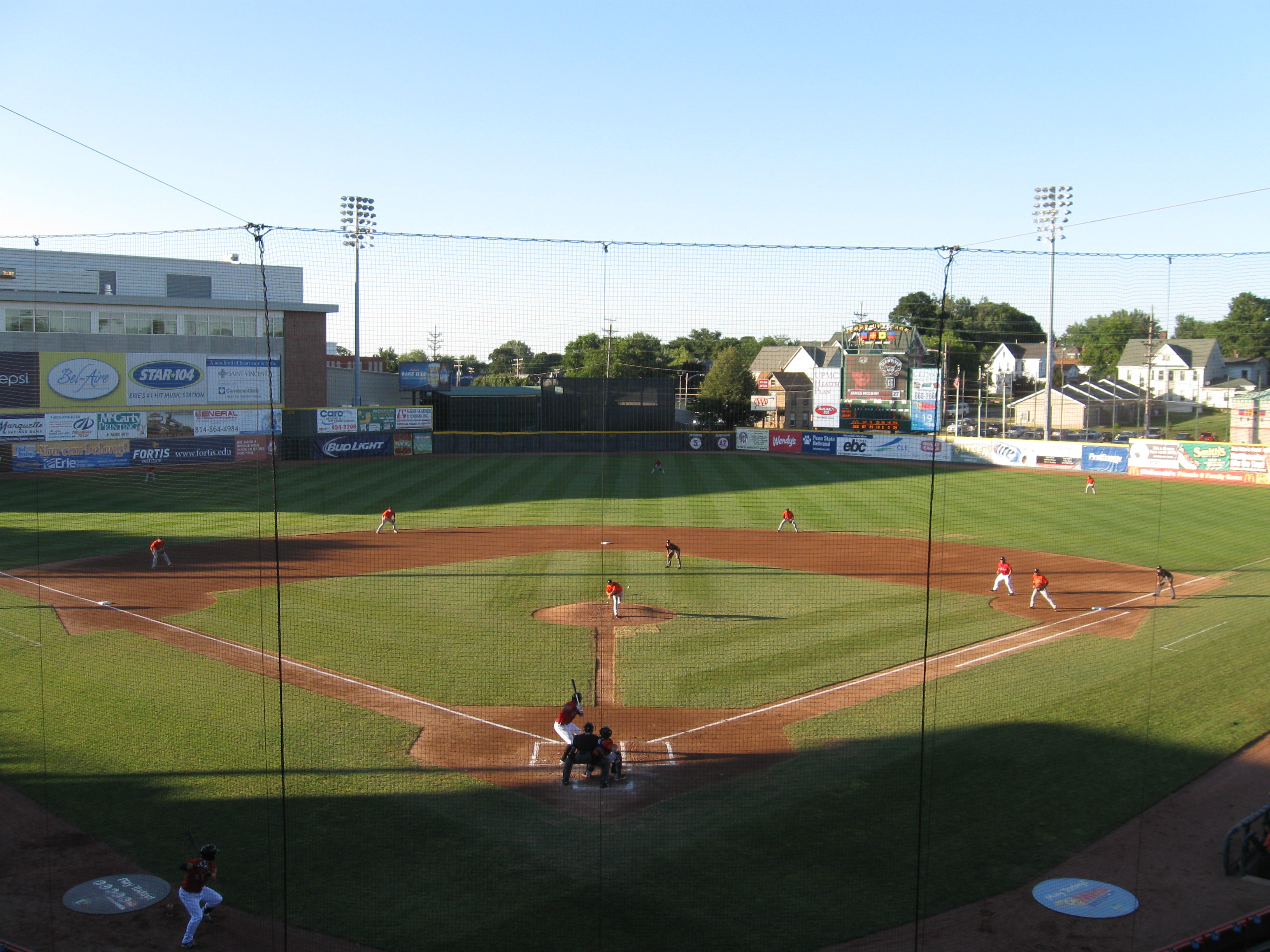 To add to the uniqueness of the ballpark is the outfield view. Dominating the scene beyond left field is the hockey arena, where many home runs carom off the wall. In fact, the yellow line is actually on the building! High-rise structures from downtown Erie remain in sight over the third base side, while on the opposite end beyond right field, there is more of a residential look as houses from a neighborhood can be seen beyond the fence. This is such a terrific park that should be applauded for standing out from all the other look-a-like stadiums in Minor League Baseball. Only the lack of outfield seating kept this from a perfect score.