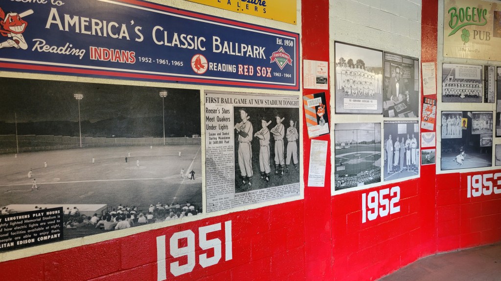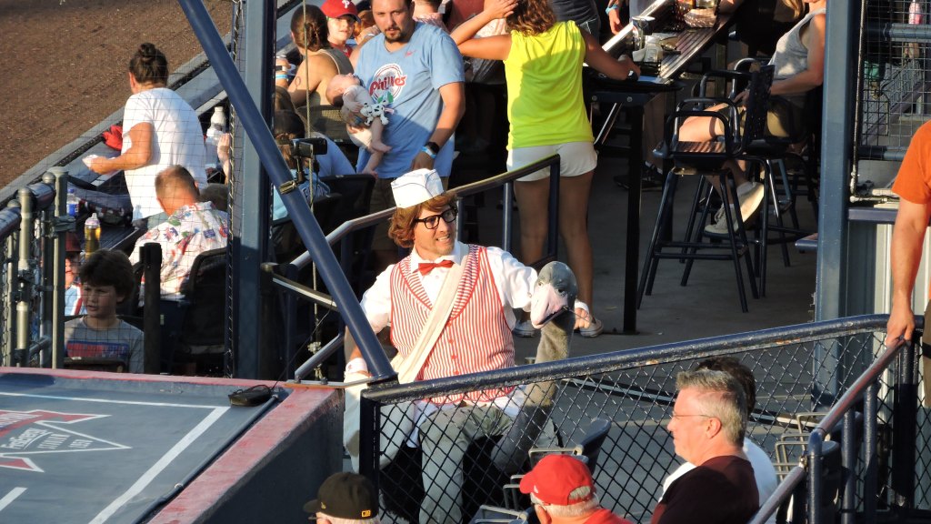 FirstEnergy Stadium is the Eastern League’s oldest ballpark by 34 years (soon to be 36 after Richmond’s is complete)…..The Crazy Hot Dog Vendor has been a fixture in the ballpark since 2004 and is something uniquely Reading. During a break in the second inning, the man dressed as an entertainer from the olden days, gets on his stuffed ostrich and runs around the park throwing out hot dogs to people. Fans love it and this is minor league baseball…..There isn’t just one mascot in Reading as a group of 5 parade around the ballpark. They even form their own band as “The Mascot Band” occasionally performs on the stage before the game…..Taylor Swift grew up in Wyomissing, a suburb of Reading. She performed the national anthem at the ballpark a few times during her youth…..There have been plenty of renovations in Reading and the most recent one that I saw completed in 2024 (Event Center and Videoboard) came in at a steep price tag of $45 million…..Credit to the team for the Knothole Gang, a row of red seats at the top of the stadium reserved for free to a deserving charitable or non-profit organization each game.