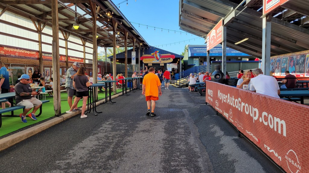 There is basically a block party before the game as gates open 2 hours before first pitch, allowing fans to enjoy the festivities in the Plaza. This area behind the first base side features a stage, which often has both pre and post-game concerts. There are many tables in this space and there’s a bar as well with long counter seating. Besides food stands, kids will find plenty of games at the end of the plaza as things get a little more cramped. Heading back under the main grandstand is an enclosed concourse that is very small. At least it is colorful and well-decorated with Reading memorabilia and once you come out on either side, space opens up. More behind third base and left field with a wide assortment of picnic spots and bar seating. Navigating can be chaotic at times, but at least the whole concourse is festive.