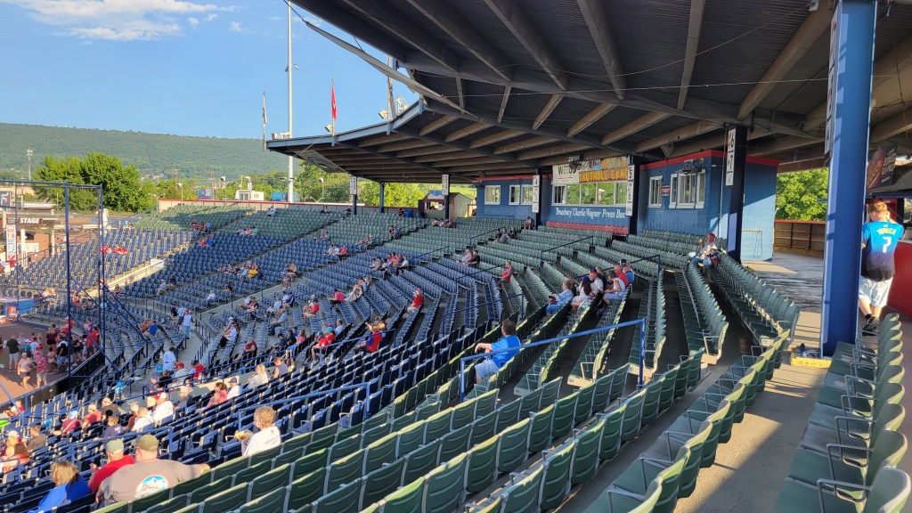 There is a lot going on inside the stadium too as this is not exactly a serene, historic park. Reading’s stadium has morphed into a baseball/entertainment mix that casually still features an old-school grandstand. That main seating area dates back to 1951 and it is one large section wrapped around home plate with an unmemorable roof hanging over some seats. The chairs are of a much older style as they don’t fold down and even though the rows look narrow, leg room isn’t as bad as I initially feared. Each row goes up at a gentle incline and back rows are further from the field than you would expect. Seats starting at ground level do not help sightlines, nor does the protective netting that features multiple obstructing poles. There used to be a colorful arrangement of blue, yellow and red seats, but these changed to a calmer blue/green combination when I visited in 2024. Between the roof and seats is just a press box (no suites), while at the bottom after a couple rows near the field, there is a small walkway. Surrounding the rest of the ballpark is a mish-mash of sections that include bleachers, party decks and picnic areas. The bleachers date back awhile and they are terrible as their location and position makes for just a poor seat in general (especially on the first base side where the sun is blaring). Seating in the outfield consists of a terraced approach in left field, accompanied by a bar. Meanwhile, in right field is a swimming pool and another picnic deck area. Centerfield is taken up by an Event Center that opened in 2024. This looks like is a natural fit in the stadium as the design is integrated seamlessly. The versatile venue also features group seating, as well as upgraded team facilities. The view beyond the bowl offers some serenity beyond the craziness as the rolling hills of Berks County flow in the distance.