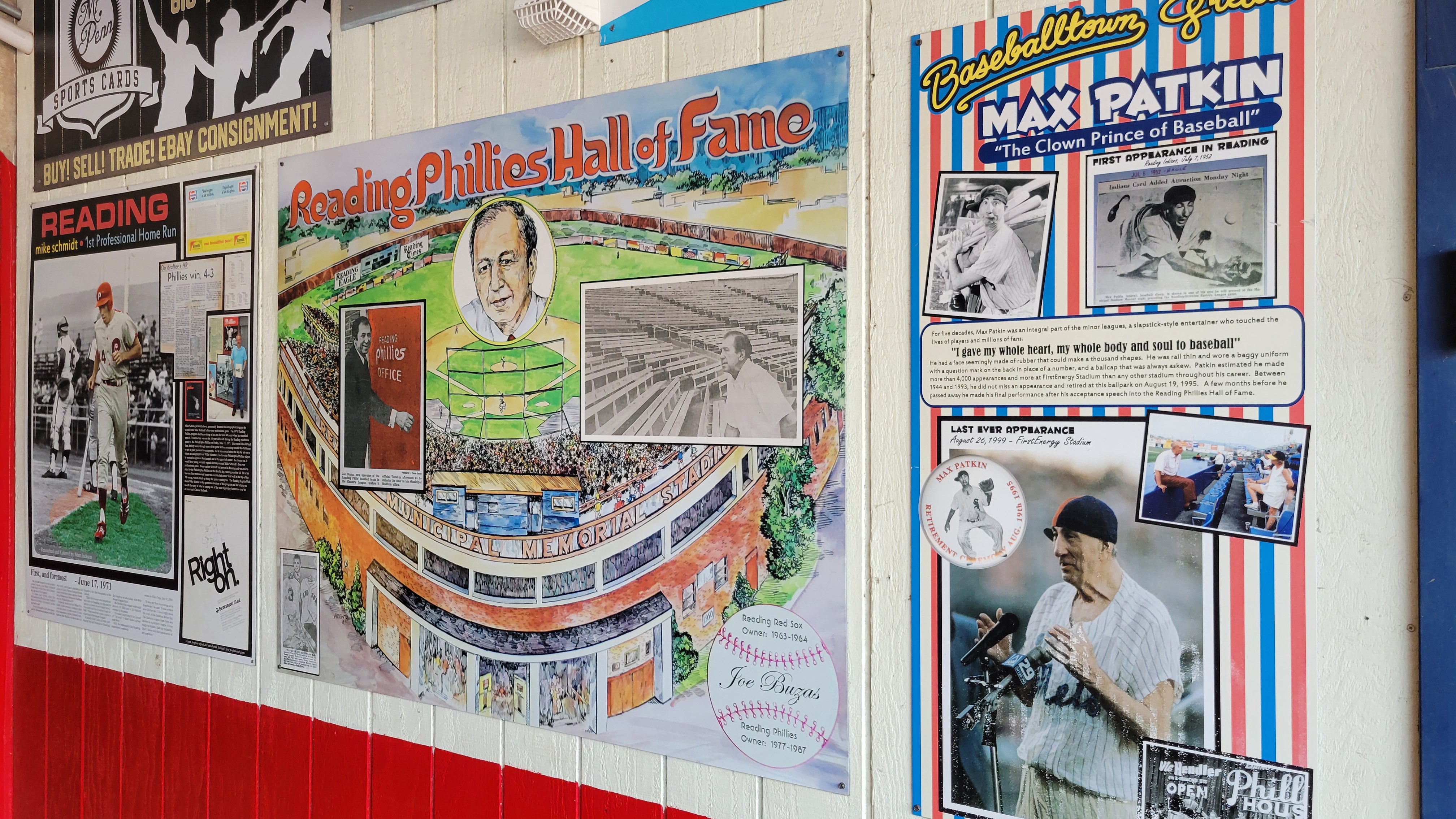 Reading has not forgot the original name of this stadium, “Reading Municipal Memorial Stadium”. Community veterans continue to be honored appropriately as evidenced by the Pow-Mia flag flying outside the ballpark and the dog tag statue dedicated to all the veterans. Each game, a ceremonial flag is flown to honor a specific veteran. In terms of team honors, Reading does a fantastic job of that as the entire ballpark pays homage to 70+ years of baseball. Team Hall of Fame honorees get a brick on the entry plaza, along with a baseball card on a wall display. Further in, the concourse has an incredible array of posters featuring historical team pictures and details on prior championships, unique events and early timelines. I spent 30 minutes wondering through here and this is the stuff that I love to see. Memorabilia is presented in a case at the end of the concourse, nearby a listing of State Championship winners in baseball from Berks County. Beyond the outfield wall is a retired name and number for 5 former players.