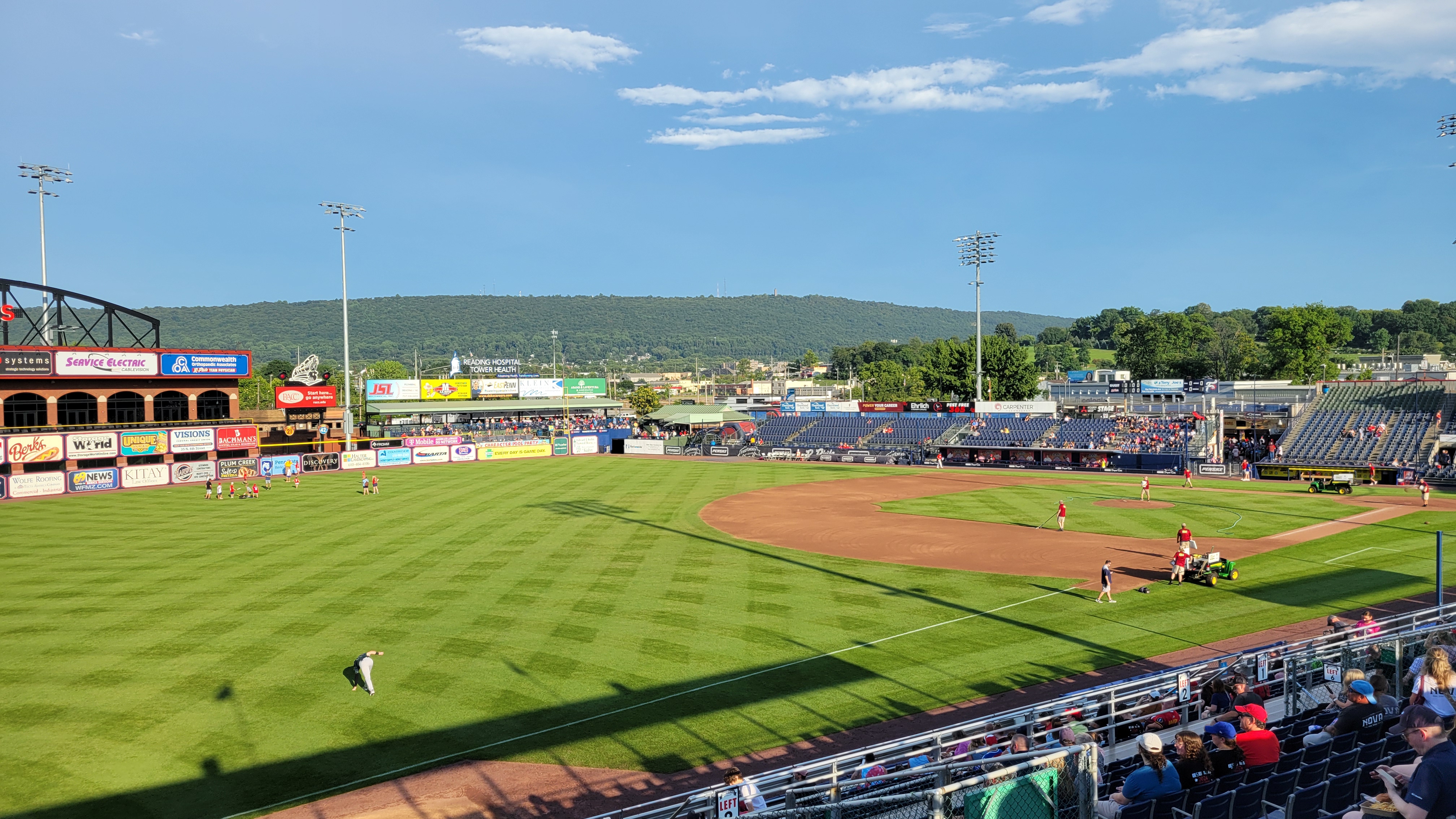FirstEnergy Stadium is the Eastern League’s oldest ballpark by 34 years (soon to be 36 after Richmond’s is complete)…..The Crazy Hot Dog Vendor has been a fixture in the ballpark since 2004 and is something uniquely Reading. During a break in the second inning, the man dressed as an entertainer from the olden days, gets on his stuffed ostrich and runs around the park throwing out hot dogs to people. Fans love it and this is minor league baseball…..There isn’t just one mascot in Reading as a group of 5 parade around the ballpark. They even form their own band as “The Mascot Band” occasionally performs on the stage before the game…..Taylor Swift grew up in Wyomissing, a suburb of Reading. She performed the national anthem at the ballpark a few times during her youth…..There have been plenty of renovations in Reading and the most recent one that I saw completed in 2024 (Event Center and Videoboard) came in at a steep price tag of $45 million…..Credit to the team for the Knothole Gang, a row of red seats at the top of the stadium reserved for free to a deserving charitable or non-profit organization each game.
